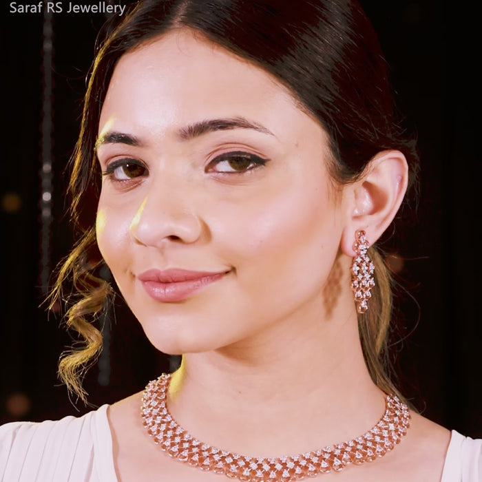 Product Type: Necklace Earrings Jewellery Set Design: Unique, Luxe Dropdown Material: Brass Plating: Rose Gold Plated Stone Type: American Diamond Stone Color: White Necklace Type: Statement Necklace Earrings Type: Matching Dropdown Earrings Closure: Lobster Clasp Occasion: Party, Cocktail, Evening Wear, Festive, Wedding Style: Luxe, Glam, Contemporary Package Contains: 1 Necklace, 1 Pair of Earrings