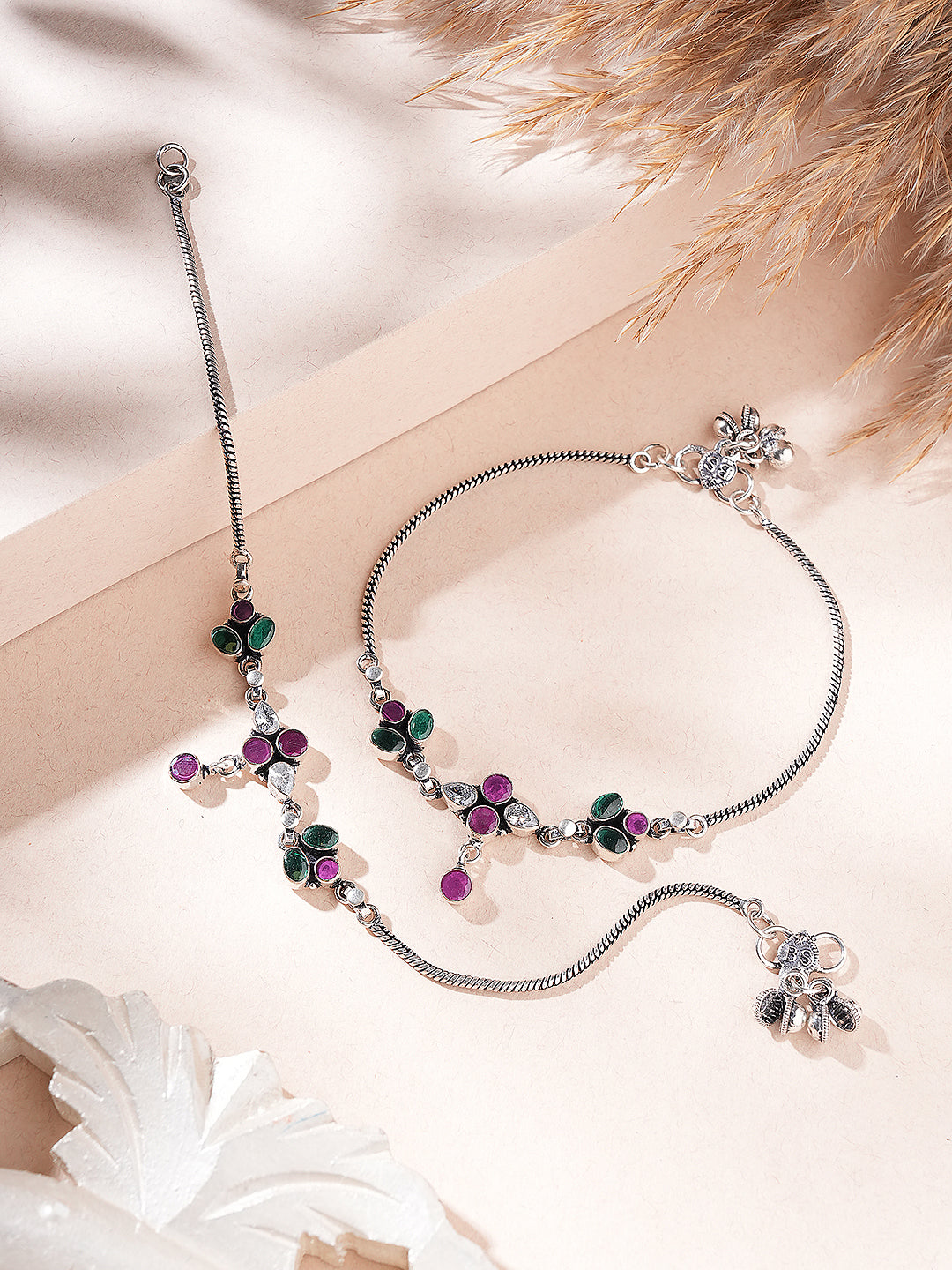 Product Type: Anklet Design: Floral charm with dual-tone crystal accents Material: Brass Plating : Silver Toned Stone Type: White Stones Stone Color: Green & Pink crystal stones Anklet Type: Charm Anklet Closure: Adjustable Hook Occasion: Casual, Party, Festive, Daily Wear Style: Minimal, Contemporary, Elegant Package Contains: 1 Pair of Anklets