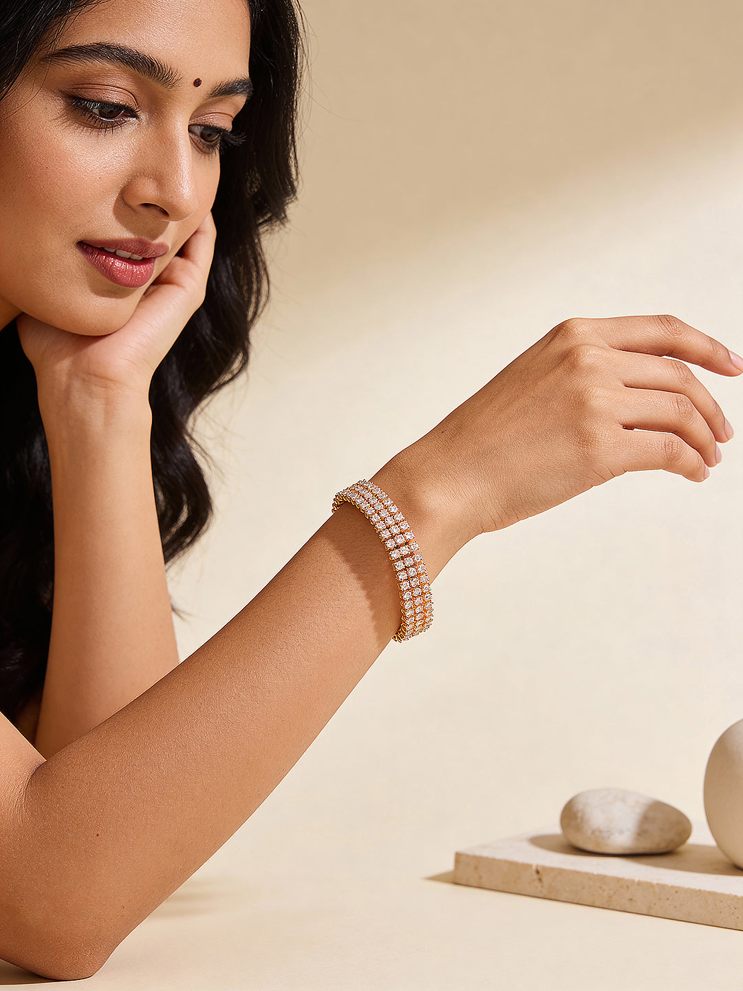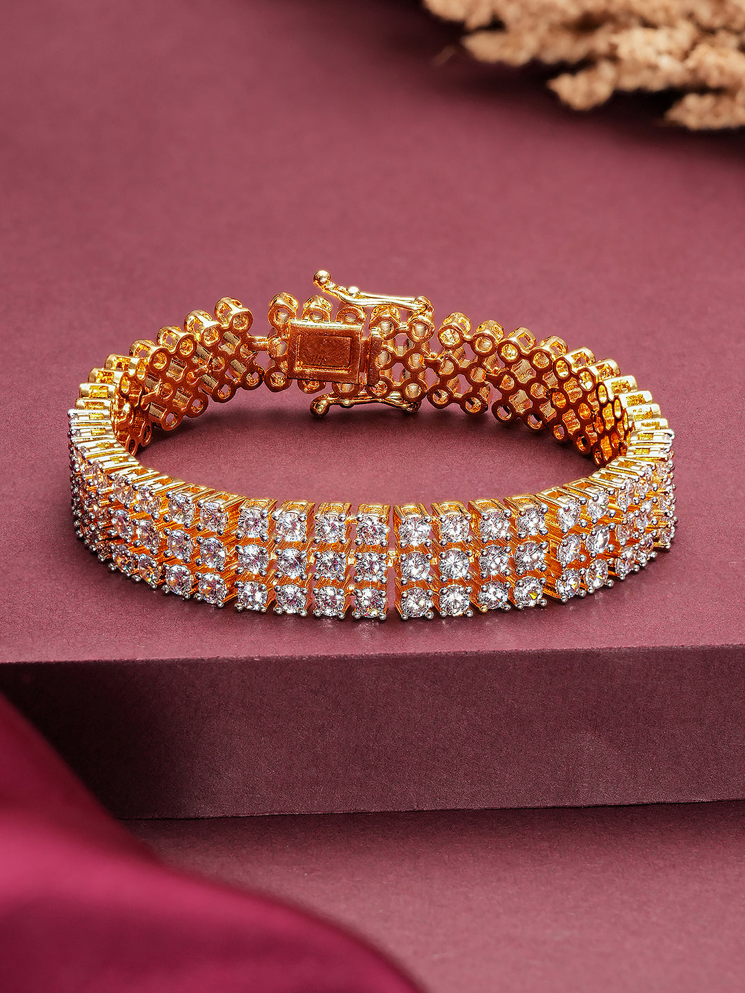 Product Type: Wraparound Bracelet Design: Trendy Material: Brass Plating : Gold Plated Stone Type: AD (American Diamond) Stone Color: White Bracelet Type: Wraparound Occasion: Party, Casual, Festive, Wedding, Daily Wear Style: Trendy, Contemporary, Statement Package Contains: 1 Tennis Bracelet