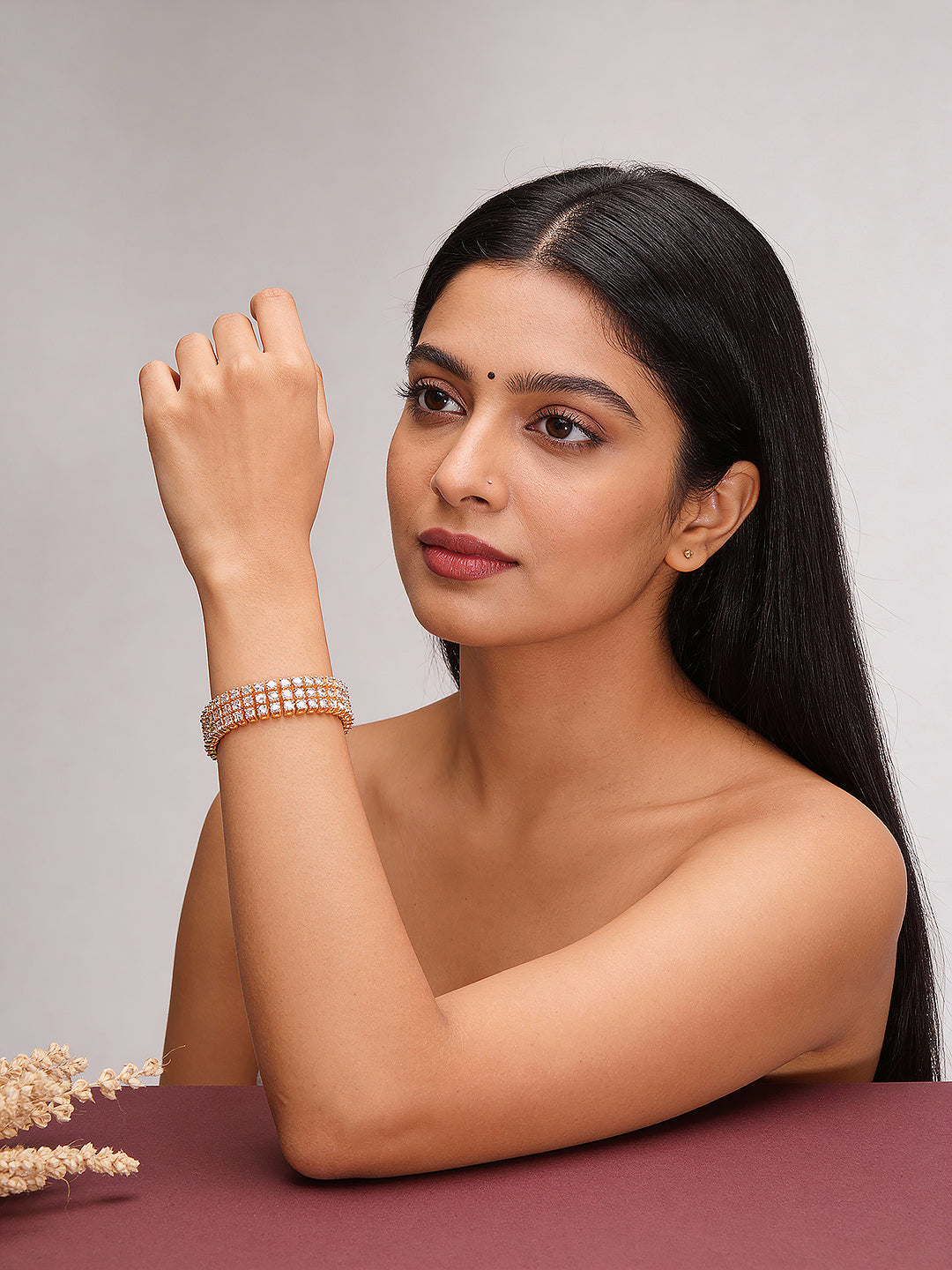 Featuring a sleek gold-plated finish and sparkling AD zircon stones, this bracelet wraps elegantly around the wrist for a modern and chic look. Perfect for parties, festive occasions, weddings, or casual styling, its trendy design adds sophistication and shimmer to any outfit.