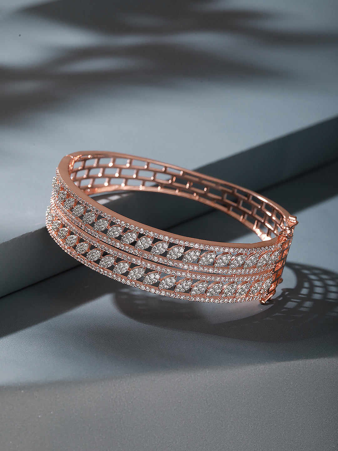 Product Type: Kada Bracelet Design: Designer, Contemporary Material: Brass Plating : Rose Gold Plated Stone Type: AD (American Diamond) Zircon Stone Color: White Bracelet Type: Openable Occasion: Party, Wedding, Festive, Casual, Ethnic & Fusion Wear Style: Designer, Elegant, Statement Package Contains: 1 Kada Bracelet