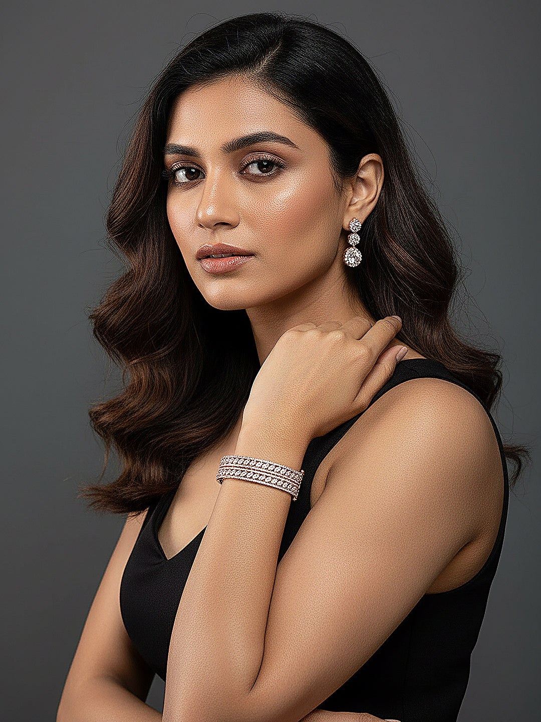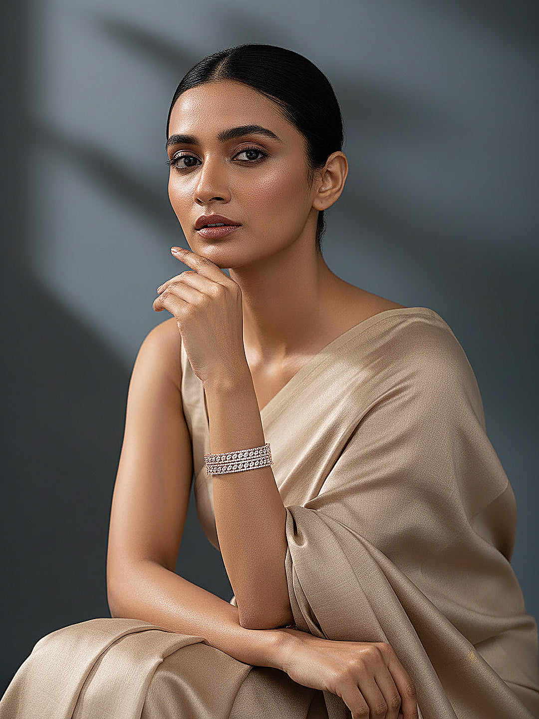 Designed with a luxurious rose gold-plated finish and embellished with sparkling white AD zirconia stones, this bangle exudes timeless elegance and sophistication. Its statement design adds a rich, glamorous touch to your bridal and festive ensembles, making it perfect for weddings, engagements, and special celebrations.