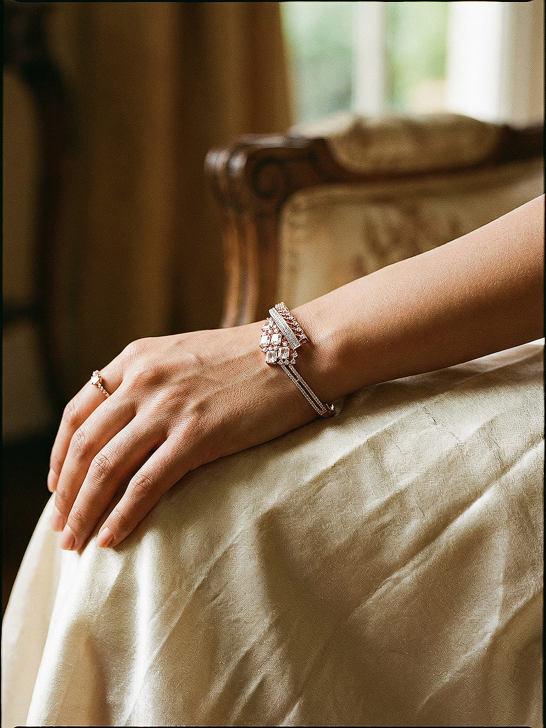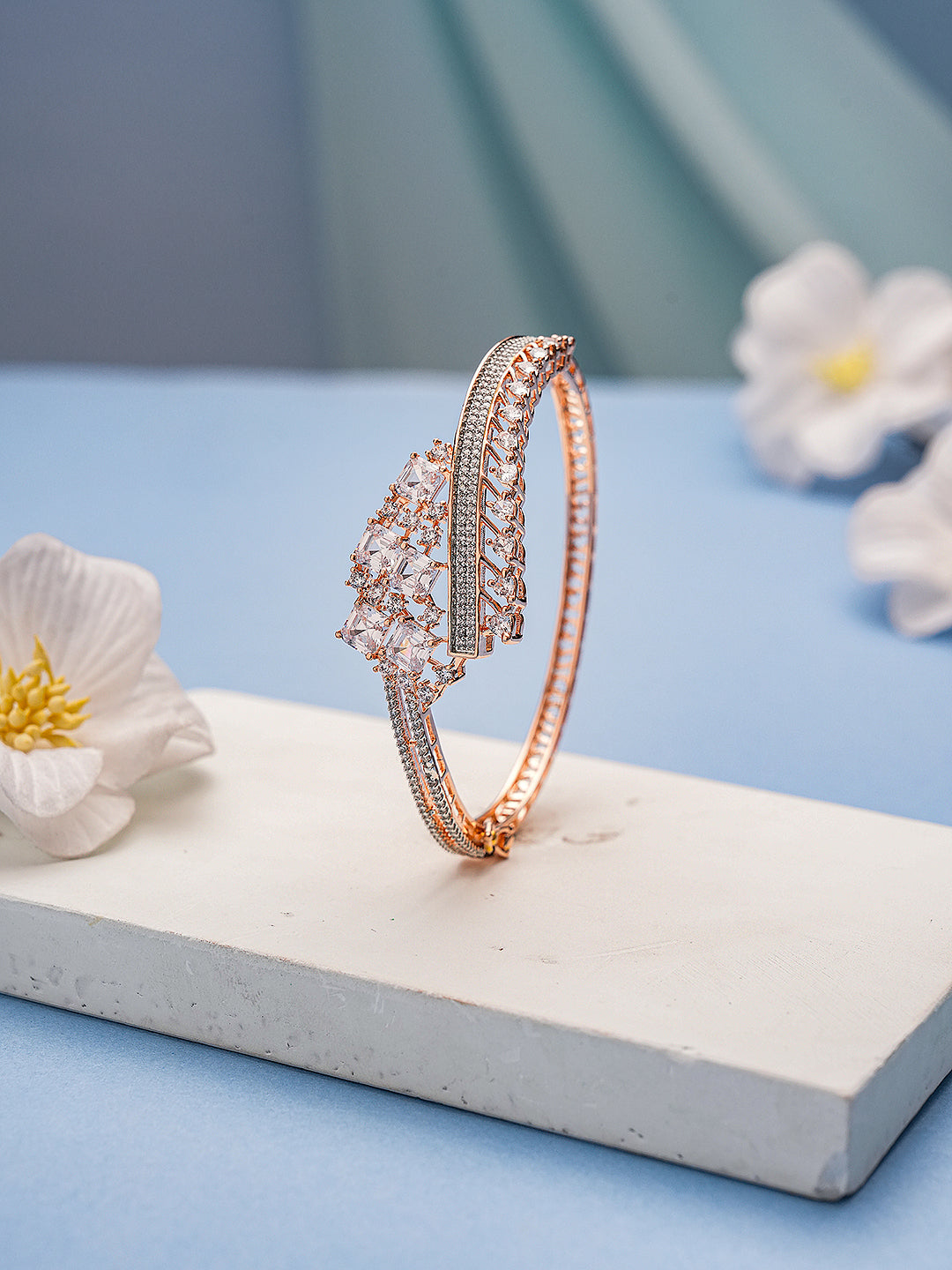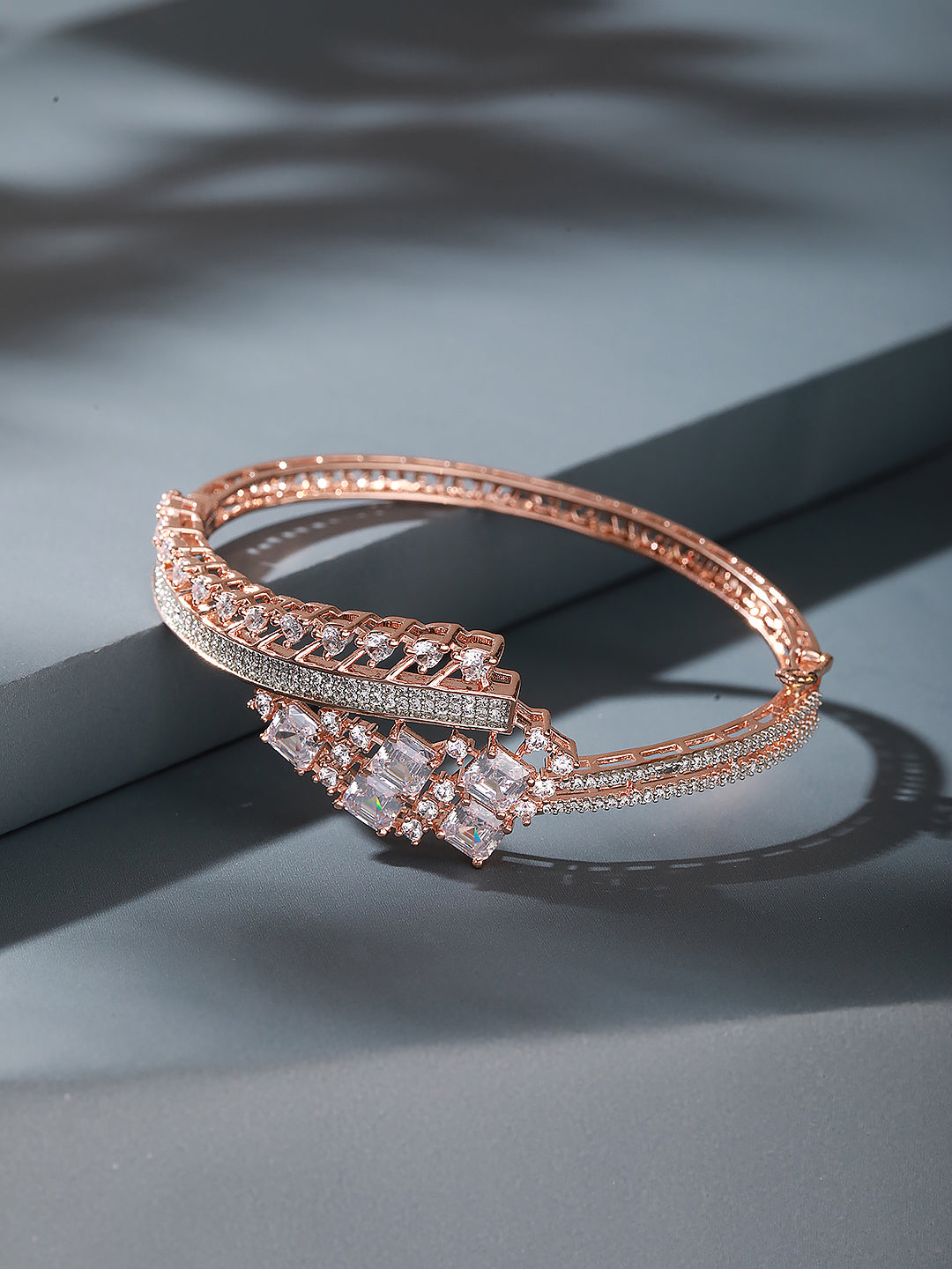 Product Type: Kada Bracelet Design: Designer, Contemporary Material: Brass Plating : Rose Gold Plated Stone Type: AD (American Diamond) Zircon Stone Color: White Bracelet Type: Openable Occasion: Party, Wedding, Festive, Casual, Ethnic & Fusion Wear Style: Designer, Elegant, Statement Package Contains: 1 Kada Bracelet