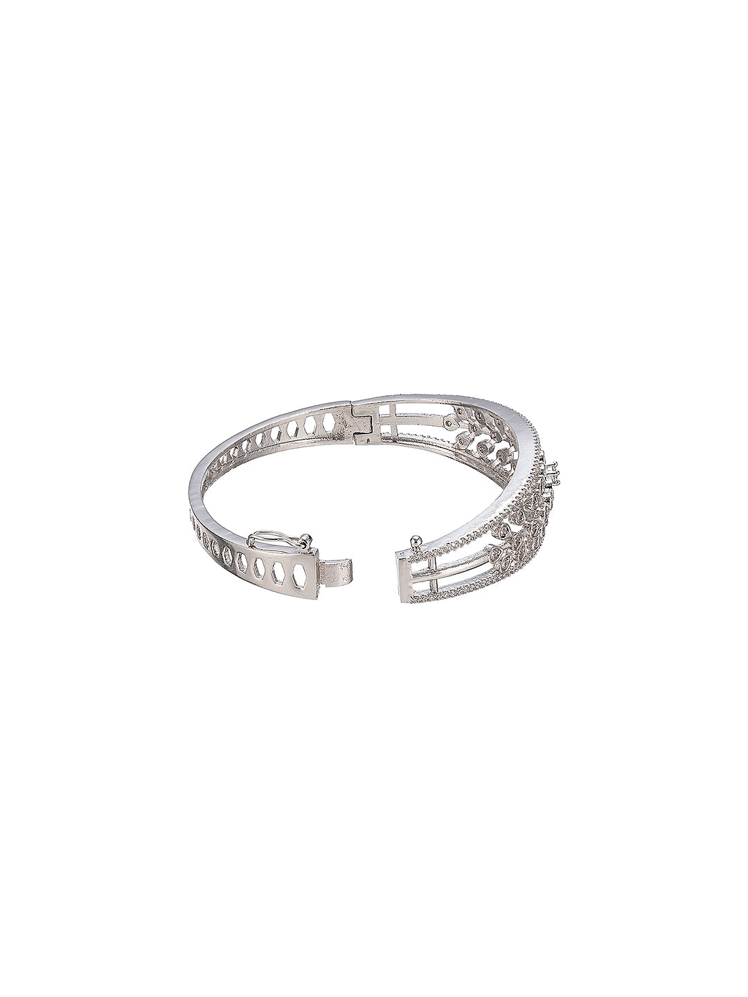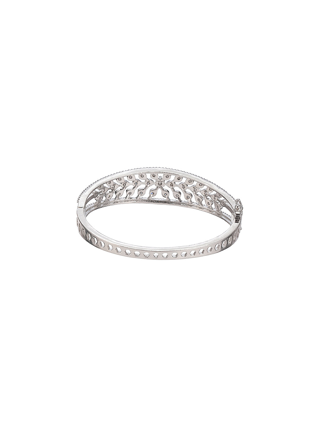 Featuring a sleek silver-plated finish adorned with shimmering AD cubic zirconia stones, this luxe bangle offers a perfect blend of sophistication and glamour. Ideal for weddings, parties, festive occasions, or evening wear, its timeless design complements both traditional and contemporary outfits.