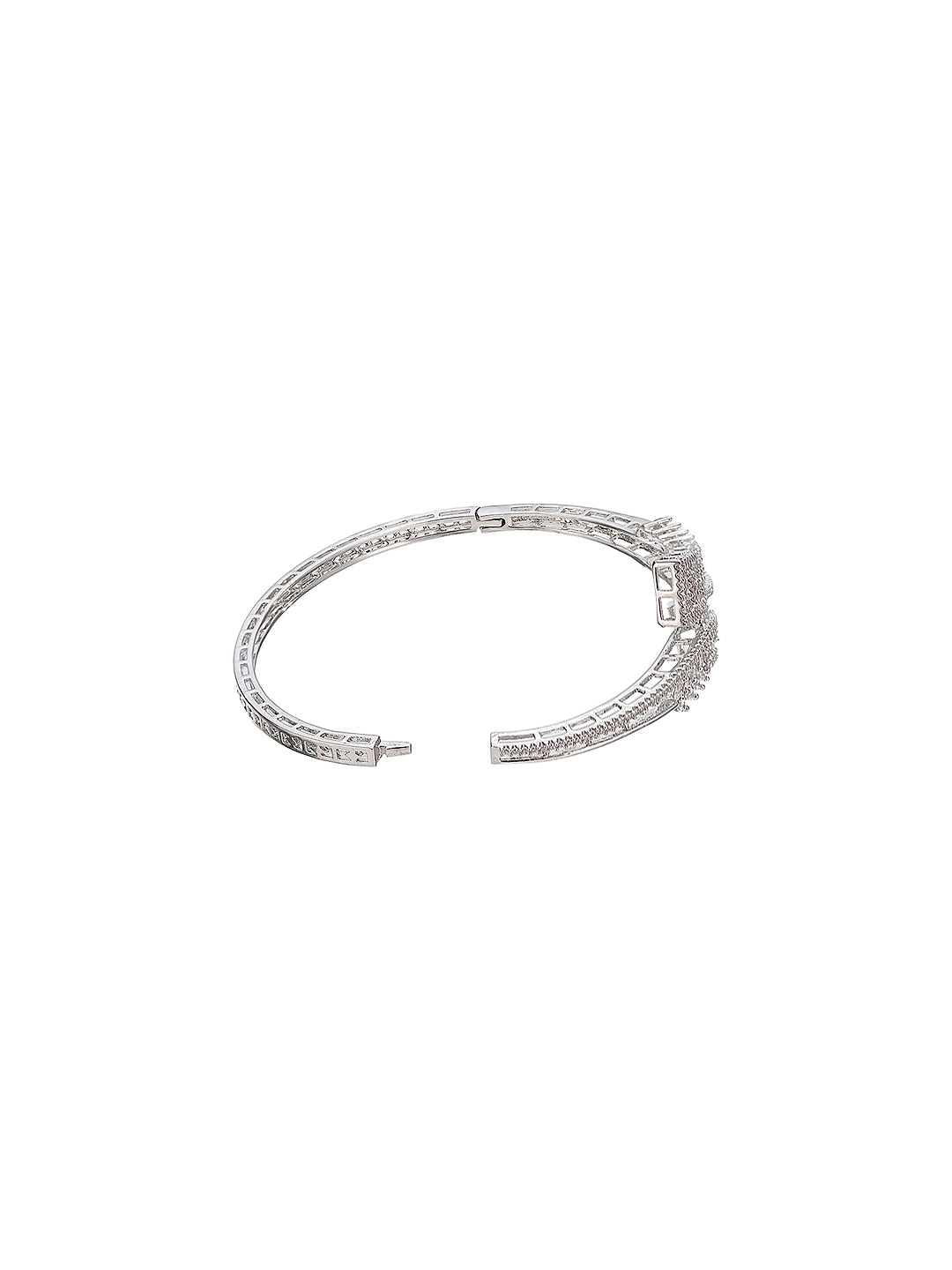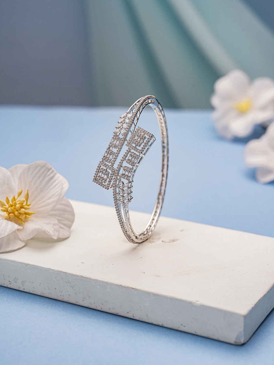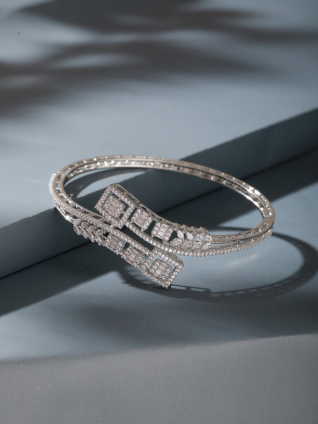 Product Type: Kada Bracelet Design: Designer, Contemporary Material: Brass Plating : Silver Plated Stone Type: AD (American Diamond) Zircon Stone Color: White Bracelet Type: Openable Occasion: Party, Wedding, Festive, Casual, Ethnic & Fusion Wear Style: Designer, Elegant, Statement Package Contains: 1 Kada Bracelet