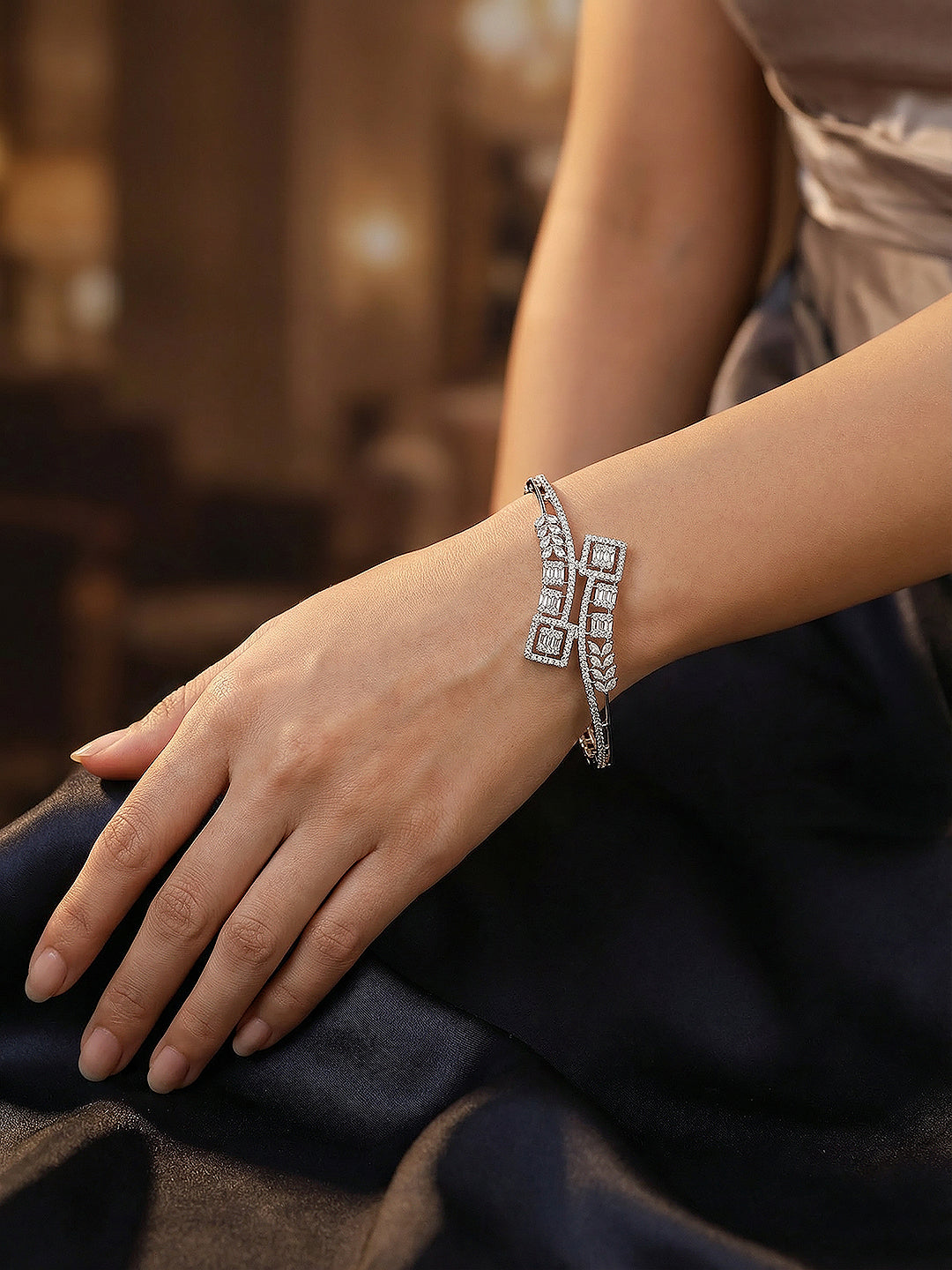 Featuring a delicate leafy motif adorned with sparkling AD stones, this bracelet is crafted with a sleek silver-plated finish for a clean and contemporary look. Its minimal yet designer appeal makes it perfect for daily wear, office styling, or subtle festive occasions.