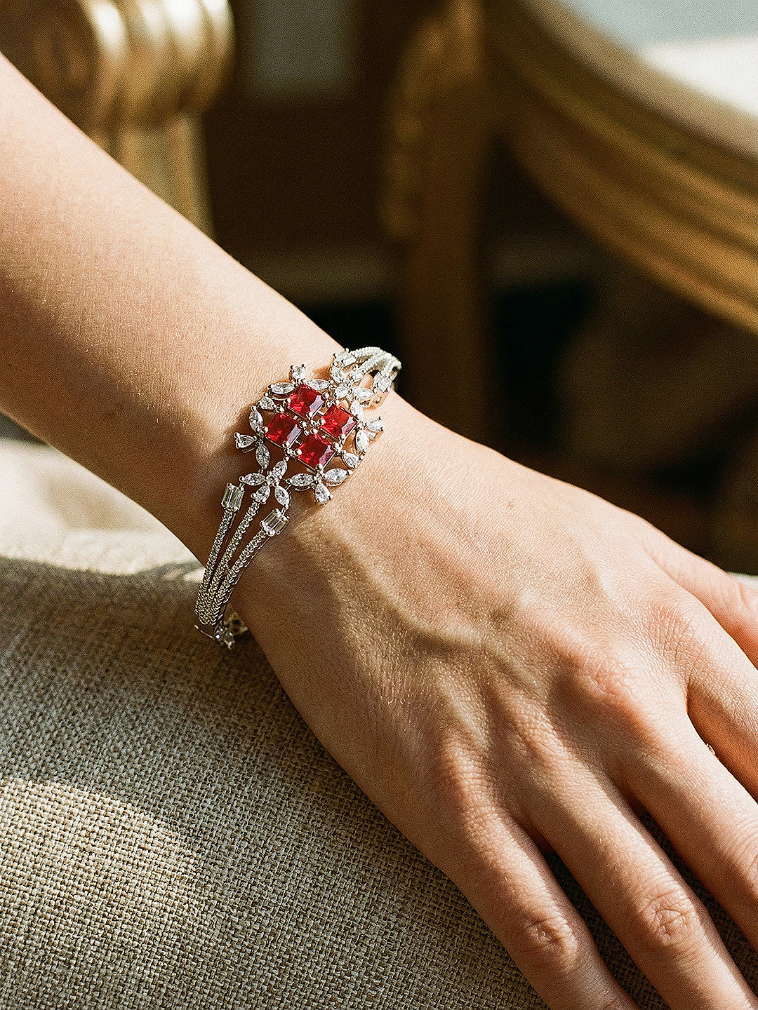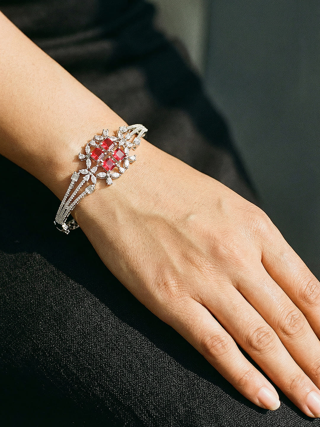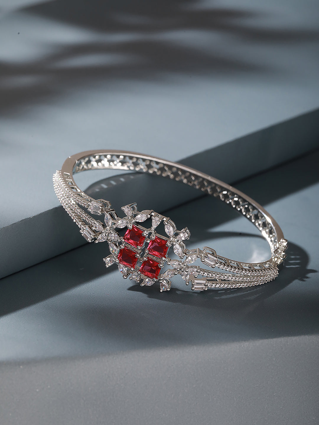 Silver Plated Ruby Red Cubic Zirconia Geometric Luxe Bridal Kada Bracelet