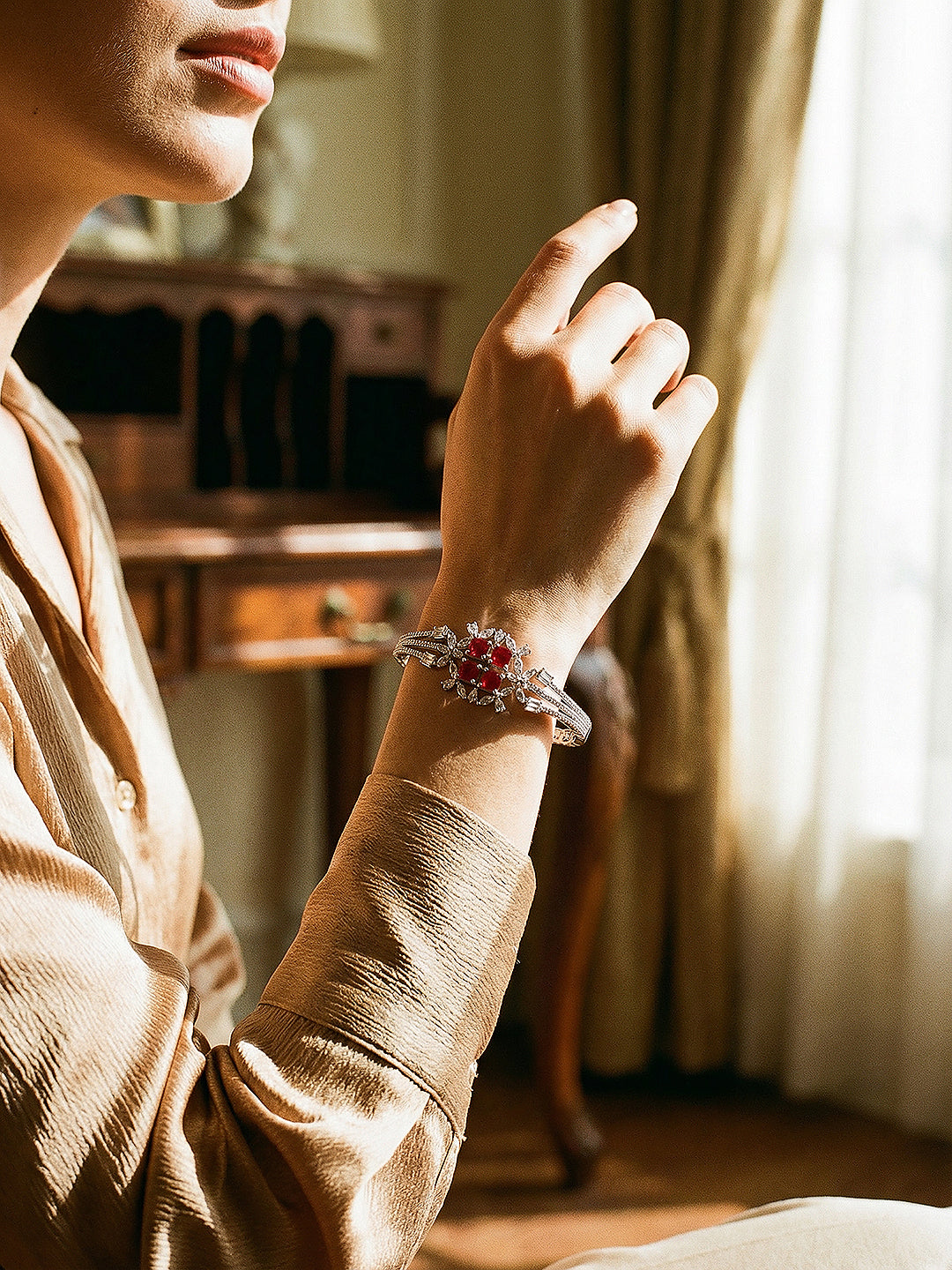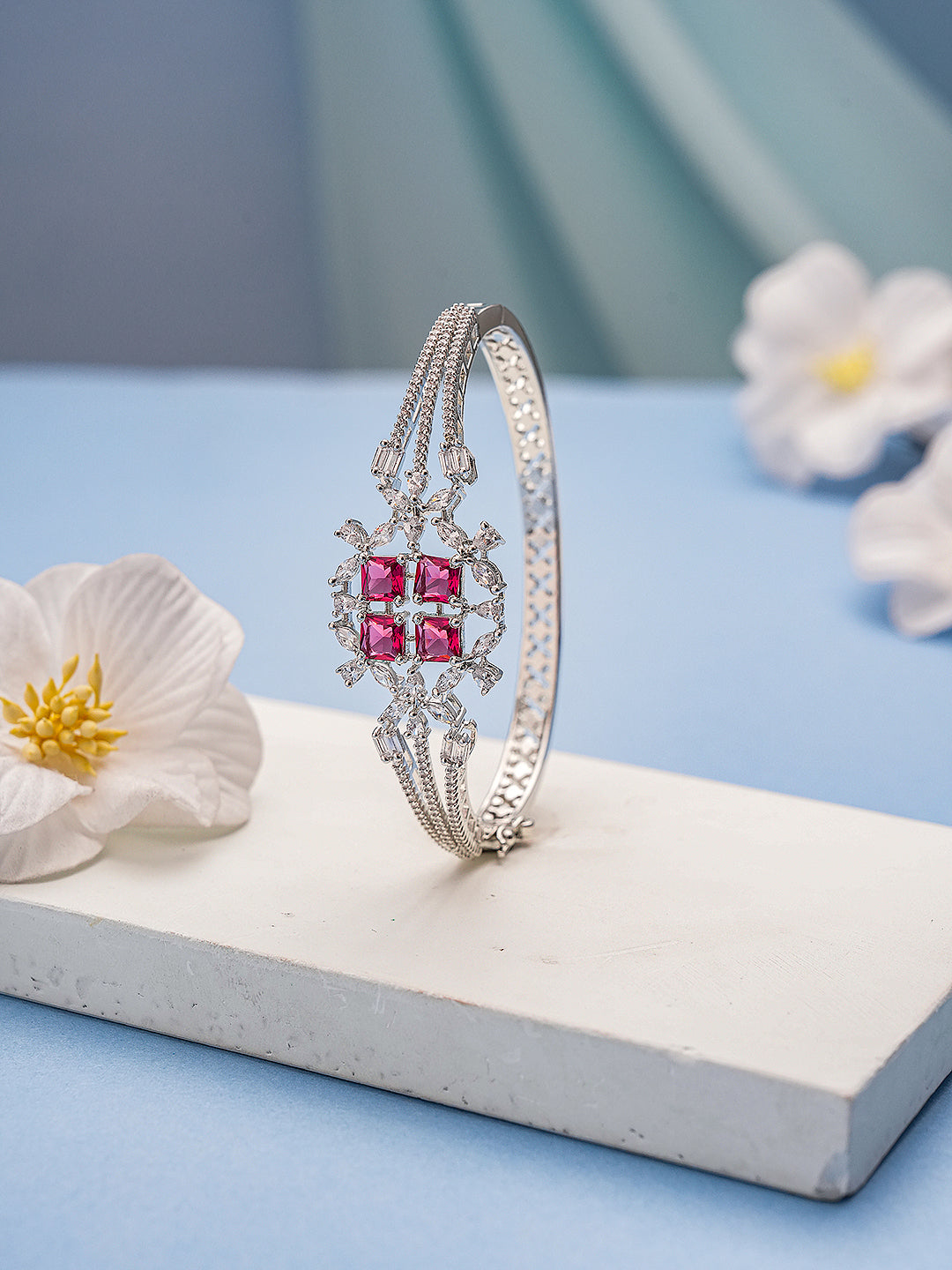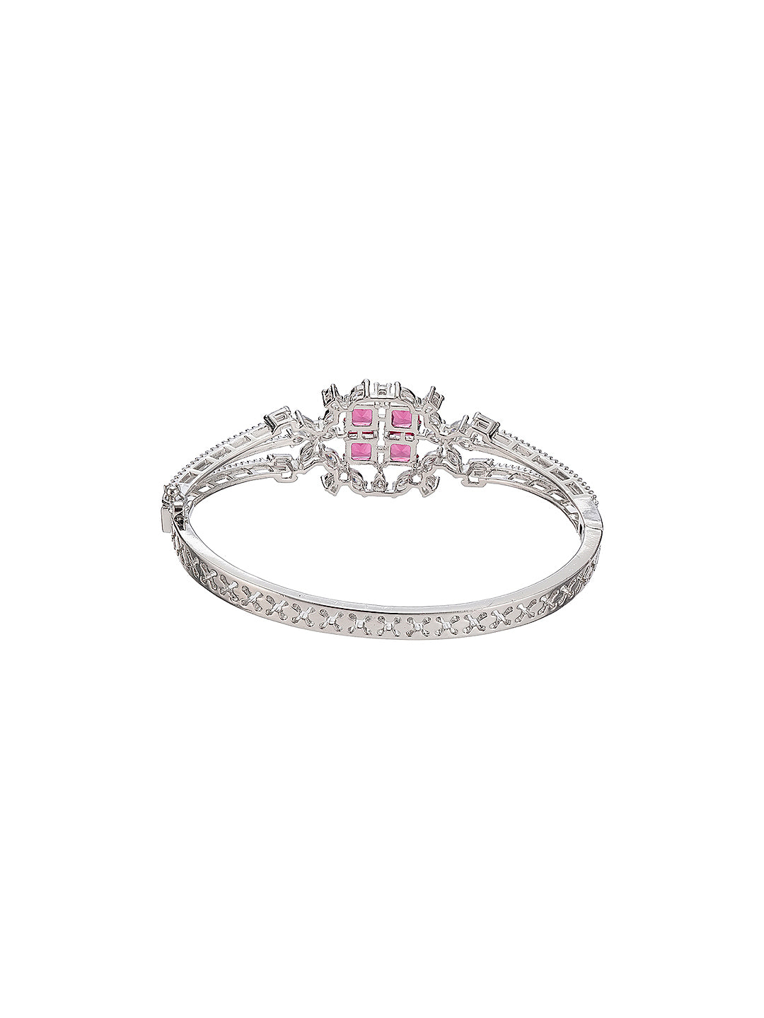 Silver Plated Ruby Red Cubic Zirconia Geometric Luxe Bridal Kada Bracelet