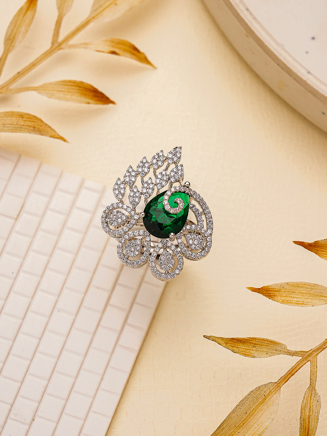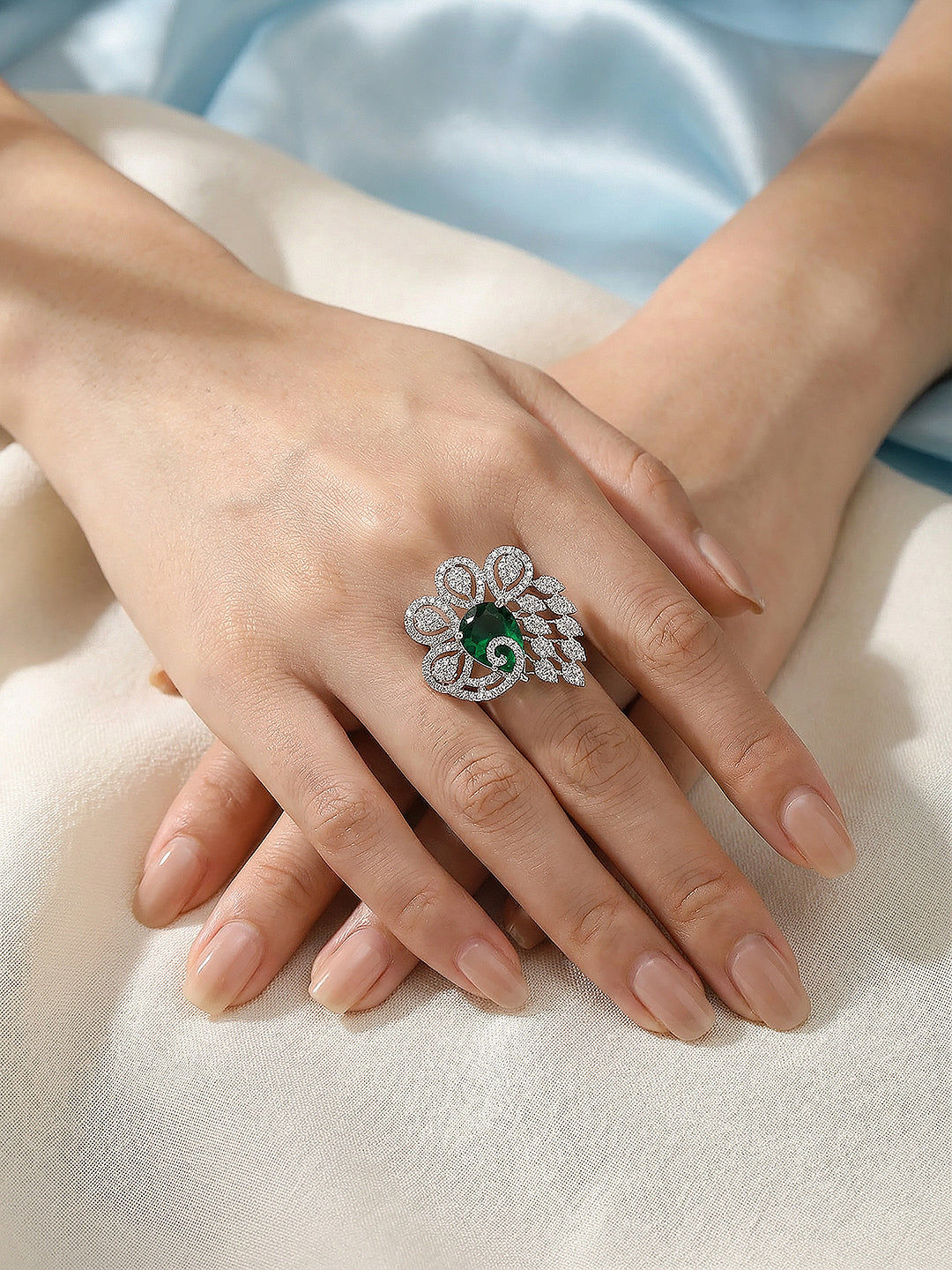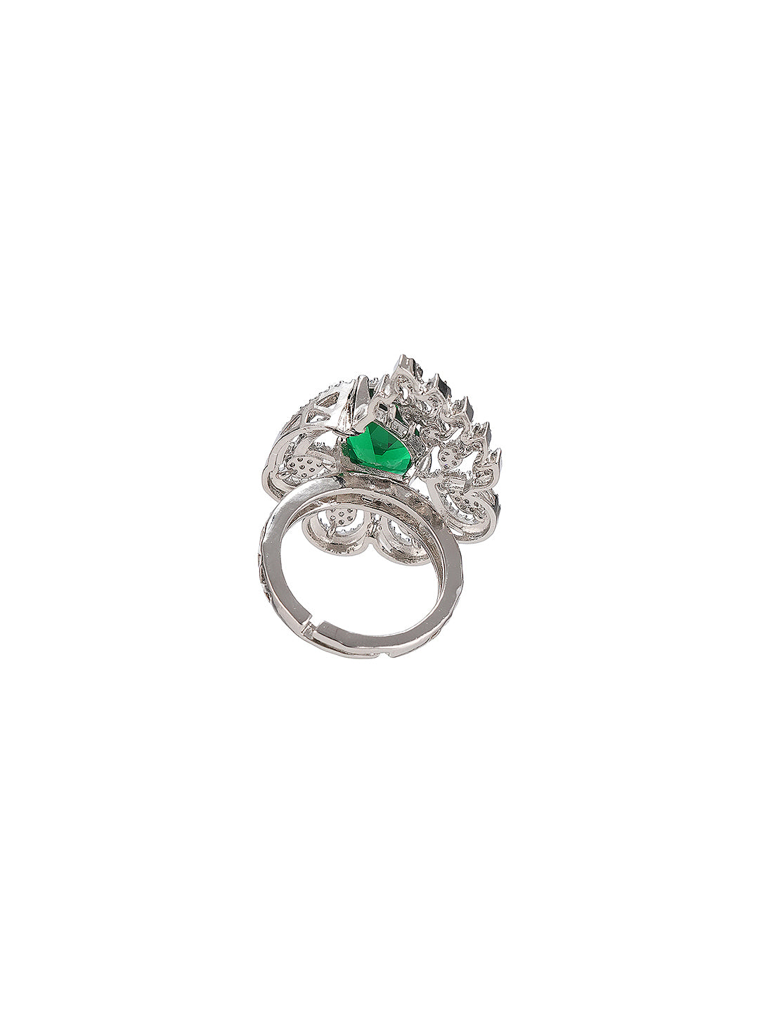 Product Type: Adjustable Finger Ring Design: Designer, Statement Material: Brass Plating : Silver Plated Stone Type: AD (American Diamond) Stone Color: Emerald Green Ring Type: Adjustable Occasion: Party, Wedding, Festive, Casual, Ethnic & Fusion Wear Style: Designer, Contemporary, Statement, Bold Package Contains: 1 Adjustable Finger Ring