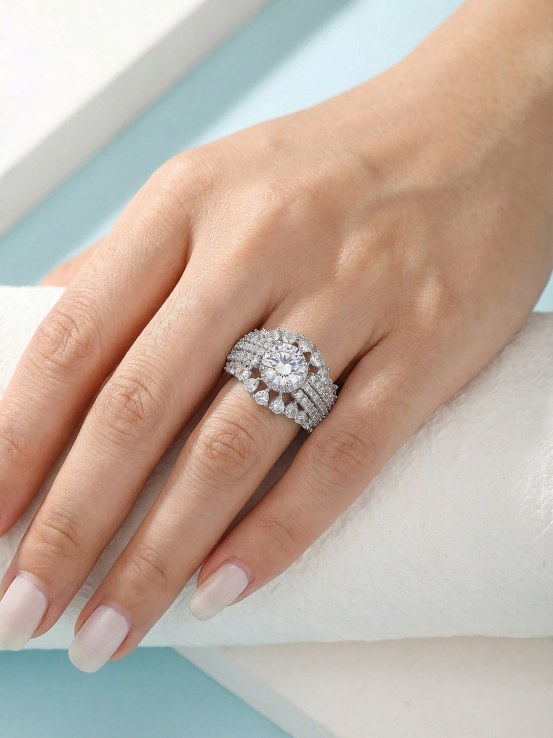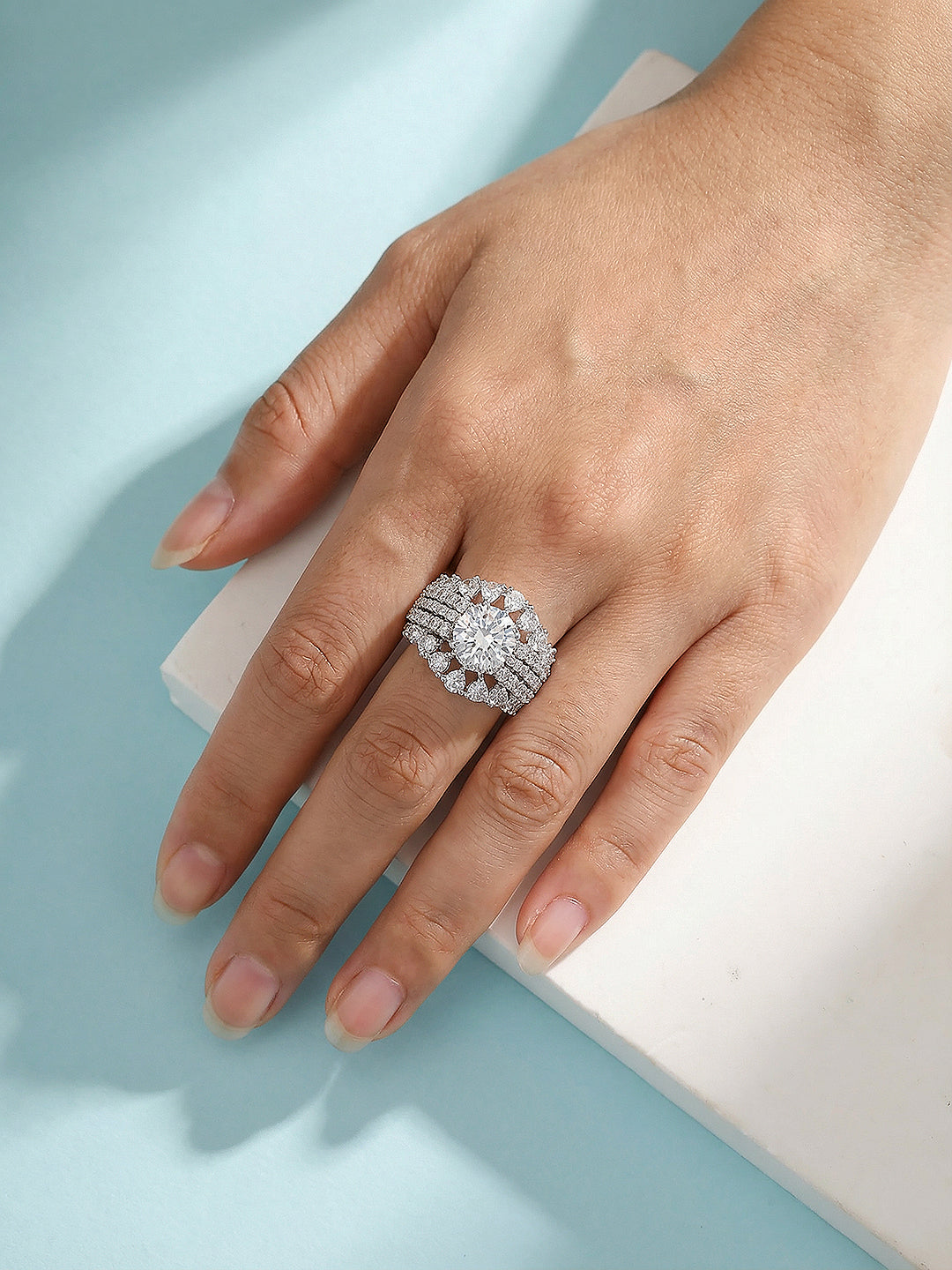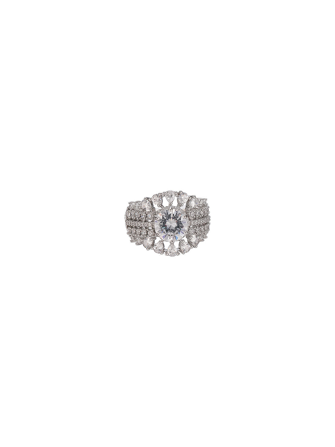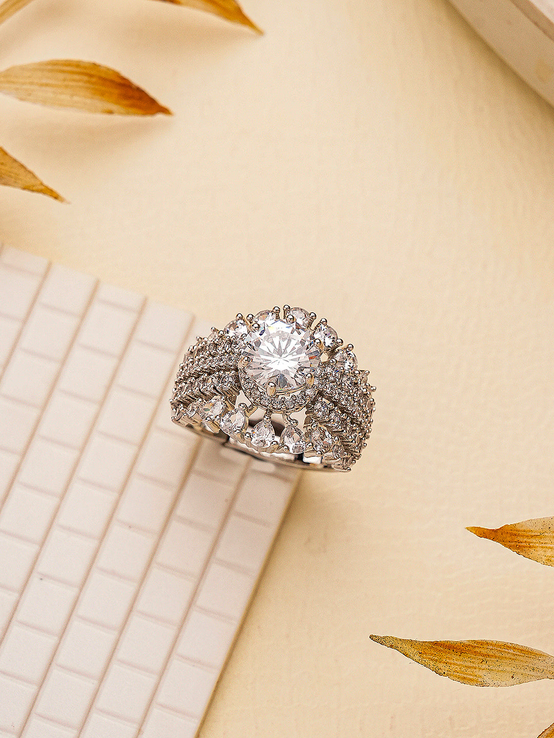 Designed with a radiant solitaire-style AD zircon stone, this ring reflects timeless beauty and graceful sophistication. The polished silver-toned finish enhances its classic appeal, while the adjustable band offers a comfortable and secure fit.