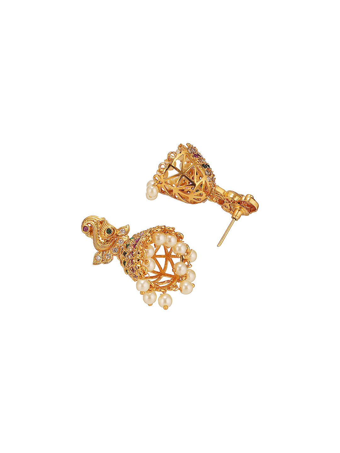 Product Type: Jhumka Earrings Design: Contemporary Peacock Motif, Temple Jewellery Material: Brass Plating : Gold Plated Stone Type: AD (American Diamond) Stone Color: Multi-Coloured Earring Type: Jhumka Closure: Push Back Occasion: Wedding, Bridal, Festive, Traditional Functions Style: Temple, Ethnic, Regal, Statement Package Contains: 1 Pair of Jhumka Earrings