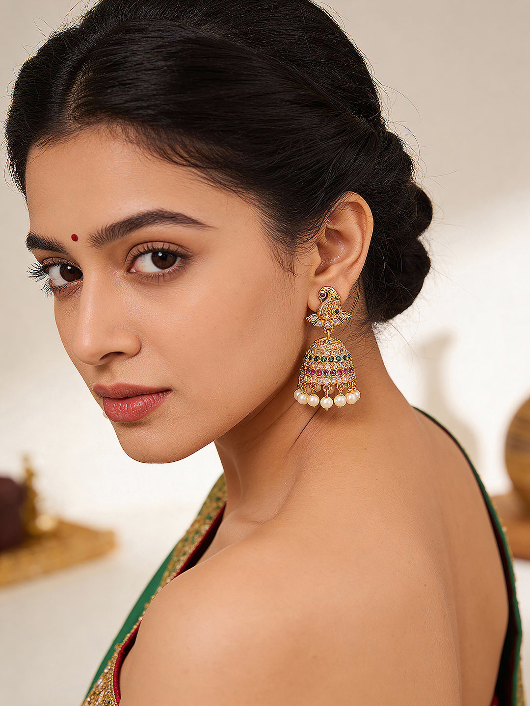 Featuring a beautifully crafted peacock motif adorned with sparkling AD stones, these jhumkas combine temple-inspired artistry with contemporary design. The gold-plated finish adds a rich, festive glow, making them perfect for weddings, bridal occasions, and festive celebrations.
