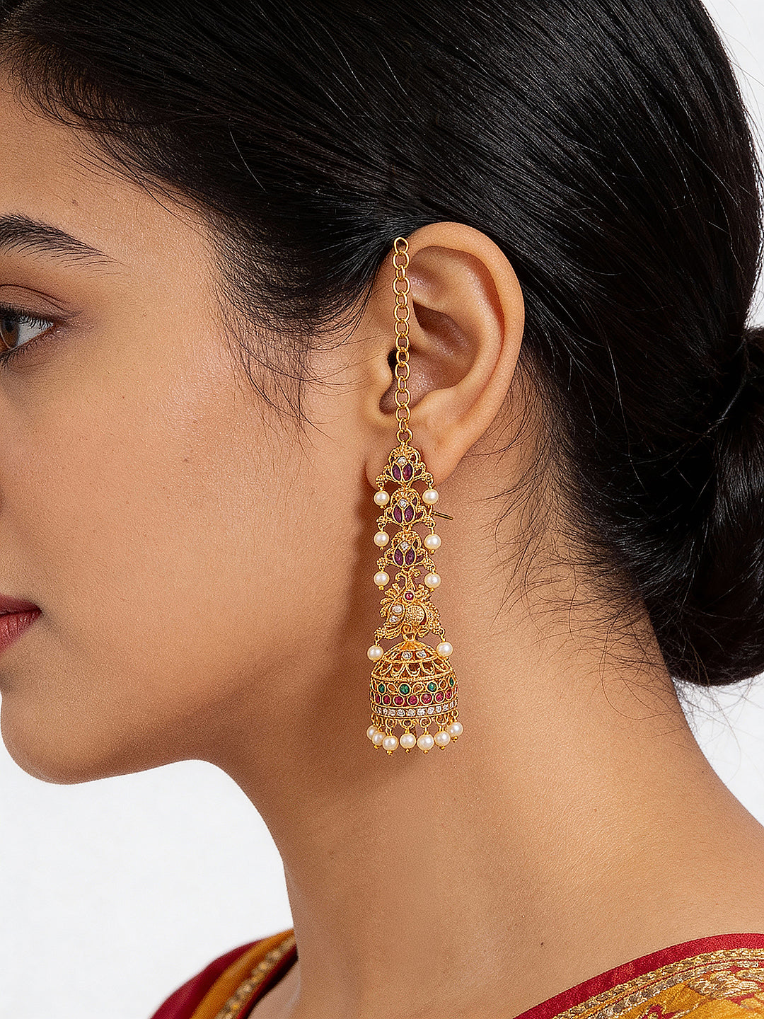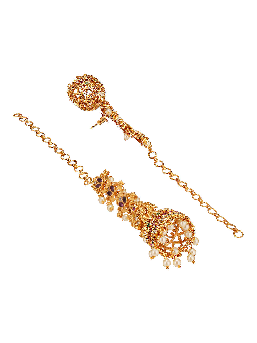 Gold Plated AD Studded Peacock Floral Motif Matil Earchain Jhumka Earrings