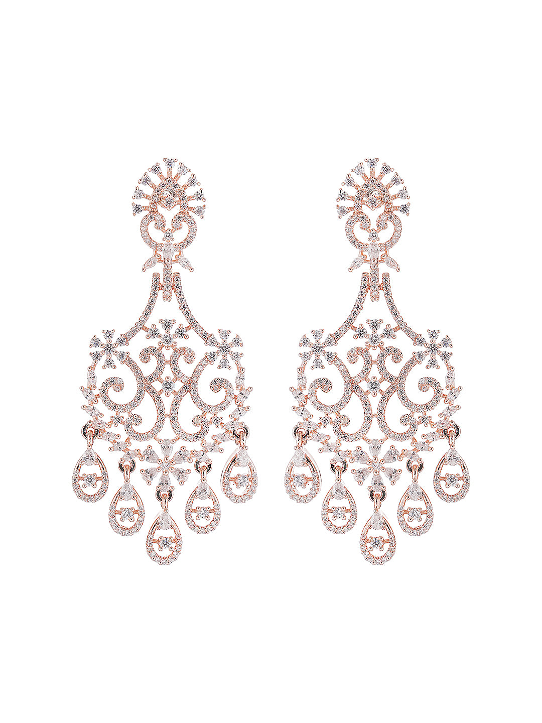 Product Type: Chandbali Earrings Design: Contemporary Floral Material: Brass Plating : Rose Gold Toned Stone Type: AD Zirconia Stone Color: White Earring Type: Dangling Closure: Push Back Occasion: Party, Festive, Wedding, Traditional & Fusion Wear Style: Contemporary, Elegant, Floral Package Contains: 1 Pair of Earrings
