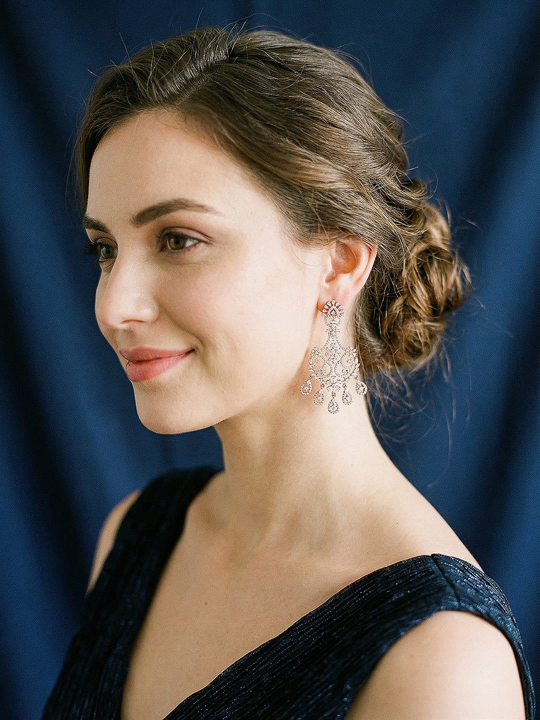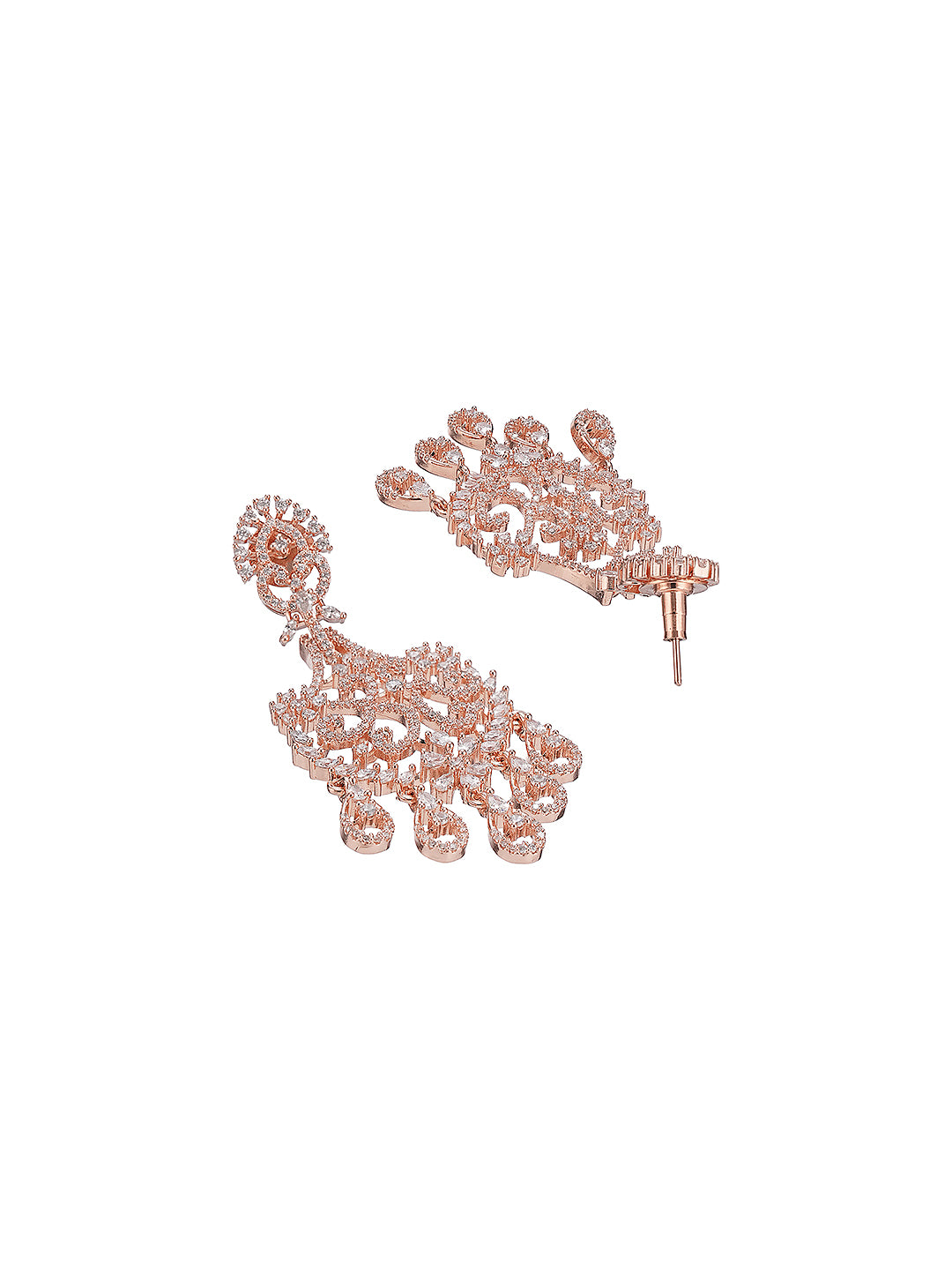 Designed with a graceful floral motif, the earrings are adorned with sparkling AD zirconia stones that add brilliance and charm. The warm rose gold tone enhances their contemporary appeal, making them perfect for parties, weddings, and festive occasions.