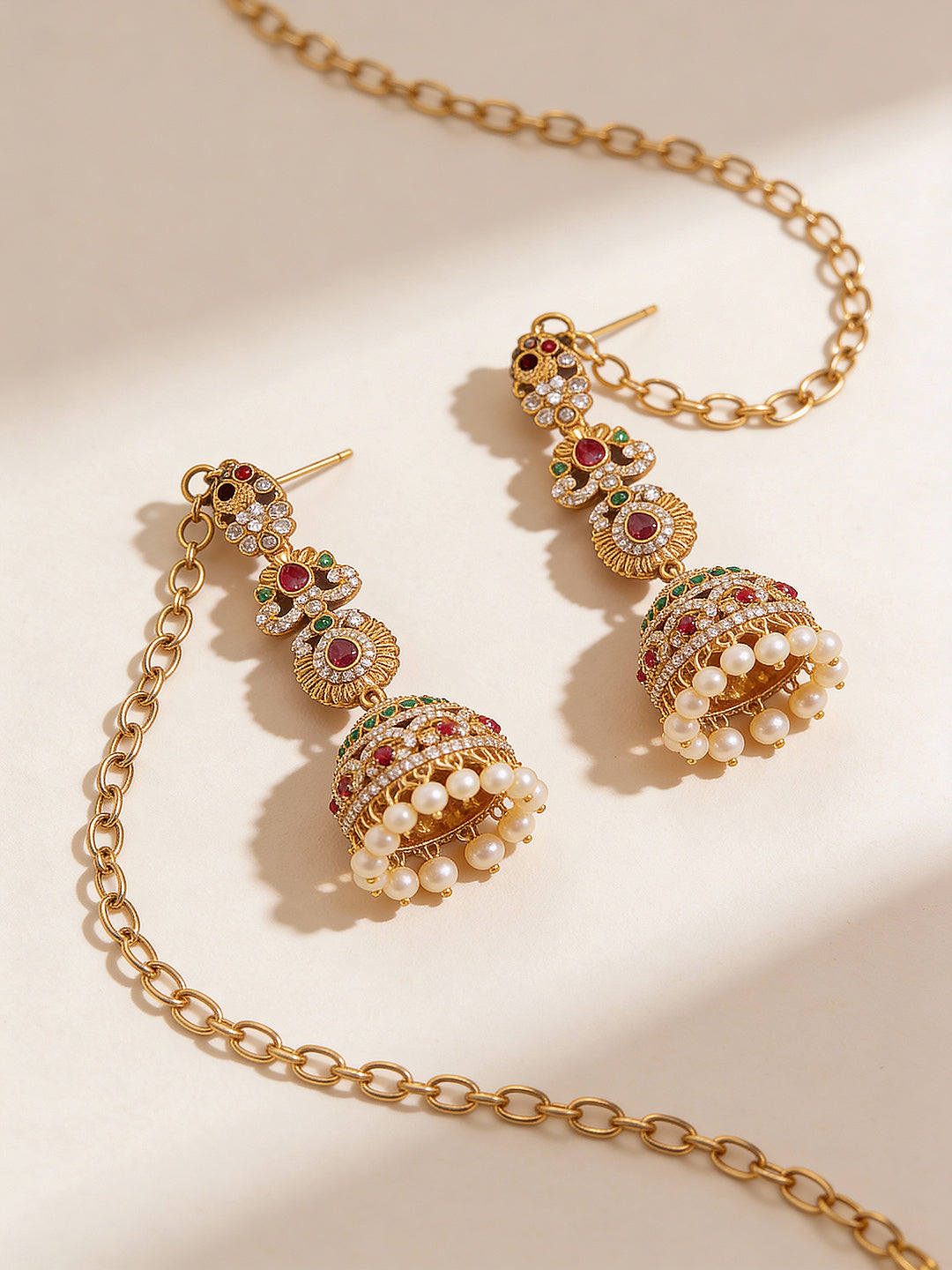 Featuring an intricate peacock and floral design adorned with sparkling AD stones, these earrings combine regal temple-inspired artistry with the elegant matil (ear chain) style for a complete ethnic statement. The gold-plated finish adds a rich and festive shine, making them perfect for weddings, bridal occasions, and festive celebrations.