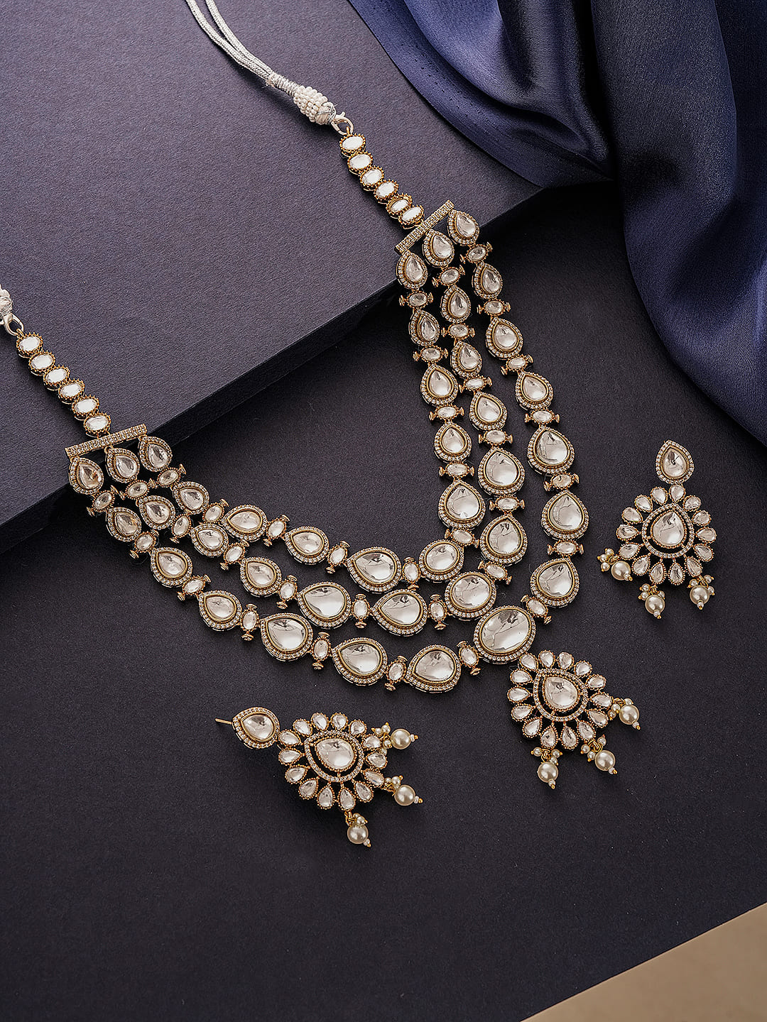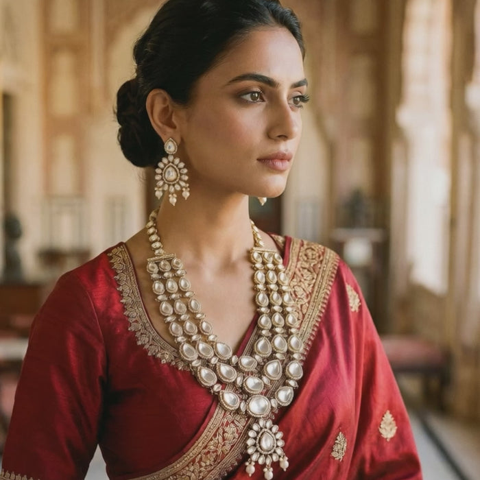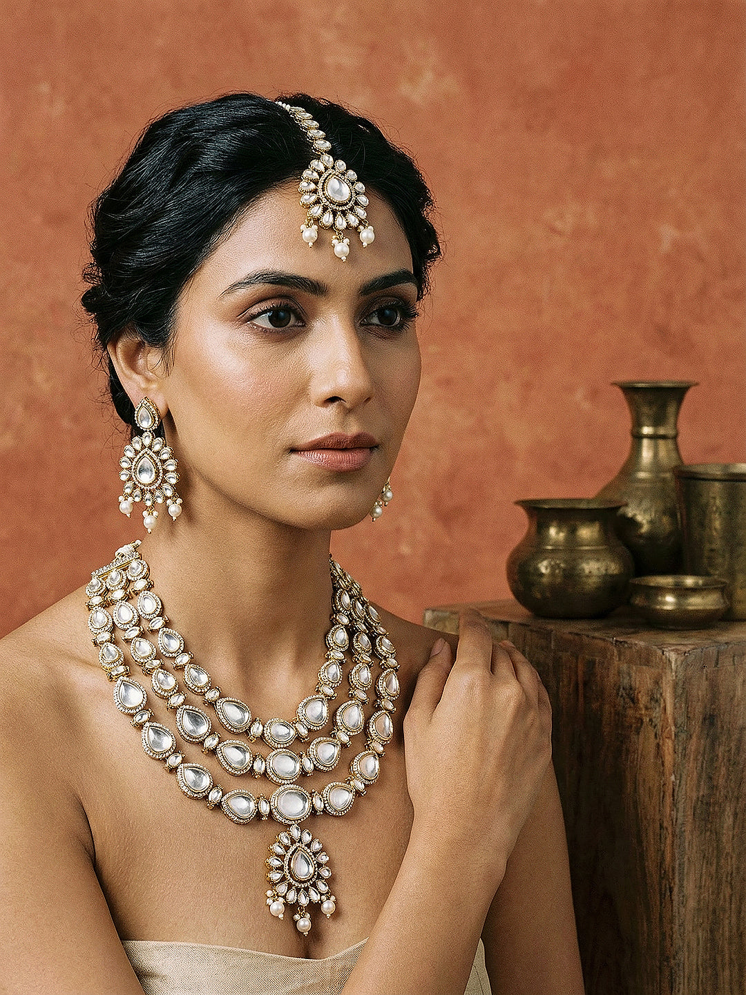 Make your bridal look truly majestic with this Gold Antique Uncut Polki Kundan Layered Statement Bridal Jewellery Set. Featuring intricately crafted layers adorned with Kundan and uncut Polki stones, the necklace exudes regal charm and traditional elegance. The antique gold finish enhances its vintage appeal, making it perfect for weddings, engagements, and festive celebrations.