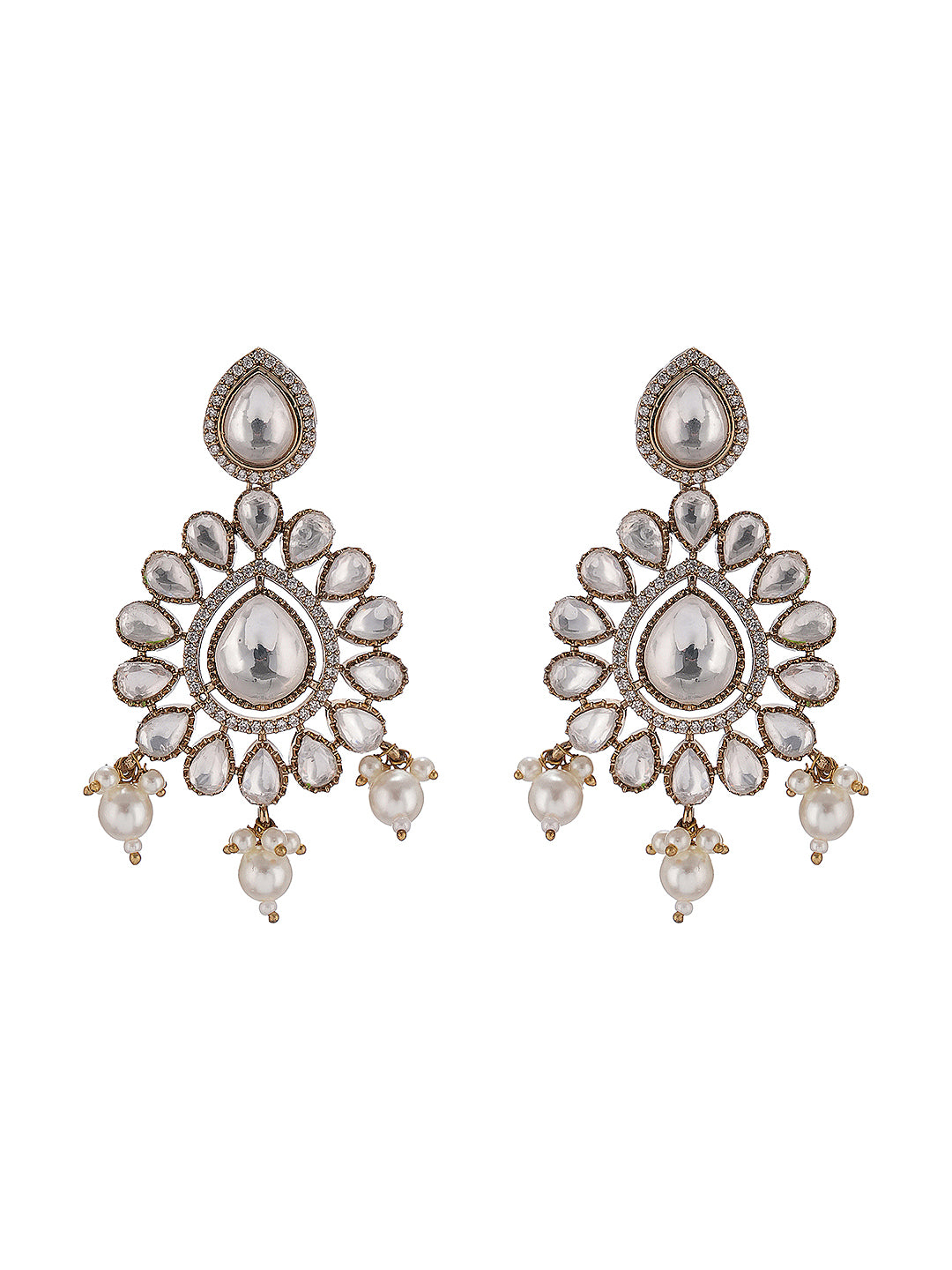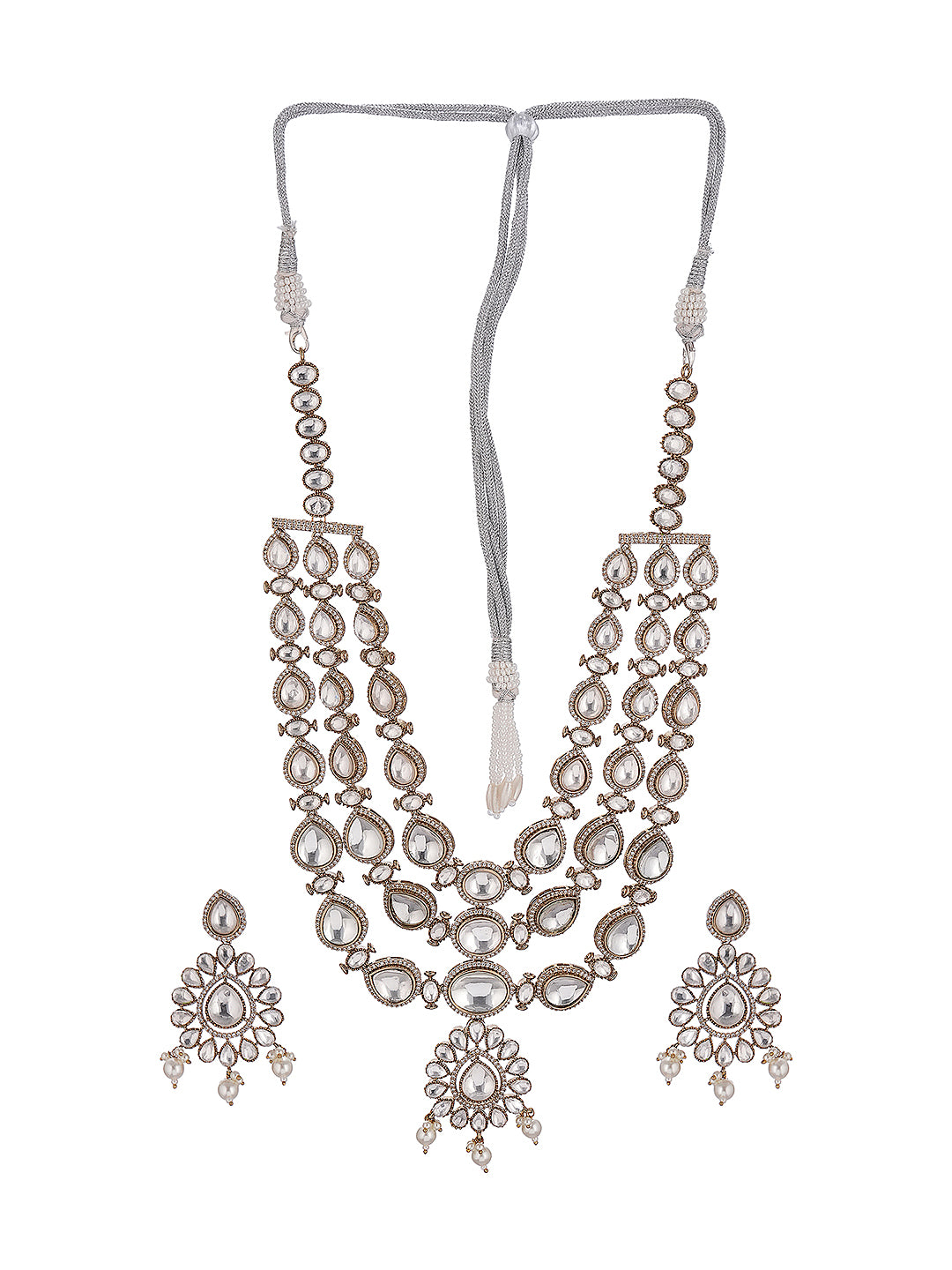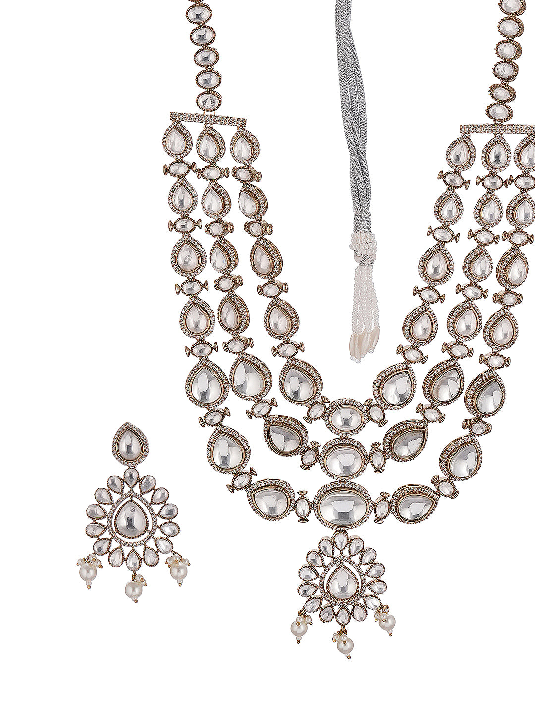 Make your bridal look truly majestic with this Gold Antique Uncut Polki Kundan Layered Statement Bridal Jewellery Set. Featuring intricately crafted layers adorned with Kundan and uncut Polki stones, the necklace exudes regal charm and traditional elegance. The antique gold finish enhances its vintage appeal, making it perfect for weddings, engagements, and festive celebrations.