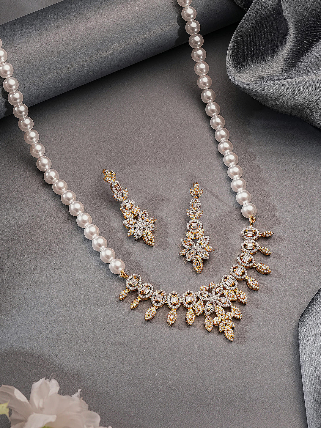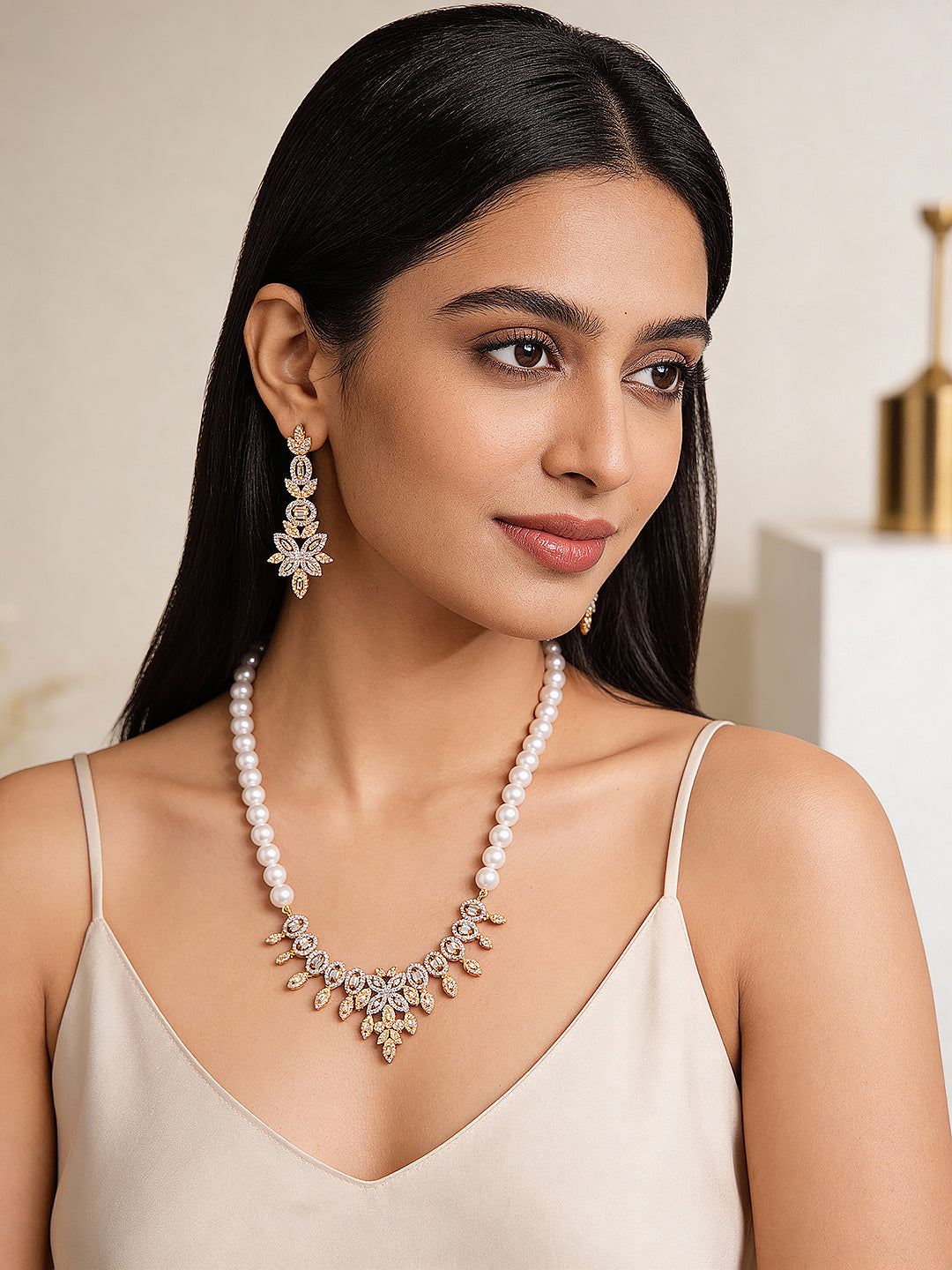 Product Type: Pearl Maala Jewellery Set Design: Traditional Material: Brass Plating : Gold Plated Stone Type: AD Zircon, Pearl Stone Color: White Necklace Type: Pearl Maala Necklace Closure: Adjustable / Hook Occasion: Wedding, Festive, Traditional, Party Style: Luxe, Ethnic, Statement Package Contains: 1 Pearl Maala Necklace, 1 Pair of Earrings