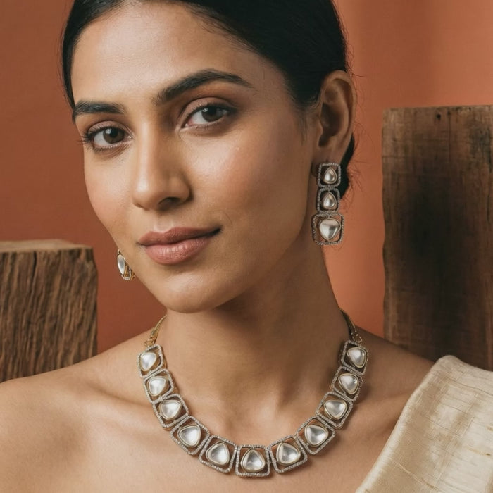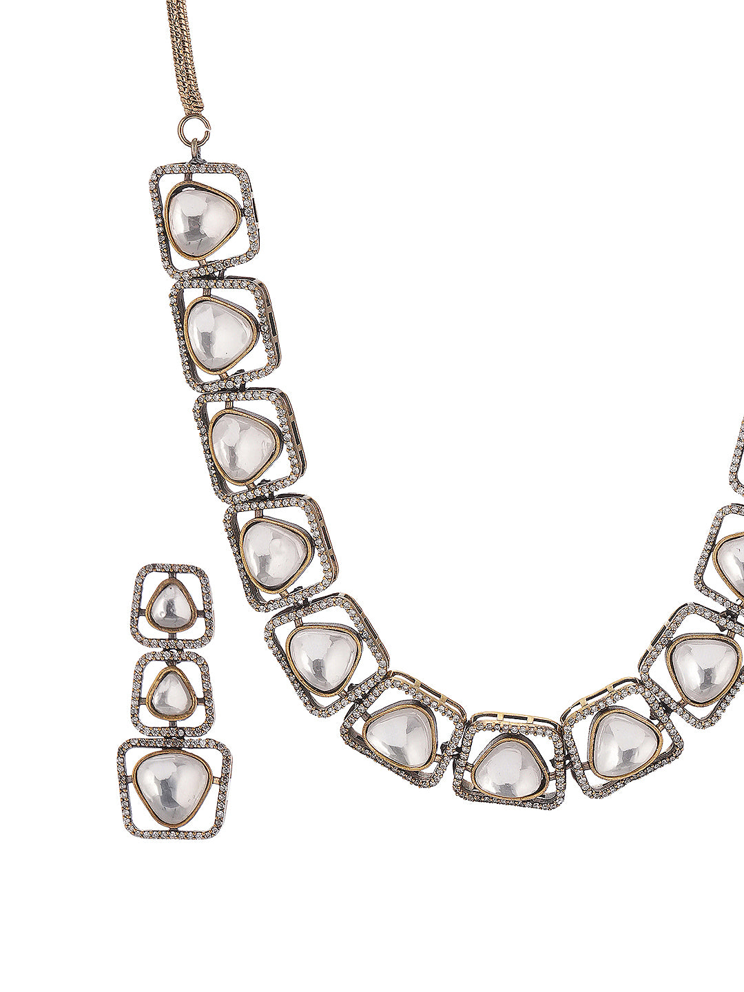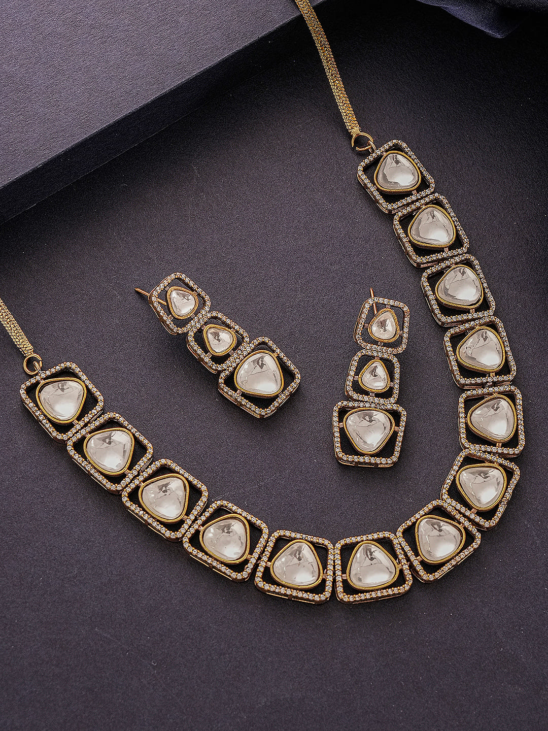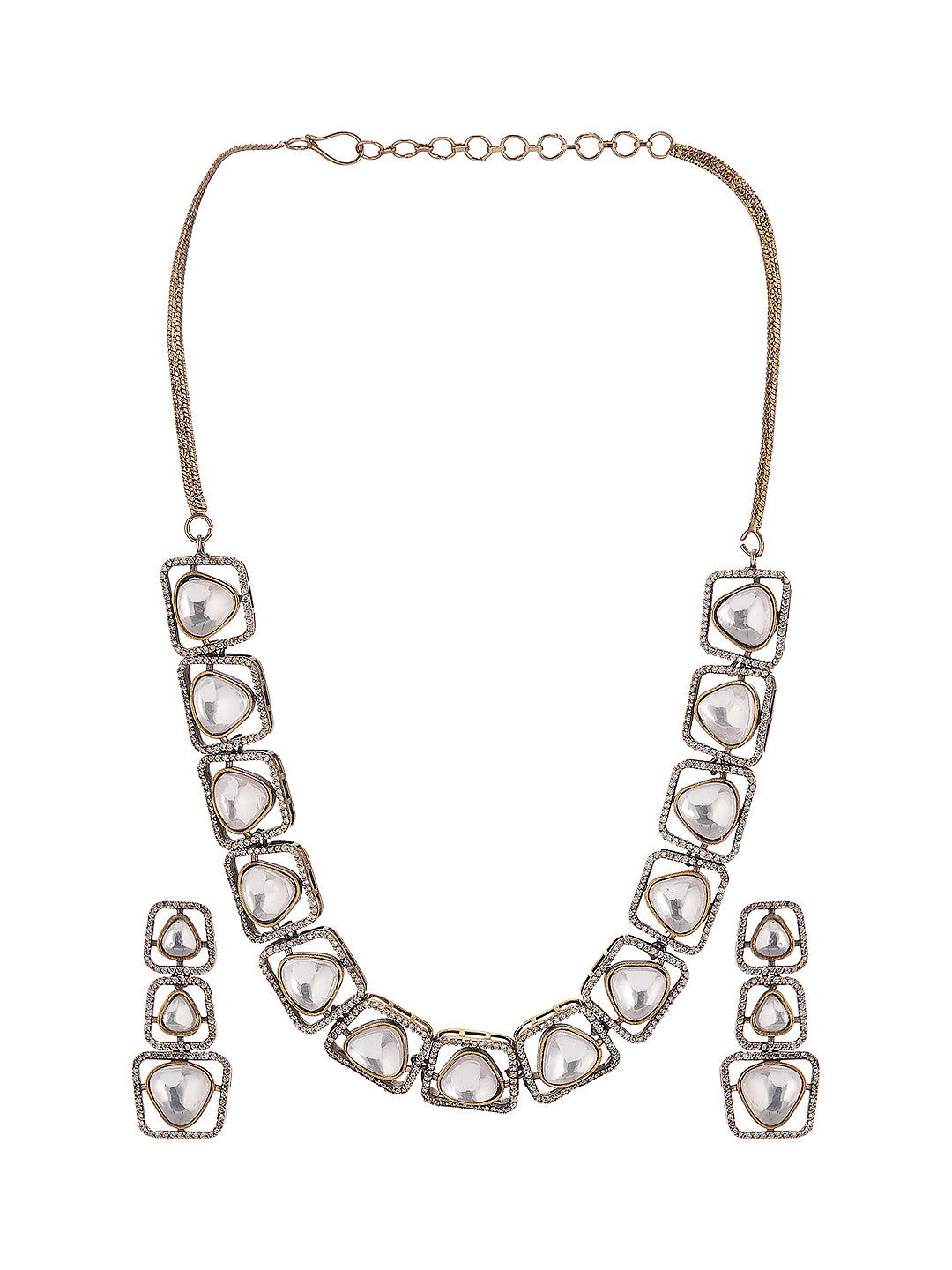 Product Type: Statement Necklace and Earrings Set Design: Kundan Polki, Square Motif Material: Brass Plating: Gold Toned Stone Type: Kundan, Polki (Uncut Stones) Stone Color: White / Transparent Necklace Type: Statement Necklace Closure: Adjustable / Hook Occasion: Wedding, Bridal, Festive Style: Traditional, Regal Package Contains: 1 Necklace, 1 Pair of Earrings