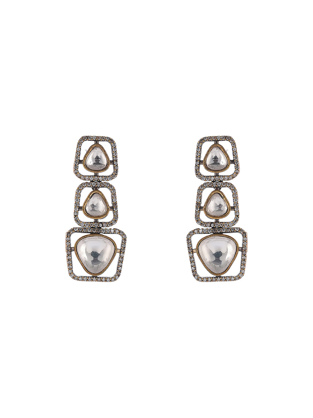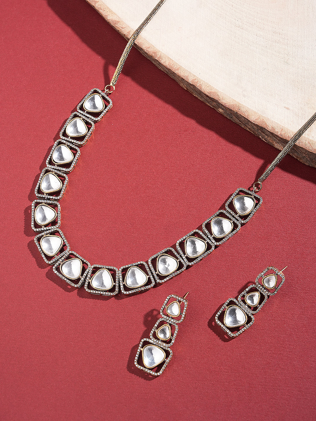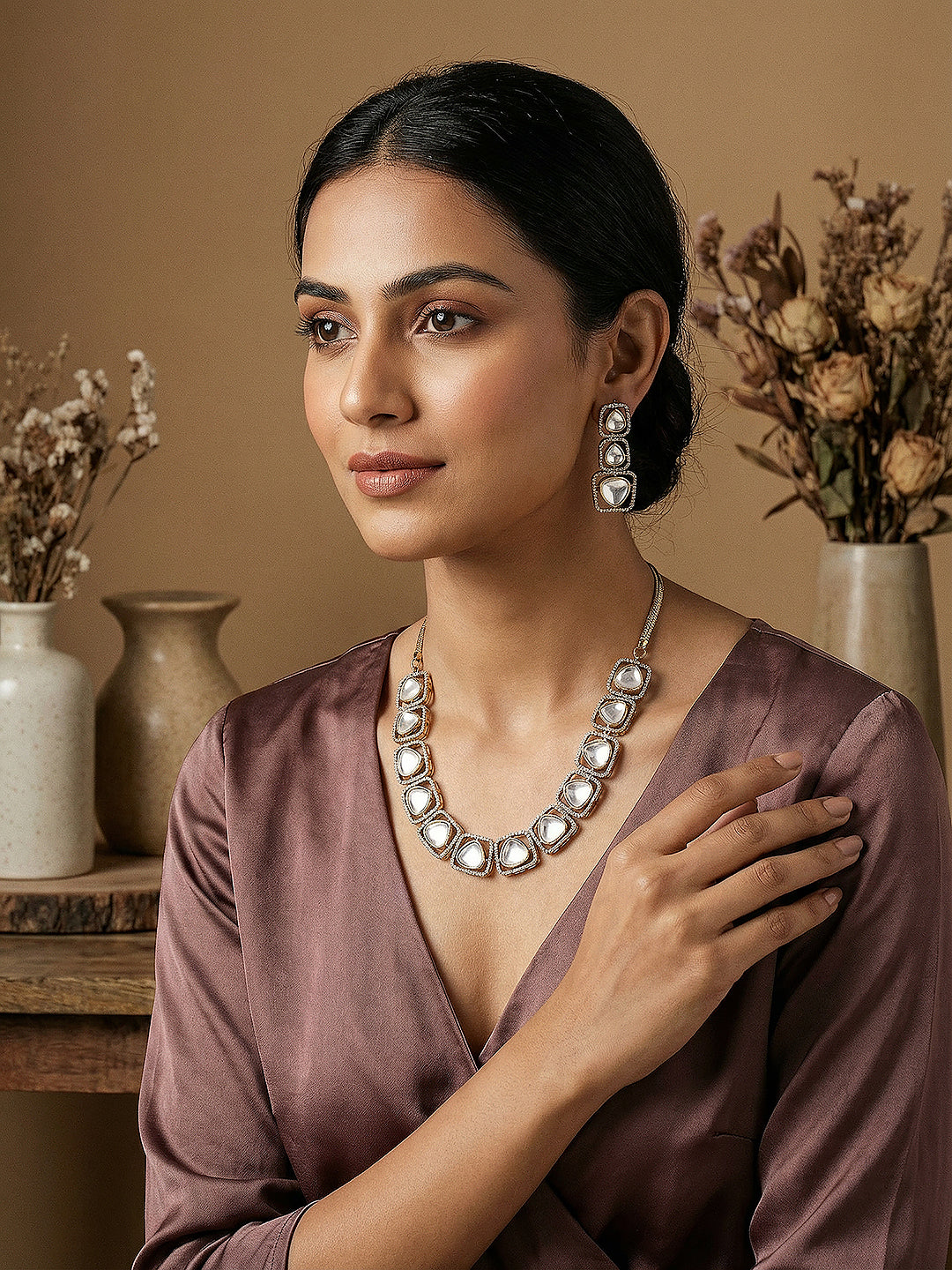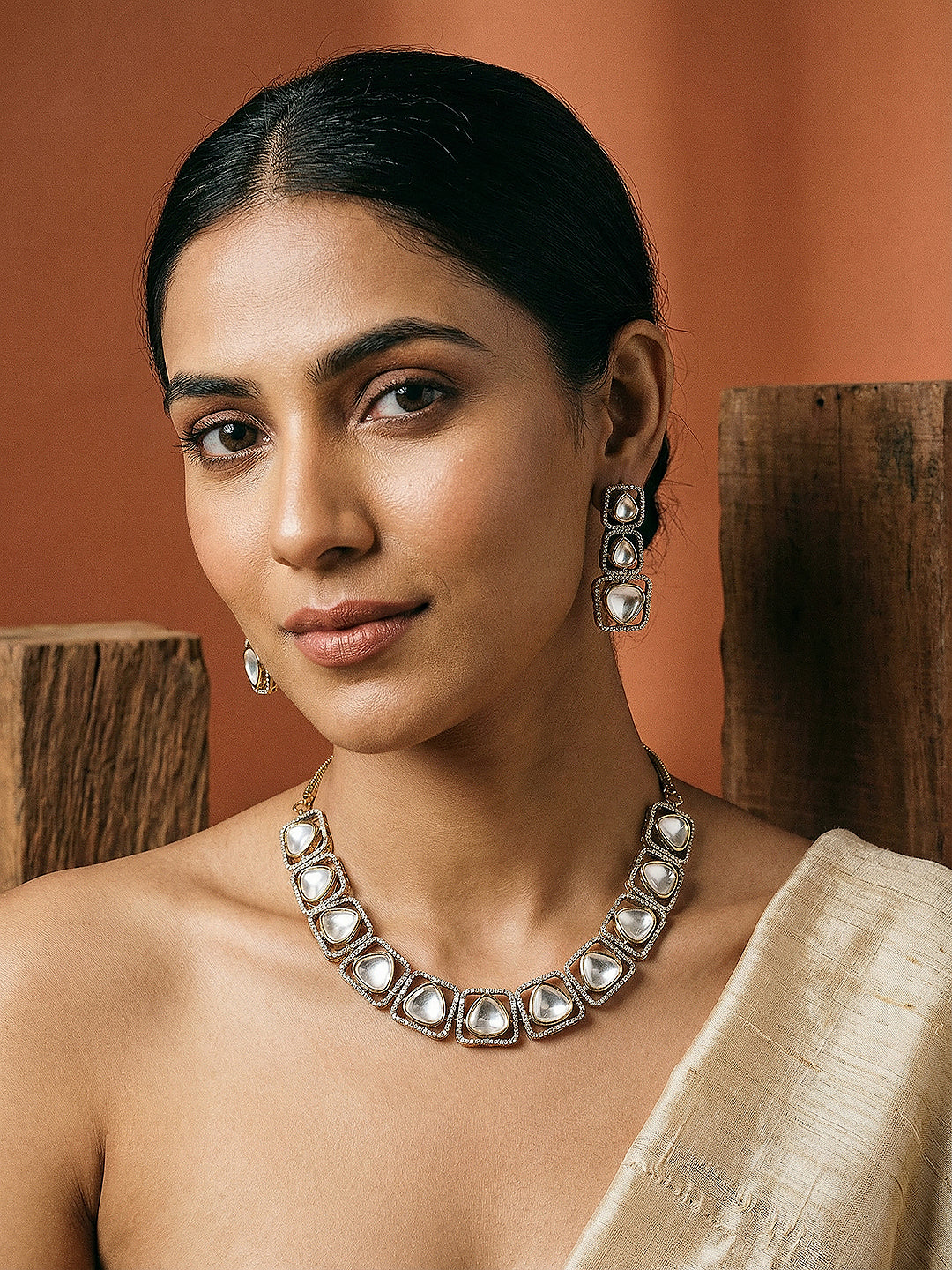 Product Type: Statement Necklace and Earrings Set Design: Kundan Polki, Square Motif Material: Brass Plating: Gold Toned Stone Type: Kundan, Polki (Uncut Stones) Stone Color: White / Transparent Necklace Type: Statement Necklace Closure: Adjustable / Hook Occasion: Wedding, Bridal, Festive Style: Traditional, Regal Package Contains: 1 Necklace, 1 Pair of Earrings