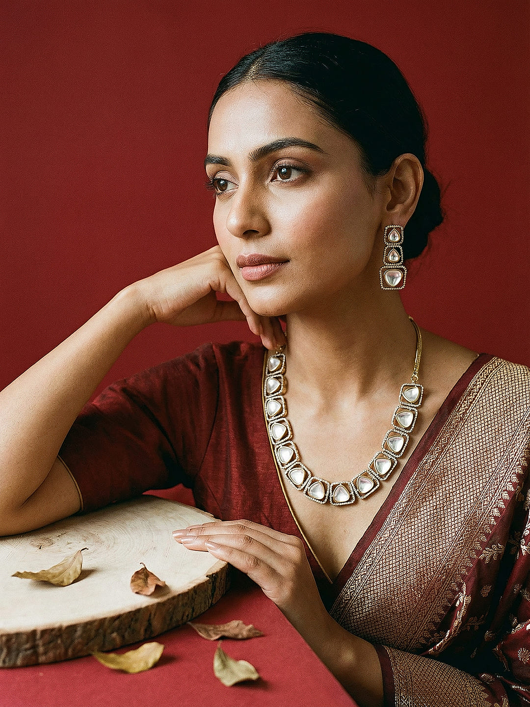 Make a statement of royal elegance with this Gold-Toned Kundan Polki Square Motif Statement Necklace and Earrings Set. Featuring meticulously crafted square motifs adorned with Kundan and Polki (uncut) stones, this set exudes traditional charm and grandeur. The rich gold-toned finish enhances its regal appeal, making it perfect for weddings, bridal occasions, and festive celebrations.