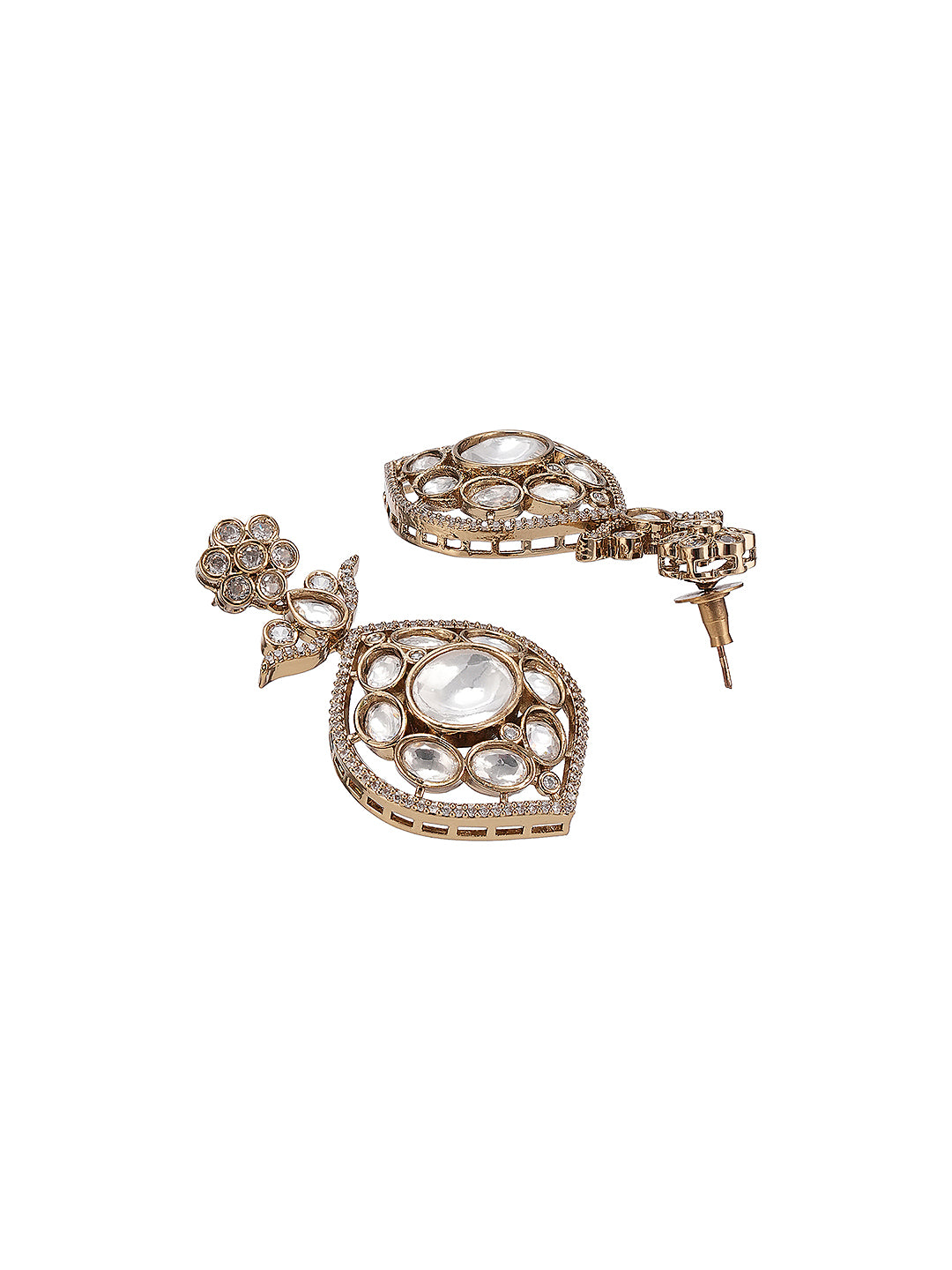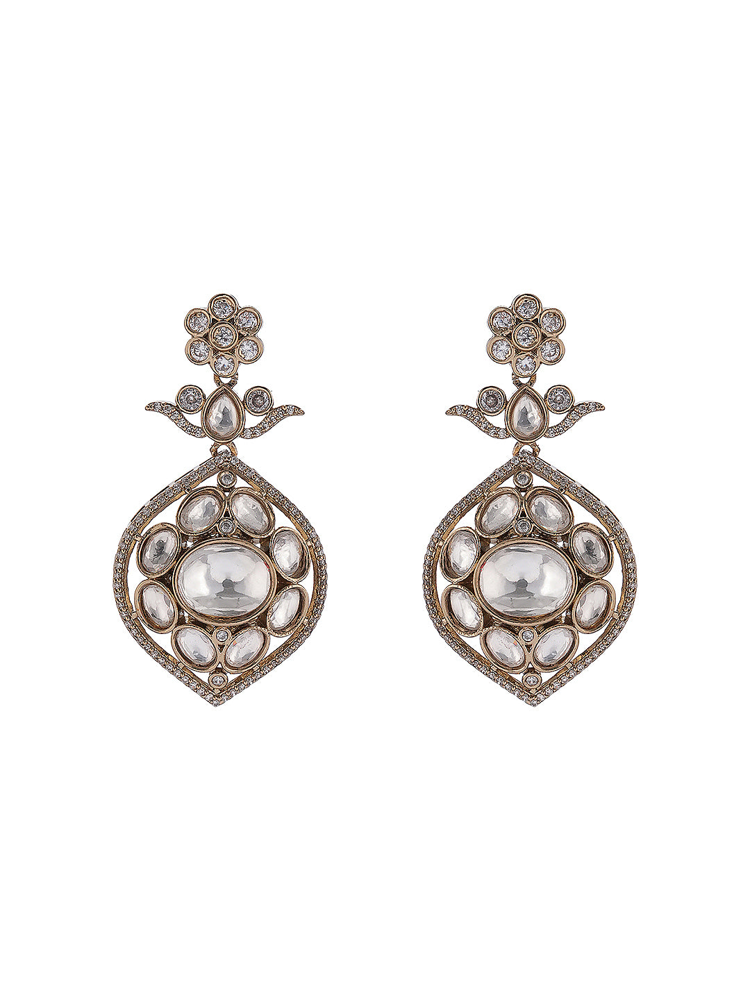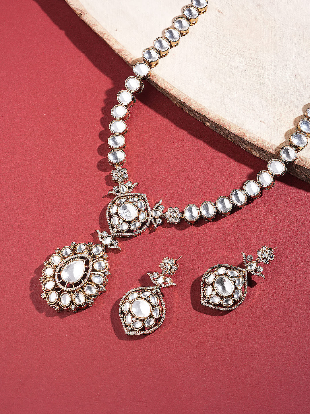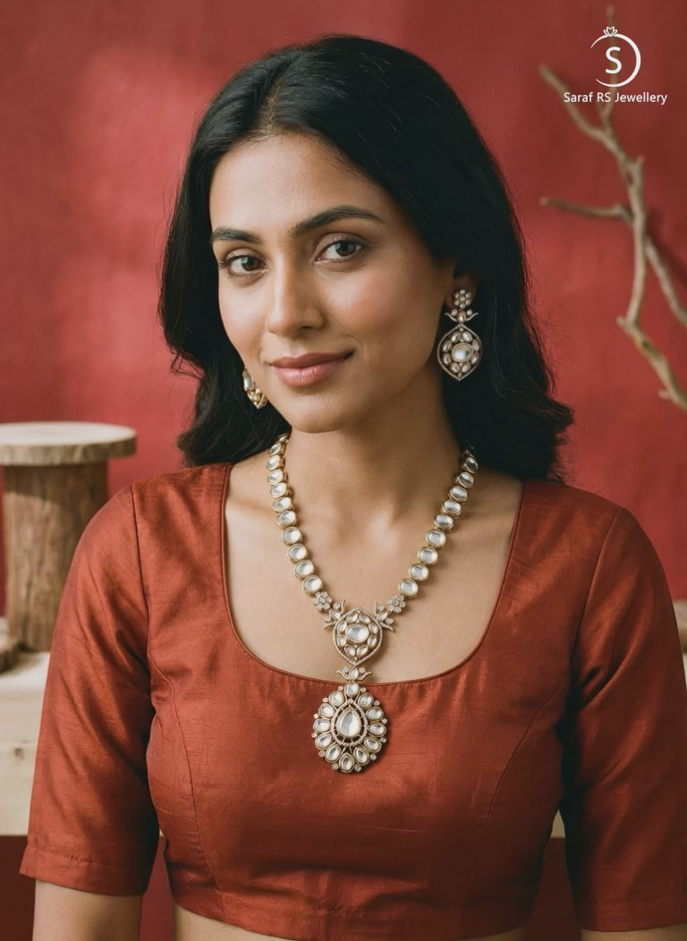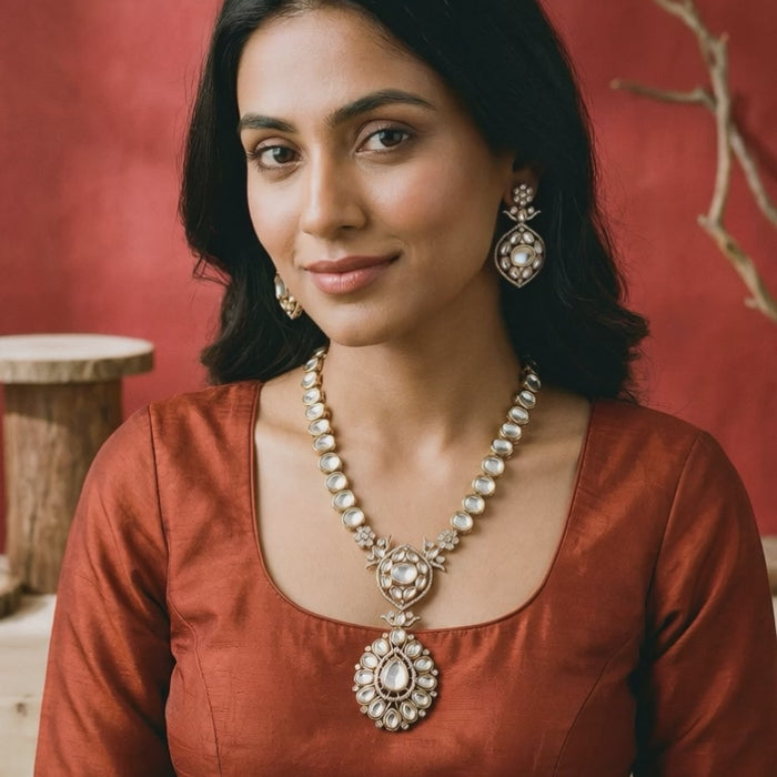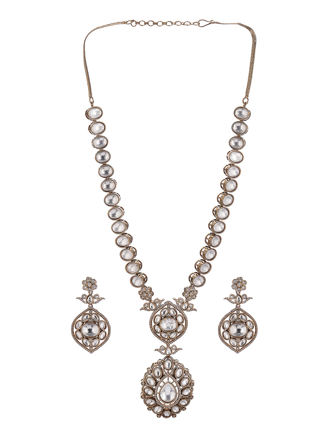 Product Type: Bridal Statement Jewellery Set Design: Kundan Uncut Polki Jadau Material: Brass Plating: Gold Toned Stone Type: Kundan, Polki (Uncut Stones) Stone Color: White / Transparent Necklace Type: Statement Necklace Closure: Adjustable / Hook Occasion: Wedding, Bridal, Festive Style: Traditional, Regal Package Contains: 1 Necklace, 1 Pair of Earrings