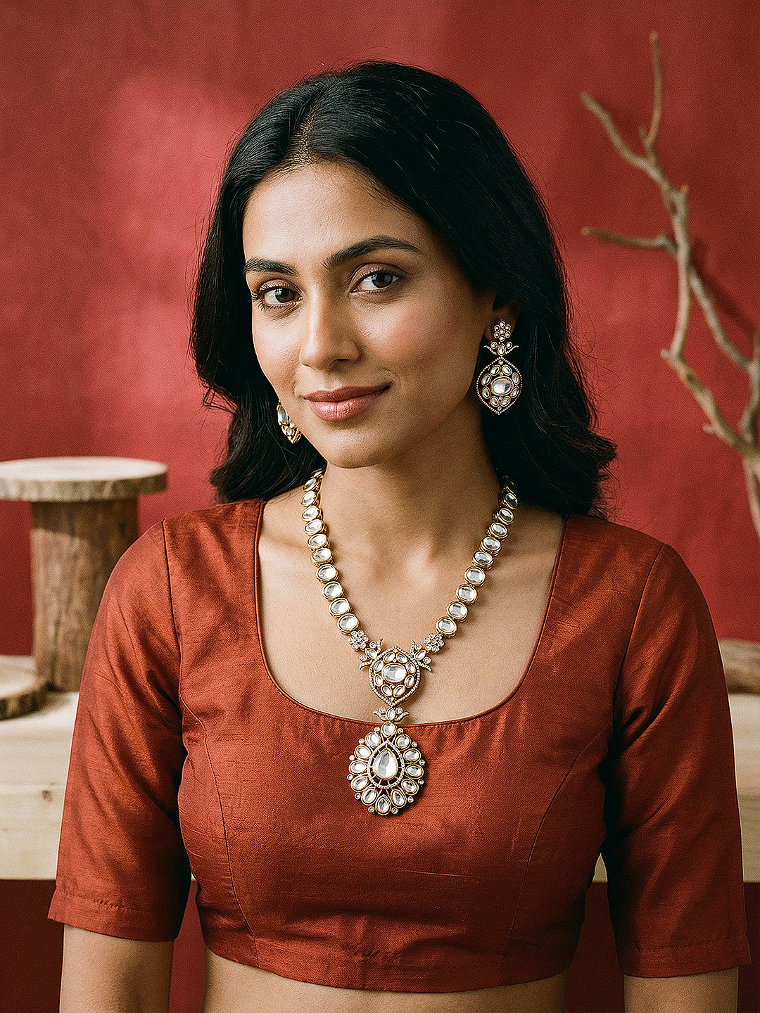 Make your bridal look truly regal with this Gold Toned Kundan Uncut Polki Jadau Bridal Statement Jewellery Set. Featuring exquisite Kundan and uncut Polki stones, the necklace is meticulously crafted to create a grand, statement-making design. The rich gold-toned finish enhances its traditional elegance, making it perfect for weddings, engagements, and festive celebrations.