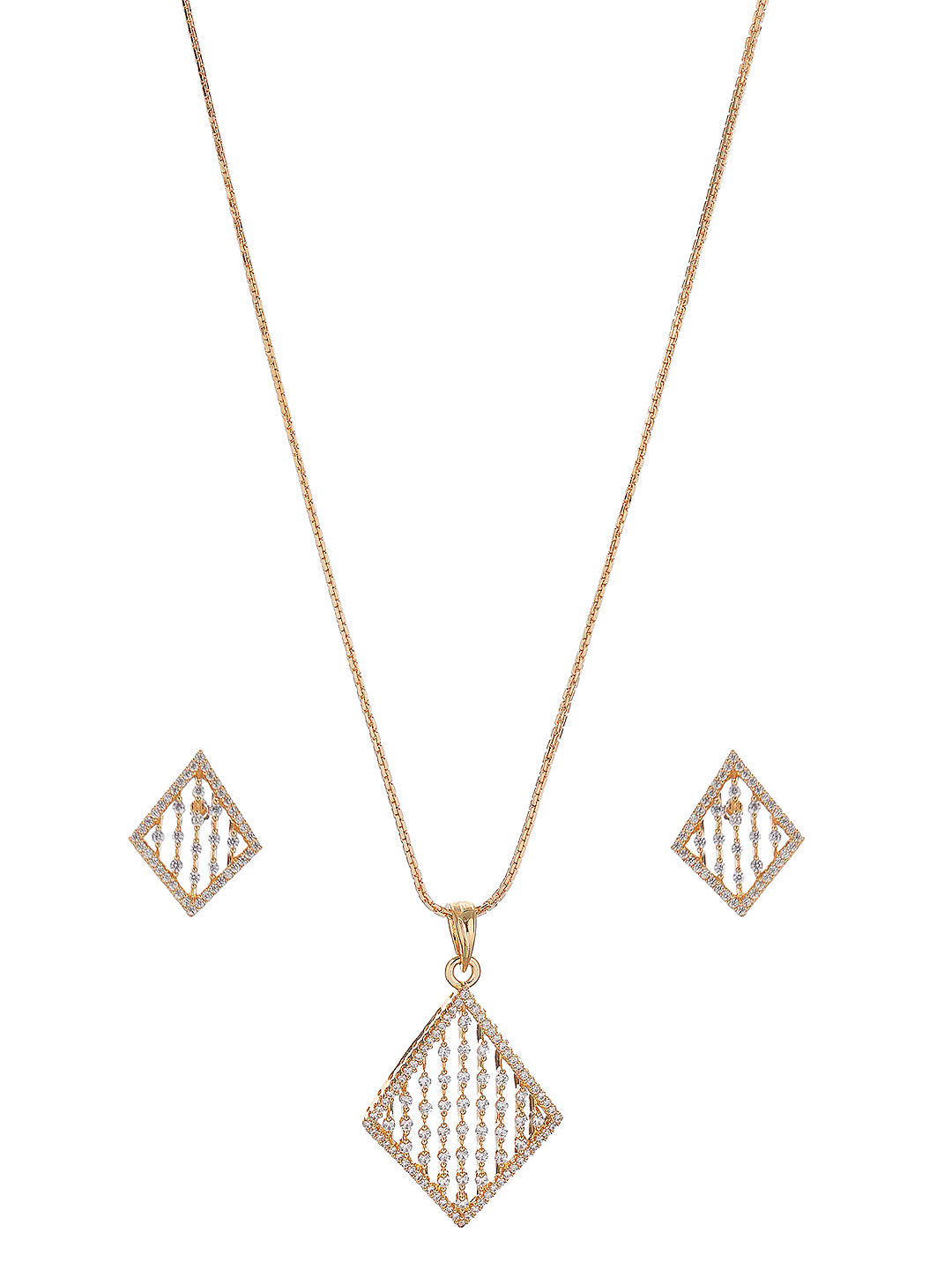 Product Type: Pendant Jewellery Set Design: Geometric, Delicate Material: Brass Plating: Gold Toned Stone Type: AD Zircon Stone Color: White Pendant Type: Delicate Geometric Pendant Closure: Lobster Clasp Occasion: Casual, Party, Festive Style: Minimal, Contemporary Package Contains: 1 Pendant Necklace, 1 Pair of Earrings