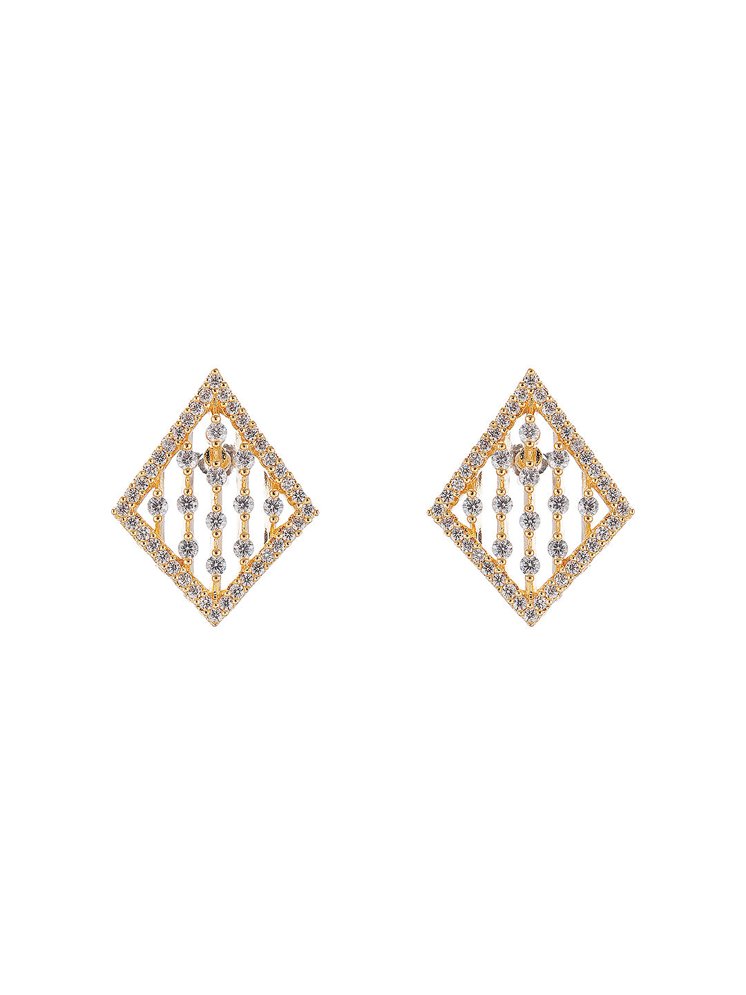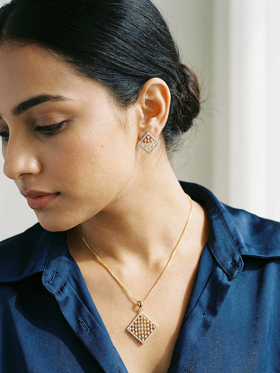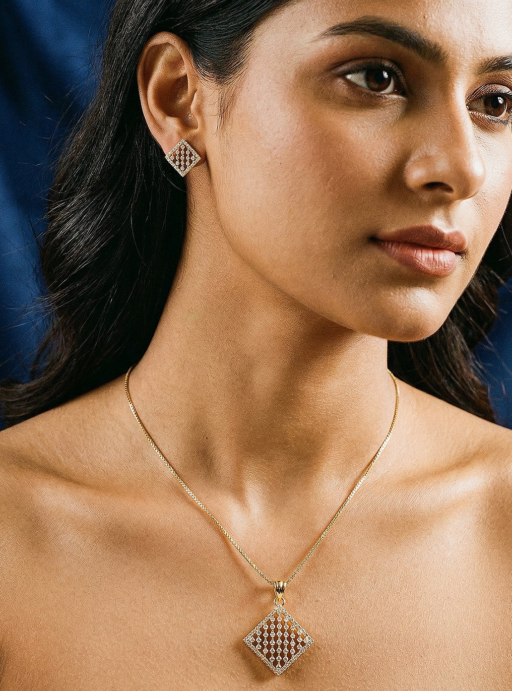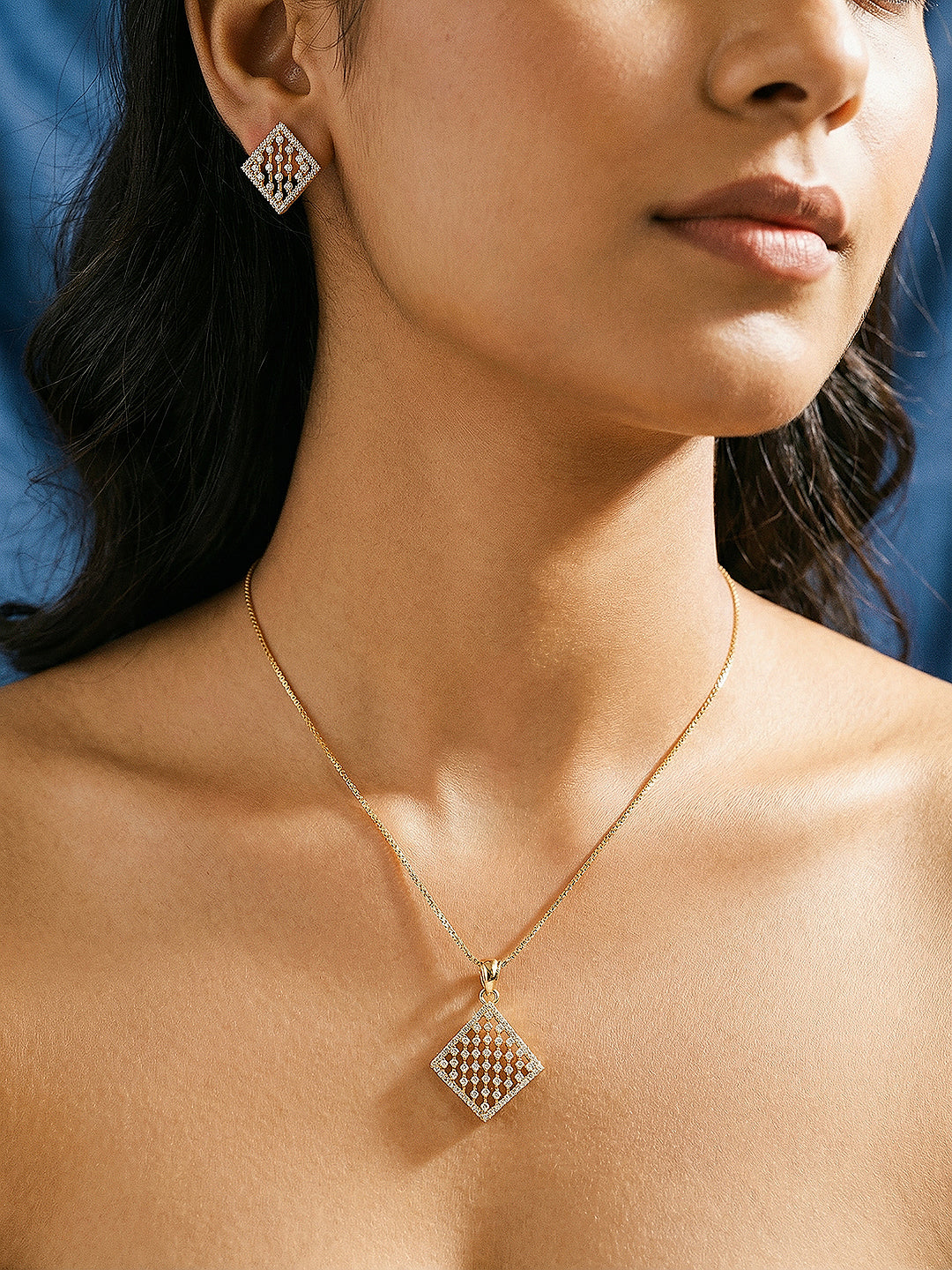 Featuring a sleek geometric pendant adorned with sparkling white AD zircon stones, this set exudes contemporary elegance and subtle charm. The gold-toned finish enhances its refined appeal, making it perfect for casual outings, parties, and festive occasions. A pair of matching stud earrings, each secured with a post-and-back closure