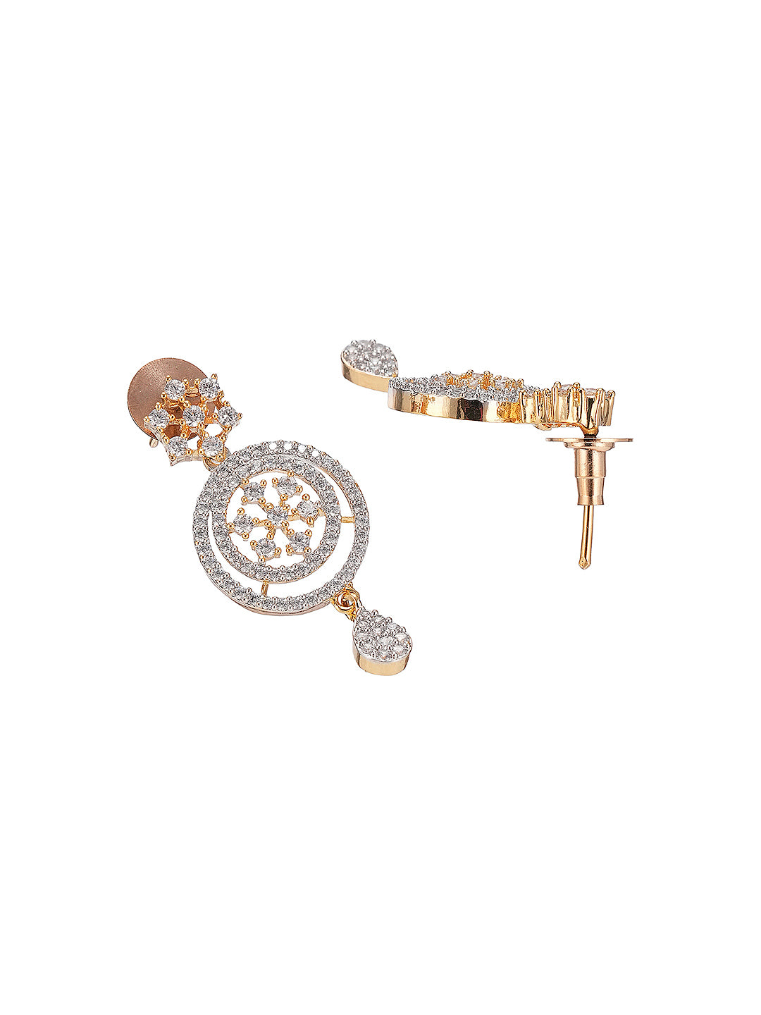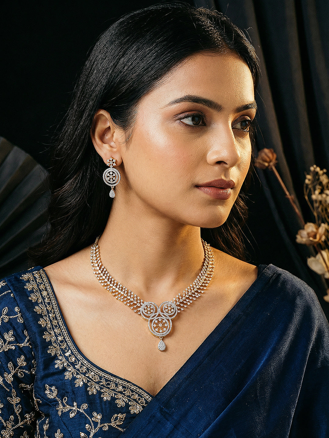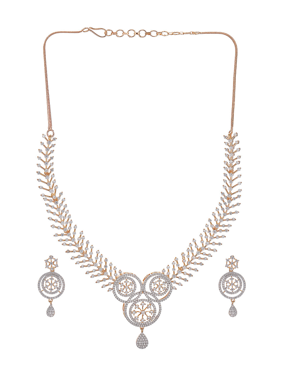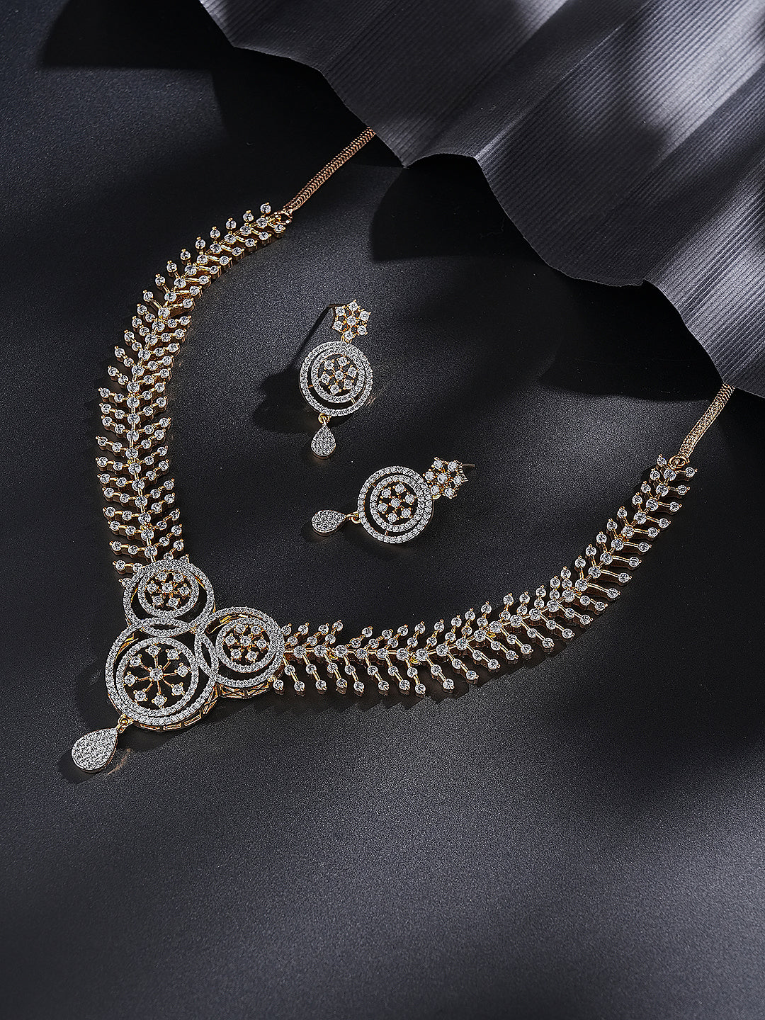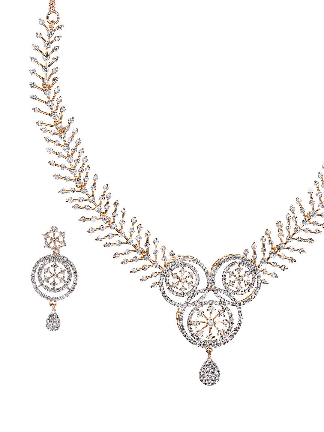 Product Type: Statement Jewellery Set Design: Floral Motif Material: Brass Plating: Gold Toned Stone Type: AD Zircon Stone Color: White Necklace Type: Statement Necklace Closure: Lobster Clasp Occasion: Party, Wedding, Festive Style: Contemporary, Statement Package Contains: 1 Necklace, 1 Pair of Earrings