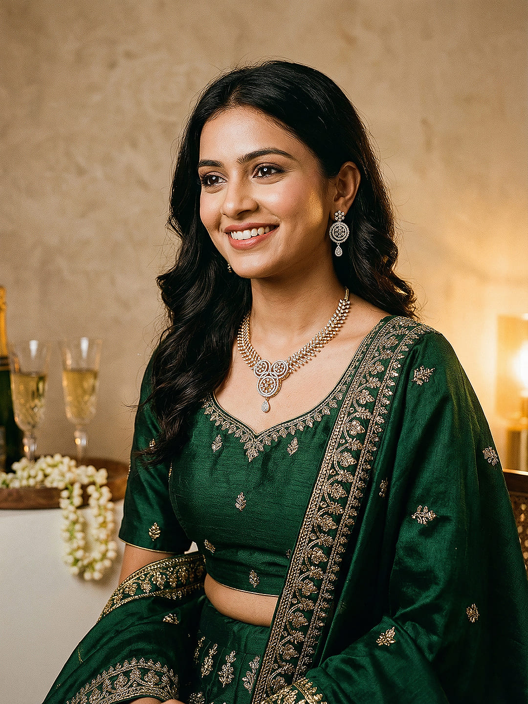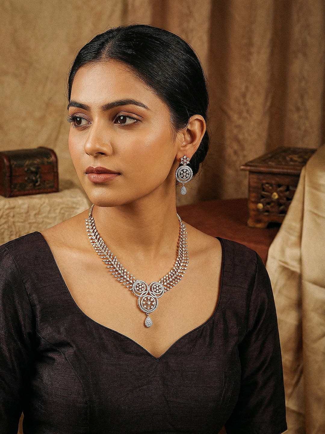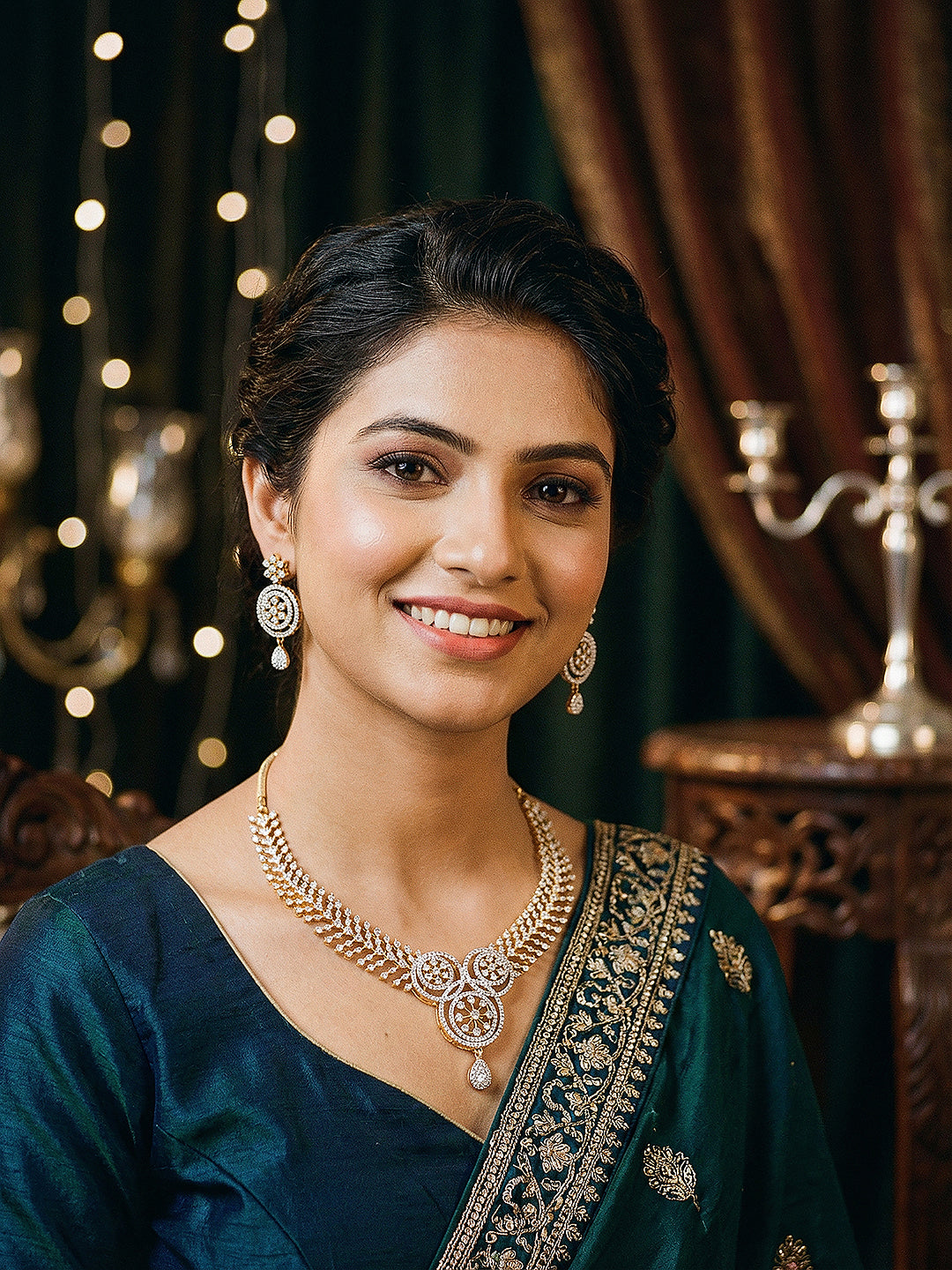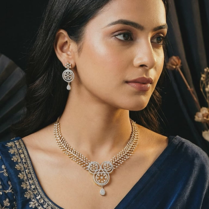 Featuring a beautifully crafted floral design, the necklace is adorned with sparkling white AD zircon stones that catch the light with every movement. The rich gold-toned finish enhances its luxurious appeal, making it perfect for parties, weddings, and festive occasions.
