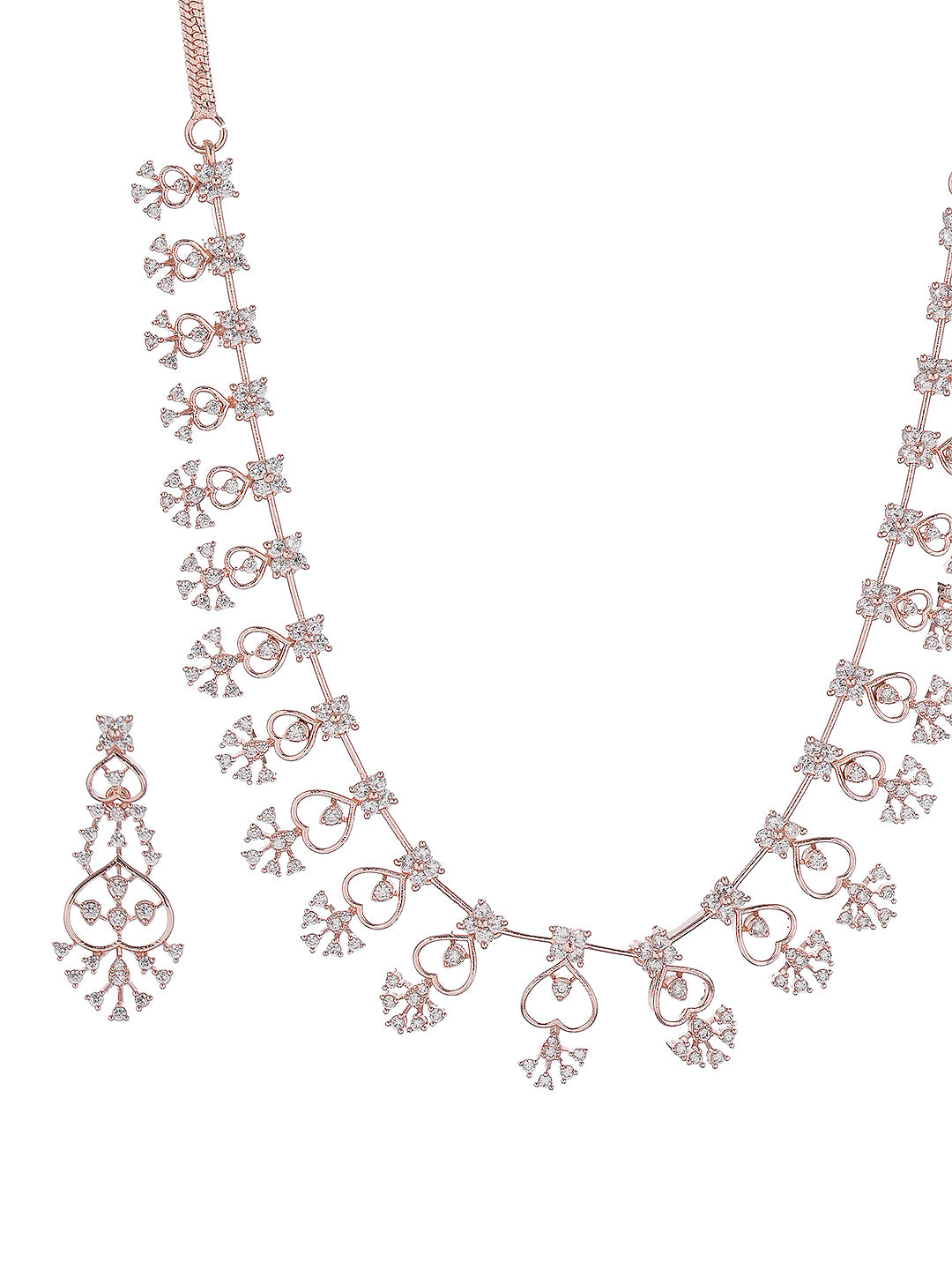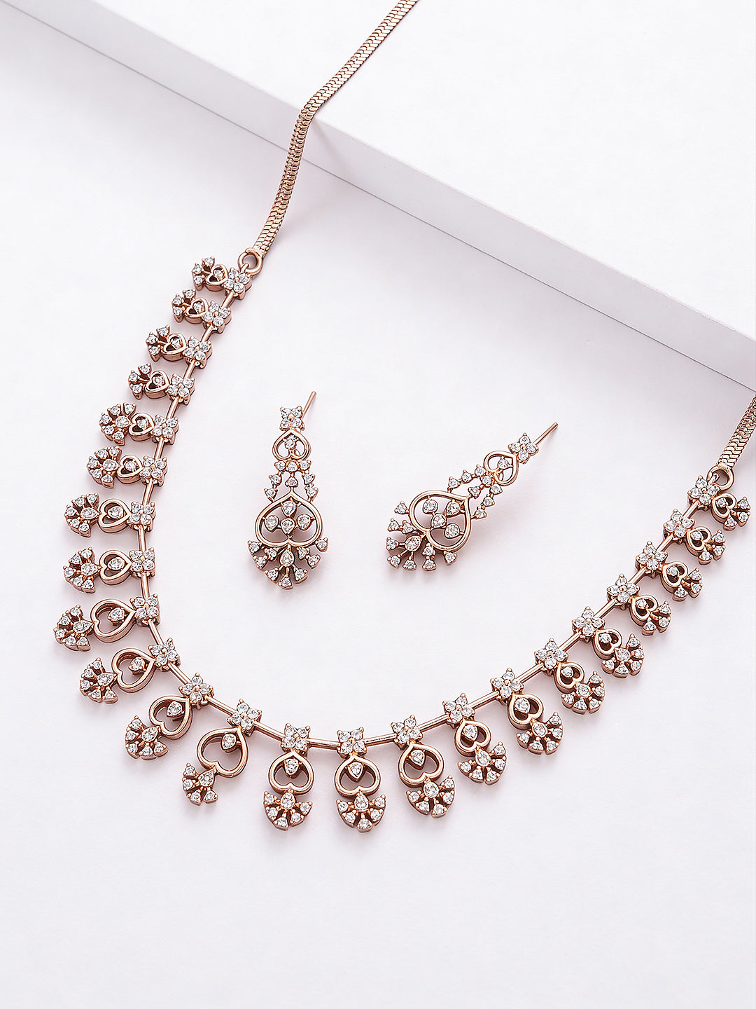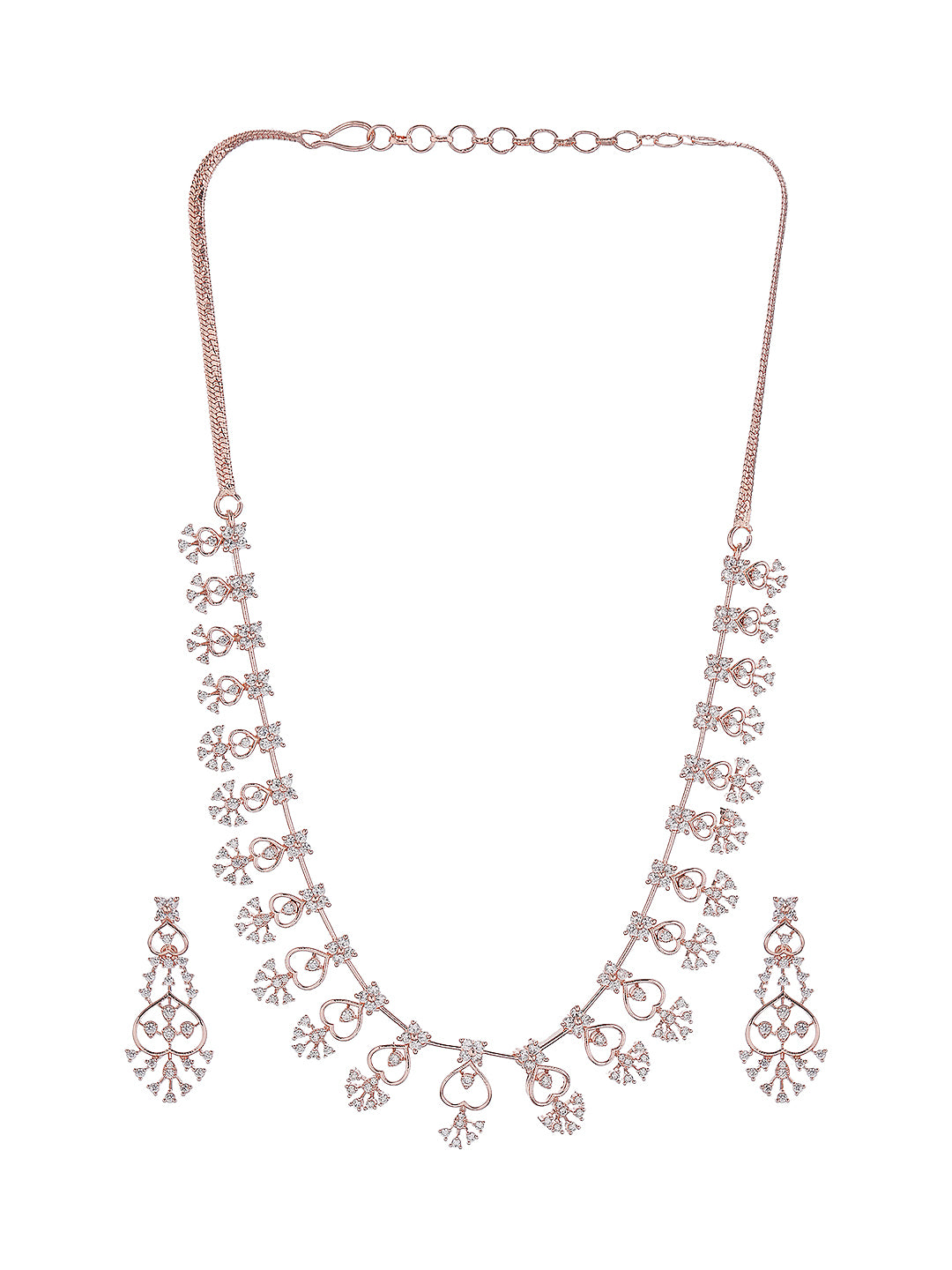 Product Type: Jewellery Set Design: Elegant / Classic Material: Brass Plating: Rose Gold Plated Stone Type: AD Zircon Stone Color: White Necklace Type: Elegant Necklace Closure: Lobster Clasp Occasion: Party, Wedding, Festive Style: Contemporary, Elegant Package Contains: 1 Necklace, 1 Pair of Earrings