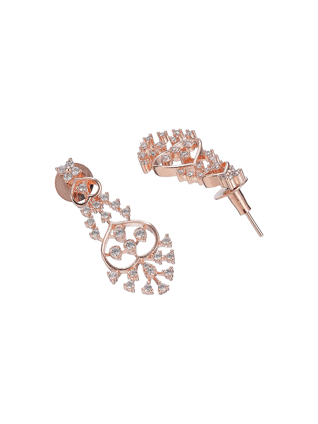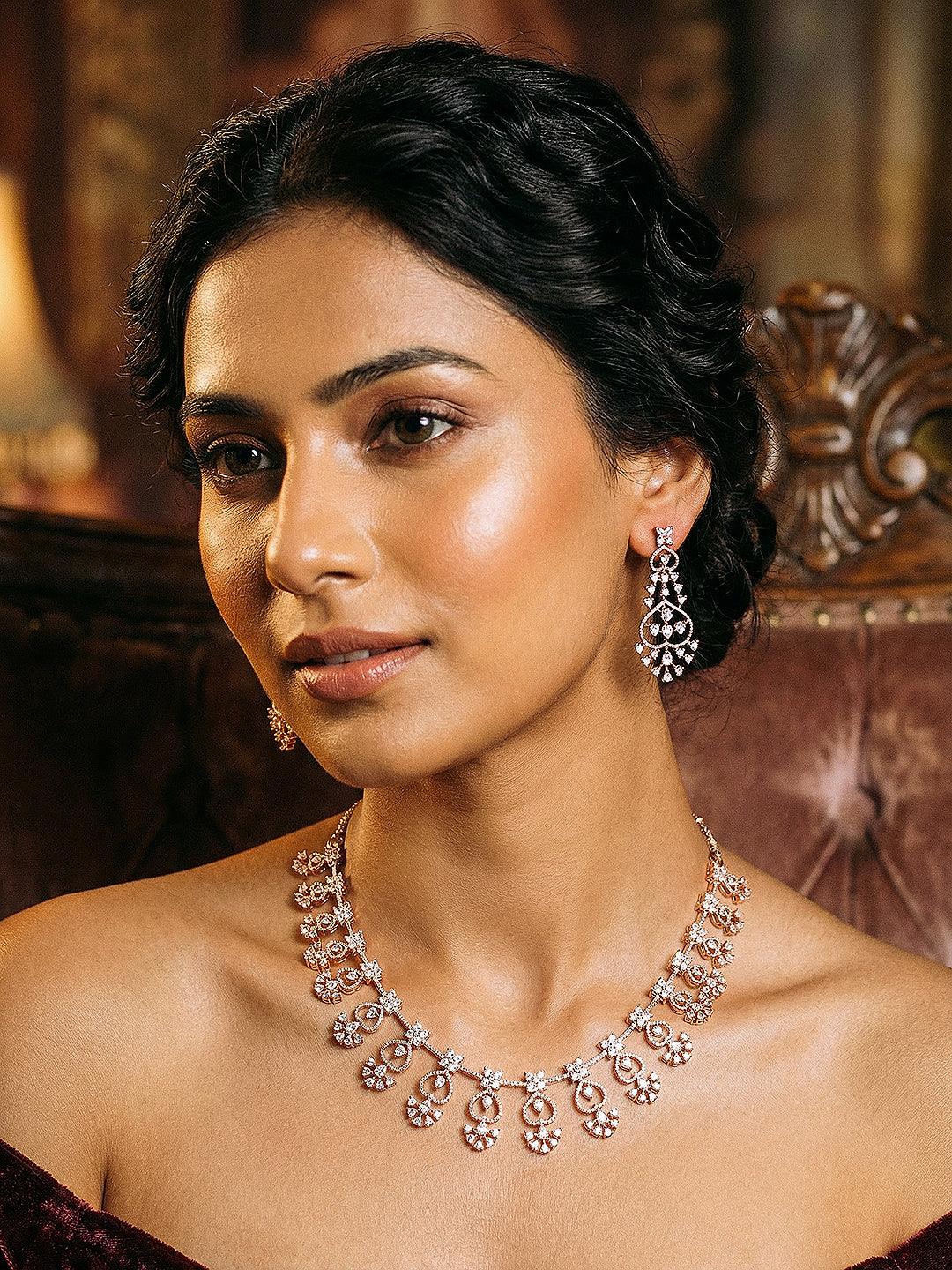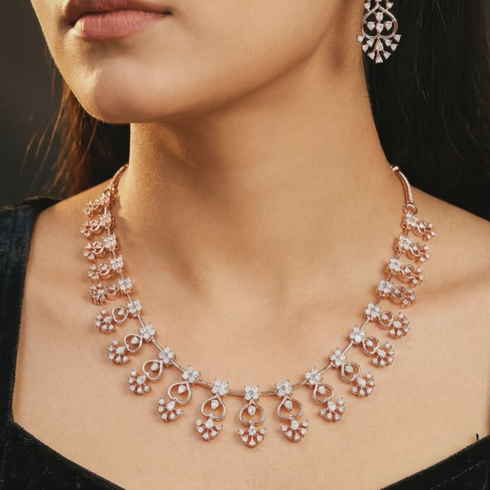 Product Type: Jewellery Set Design: Elegant / Classic Material: Brass Plating: Rose Gold Plated Stone Type: AD Zircon Stone Color: White Necklace Type: Elegant Necklace Closure: Lobster Clasp Occasion: Party, Wedding, Festive Style: Contemporary, Elegant Package Contains: 1 Necklace, 1 Pair of Earrings