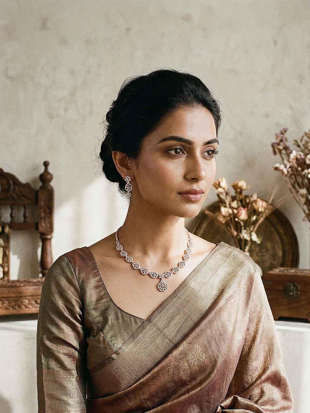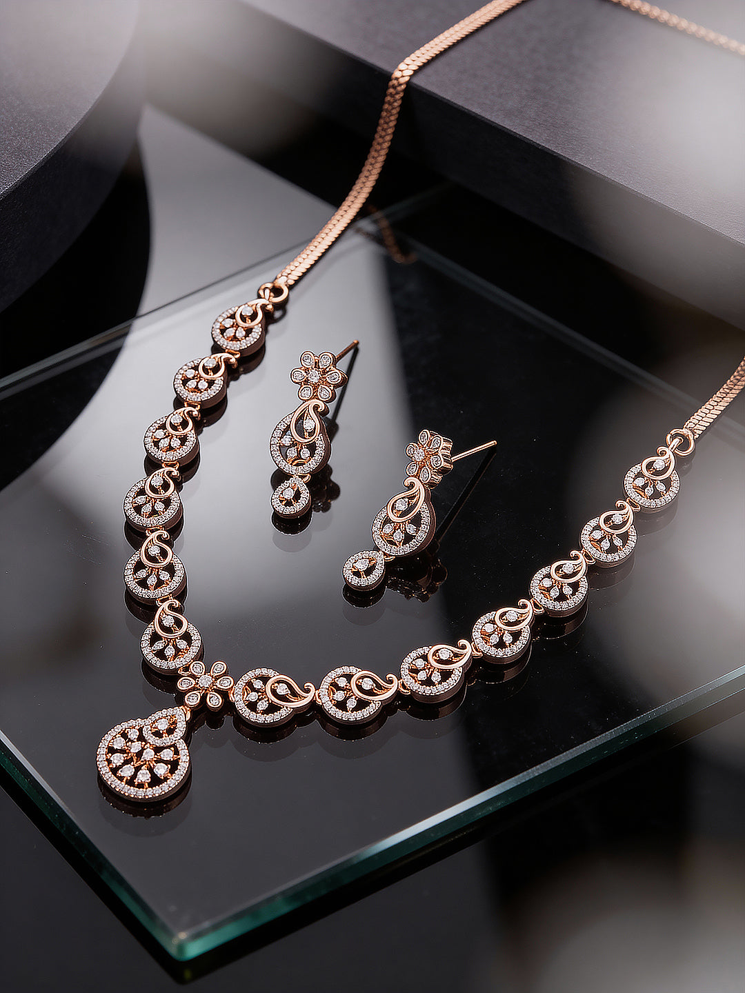 Featuring an intricate mango-inspired design, the necklace is adorned with sparkling white AD zircon stones that add a refined brilliance. The elegant rose-toned finish enhances its contemporary appeal, making it perfect for weddings, parties, and festive occasions.