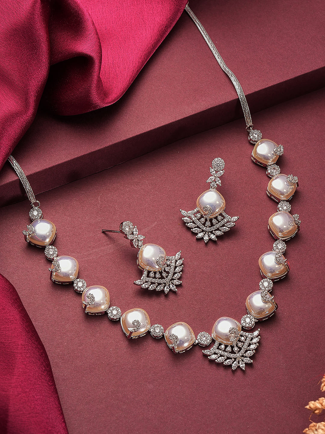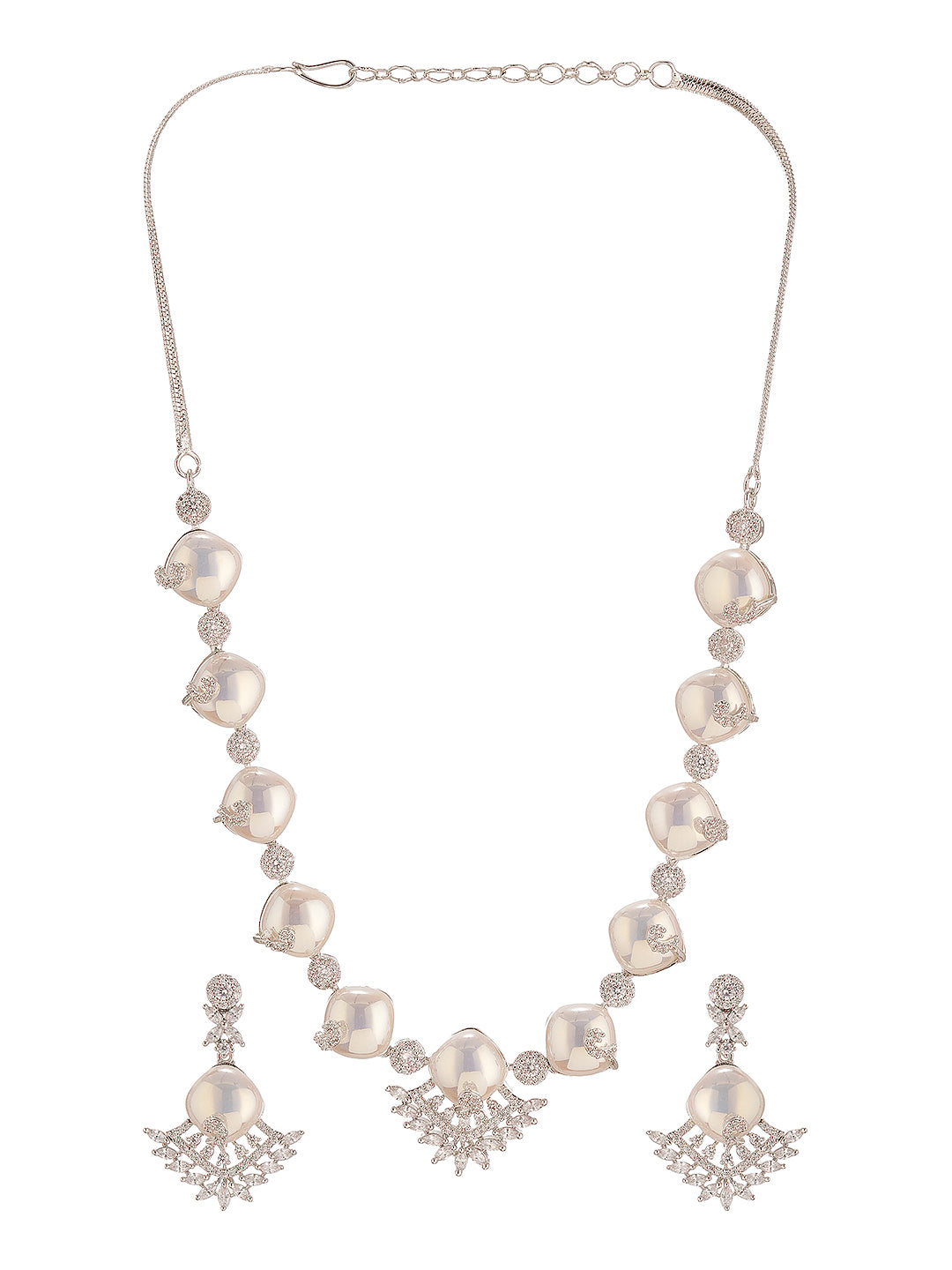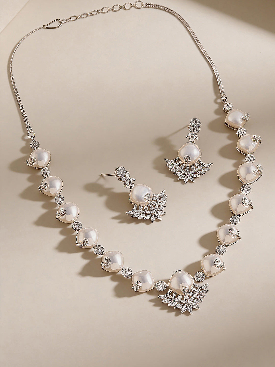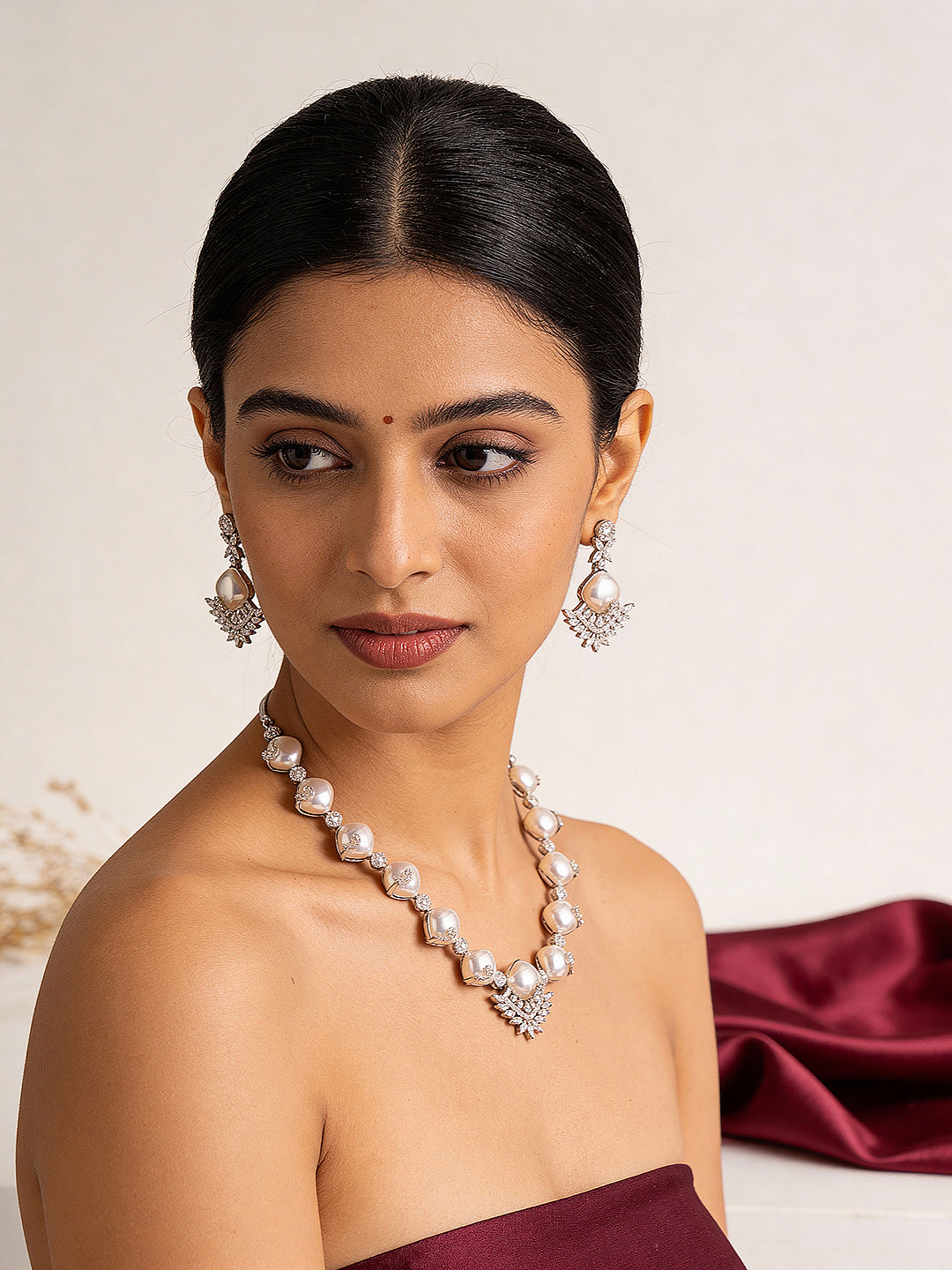 Product Type: Designer Cocktail Jewellery Set Design: Contemporary Material: Alloy Plating : Silver Plated Stone Type: AD (American Diamond), Pearl Stone Color: White Necklace Type: Statement / Cocktail Necklace Closure: Lobster Clasp Occasion: Party, Cocktail, Evening, Festive Style: Contemporary, Glam, Designer Package Contains: 1 Necklace, 1 Pair of Earrings