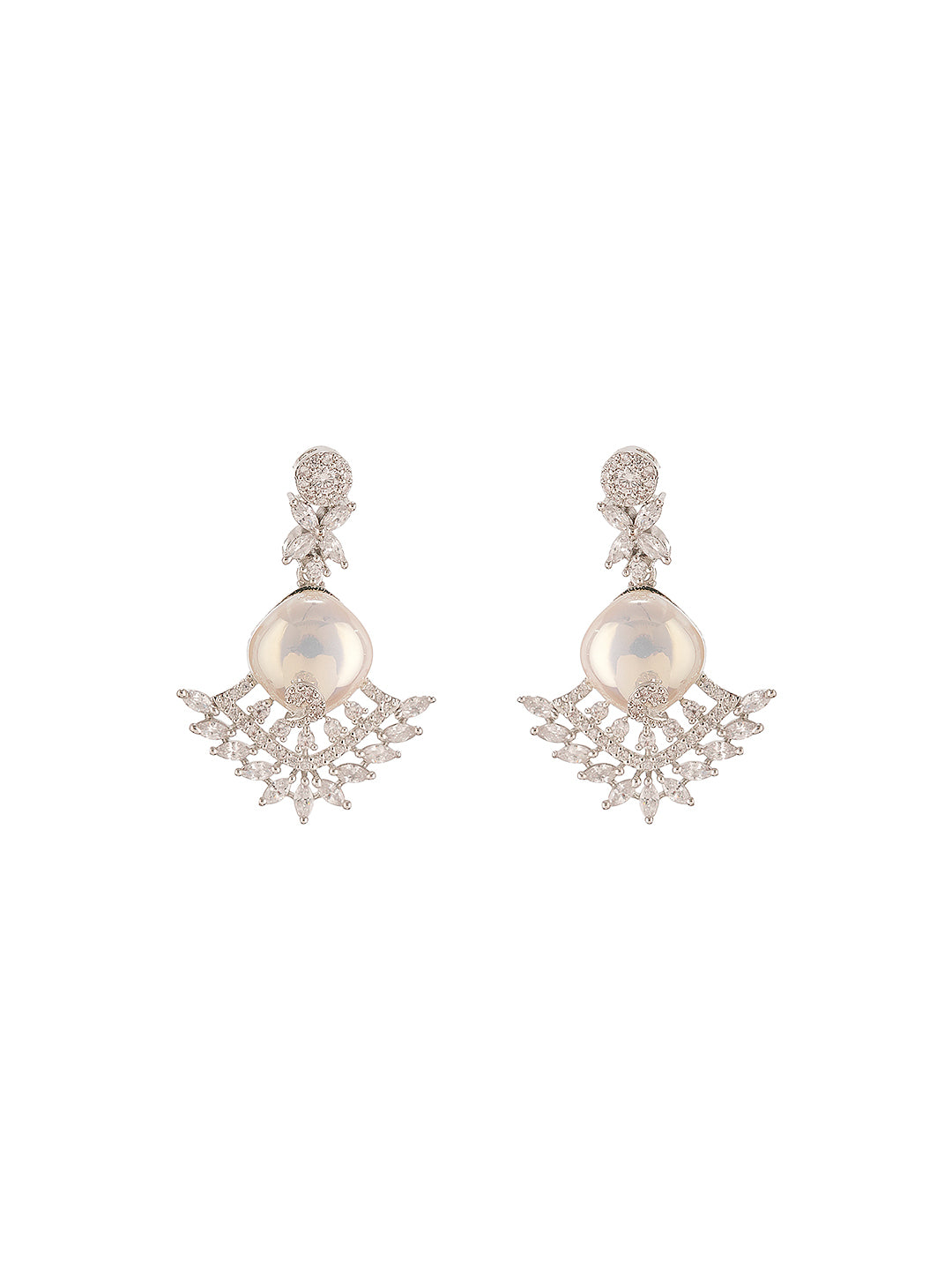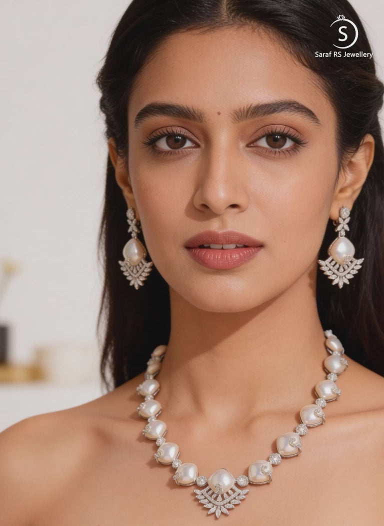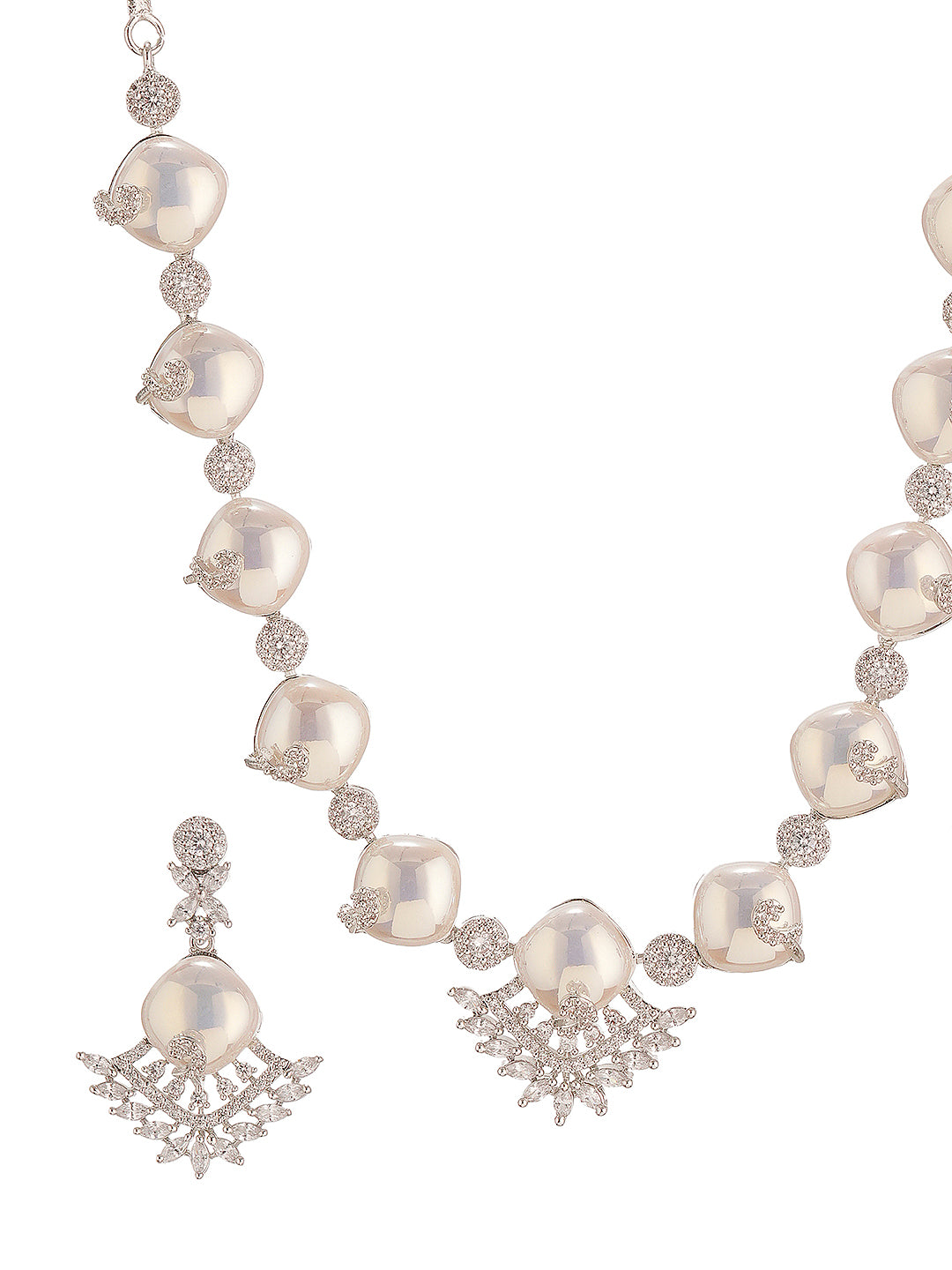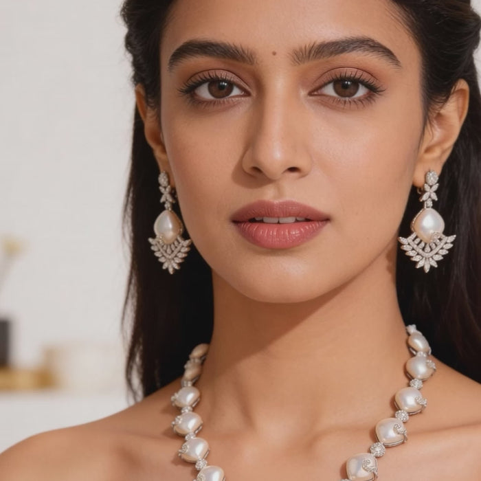 Product Type: Designer Cocktail Jewellery Set Design: Contemporary Material: Alloy Plating : Silver Plated Stone Type: AD (American Diamond), Pearl Stone Color: White Necklace Type: Statement / Cocktail Necklace Closure: Lobster Clasp Occasion: Party, Cocktail, Evening, Festive Style: Contemporary, Glam, Designer Package Contains: 1 Necklace, 1 Pair of Earrings