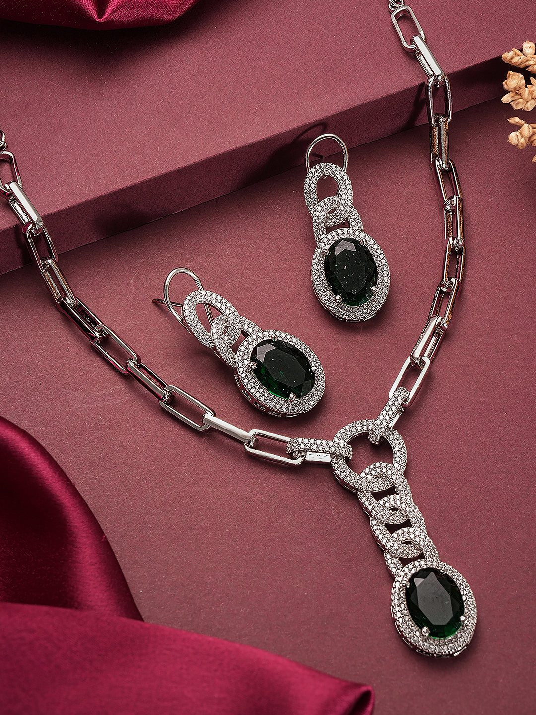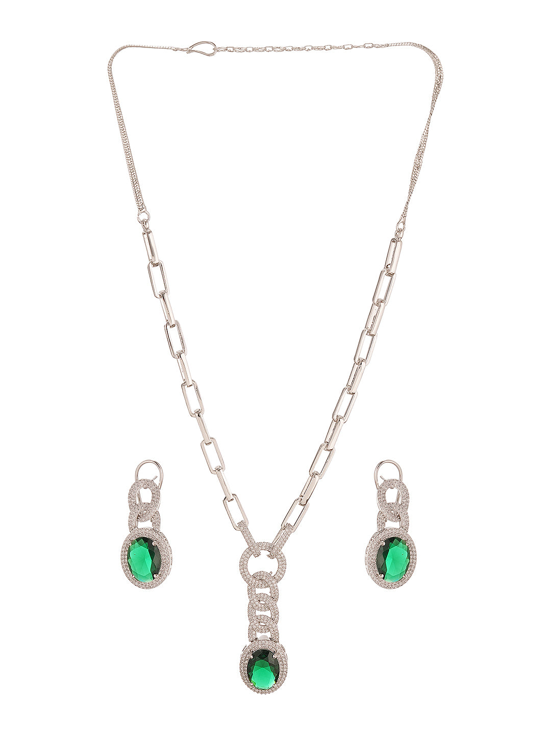 Product Type: Cocktail Jewellery Set Design: Statement Material: Alloy Plating : Silver Plated Stone Type: AD (American Diamond) Stone Color: Emerald Green Necklace Type: Link Style Cocktail Necklace Earrings Type: Matching Earrings Closure: Lobster Clasp Occasion: Party, Cocktail, Evening, Festive Style: Contemporary, Glam, Statement Package Contains: 1 Necklace, 1 Pair of Earrings