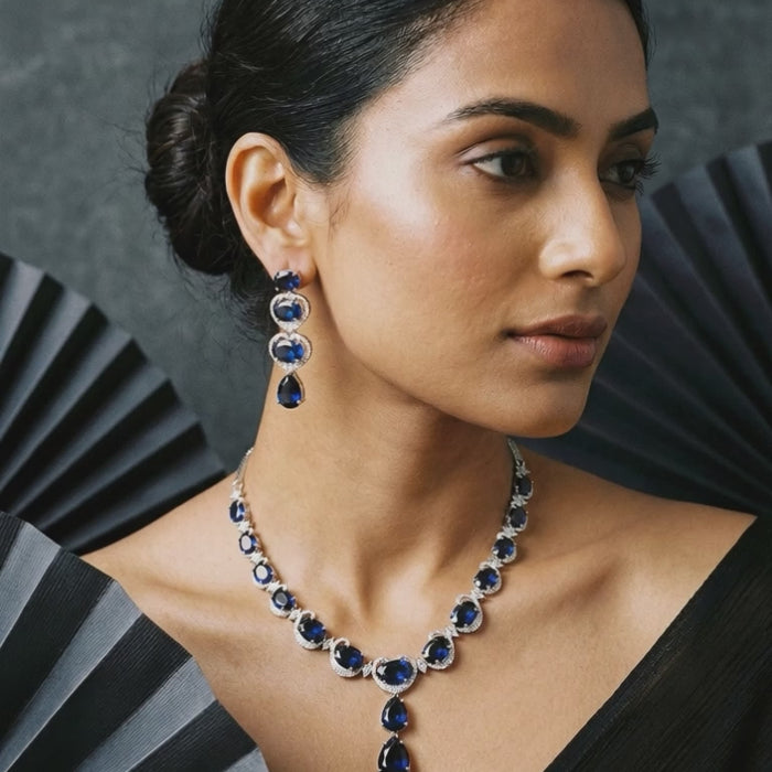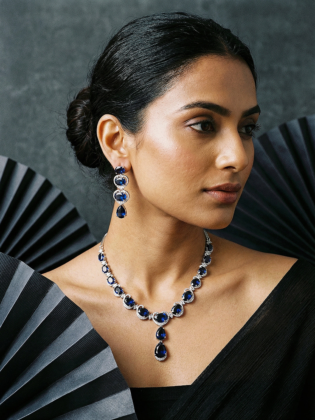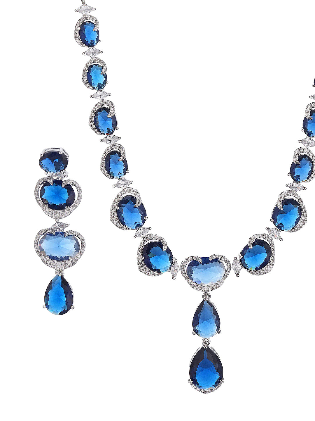 Product Type: Statement Jewellery Set Design: Designer, Cocktail Material: Brass Plating / Finish: Silver Plated Stone Type: AD (American Diamond) Zircon Stone Color: Sapphire Blue Necklace Type: Statement Necklace Closure: Lobster Clasp Occasion: Party, Cocktail, Evening, Festive Style: Contemporary, Designer, Glam Package Contains: 1 Necklace, 1 Pair of Earrings