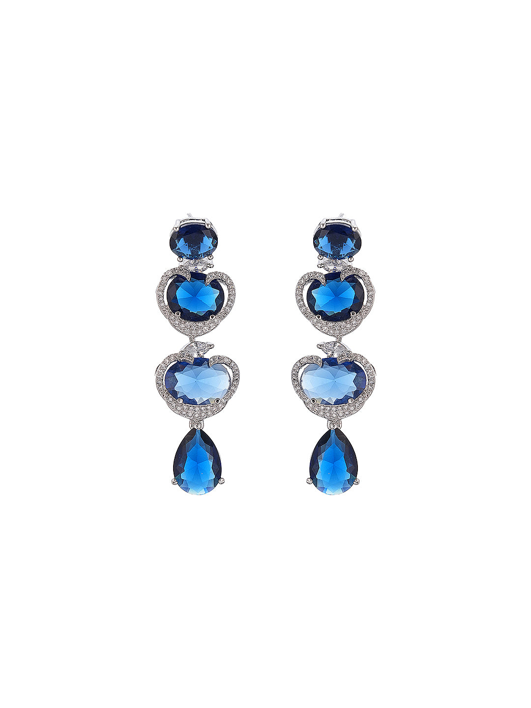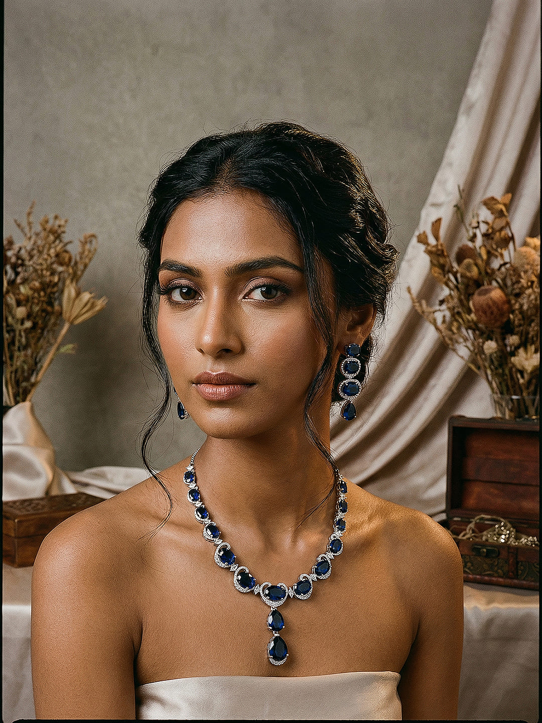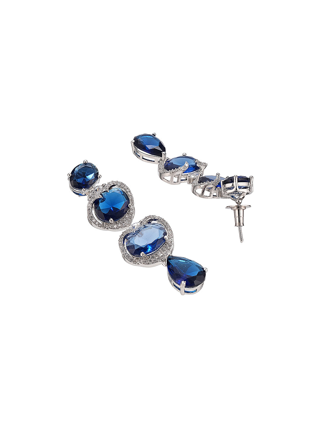 Product Type: Statement Jewellery Set Design: Designer, Cocktail Material: Brass Plating / Finish: Silver Plated Stone Type: AD (American Diamond) Zircon Stone Color: Sapphire Blue Necklace Type: Statement Necklace Closure: Lobster Clasp Occasion: Party, Cocktail, Evening, Festive Style: Contemporary, Designer, Glam Package Contains: 1 Necklace, 1 Pair of Earrings