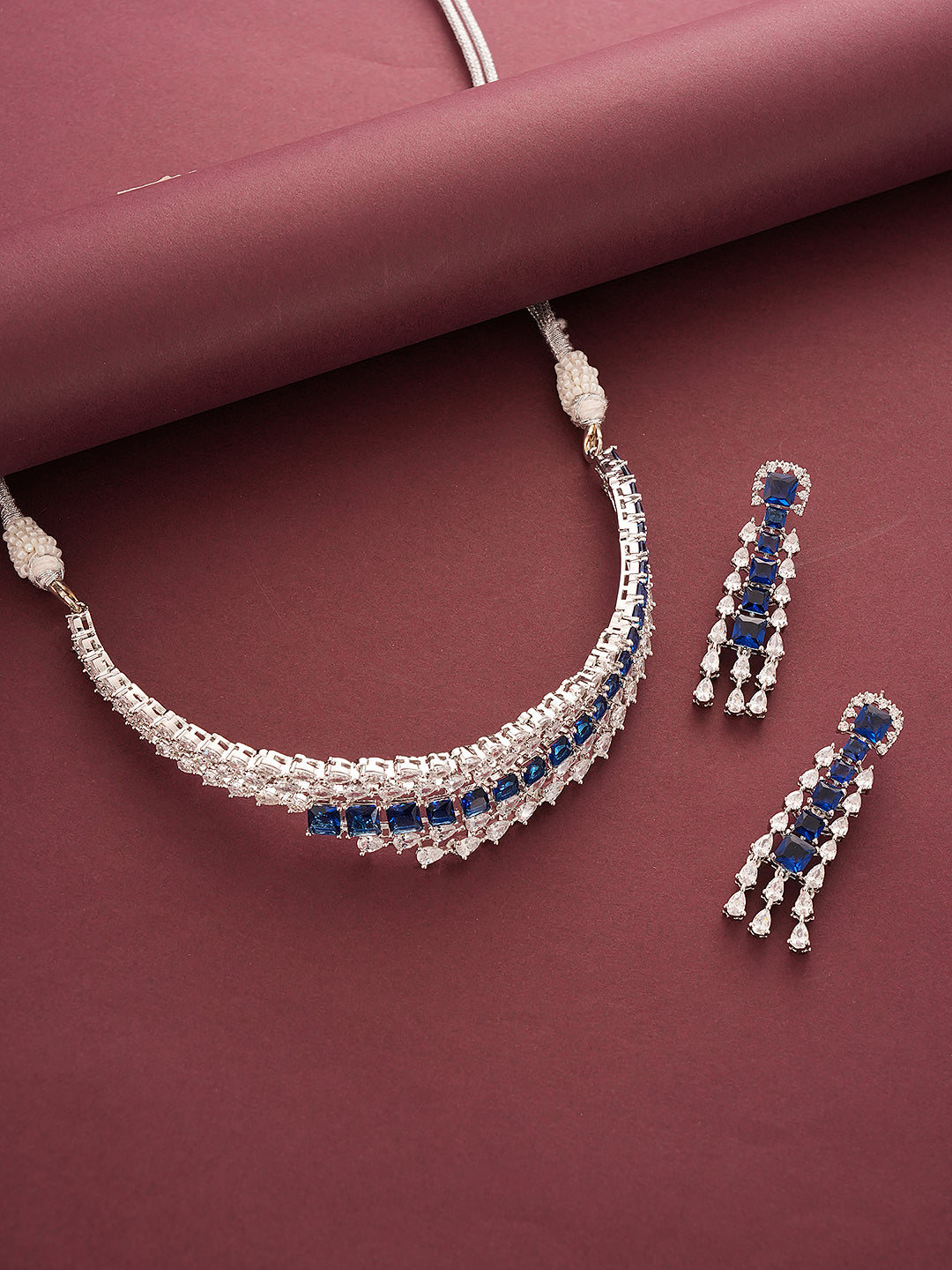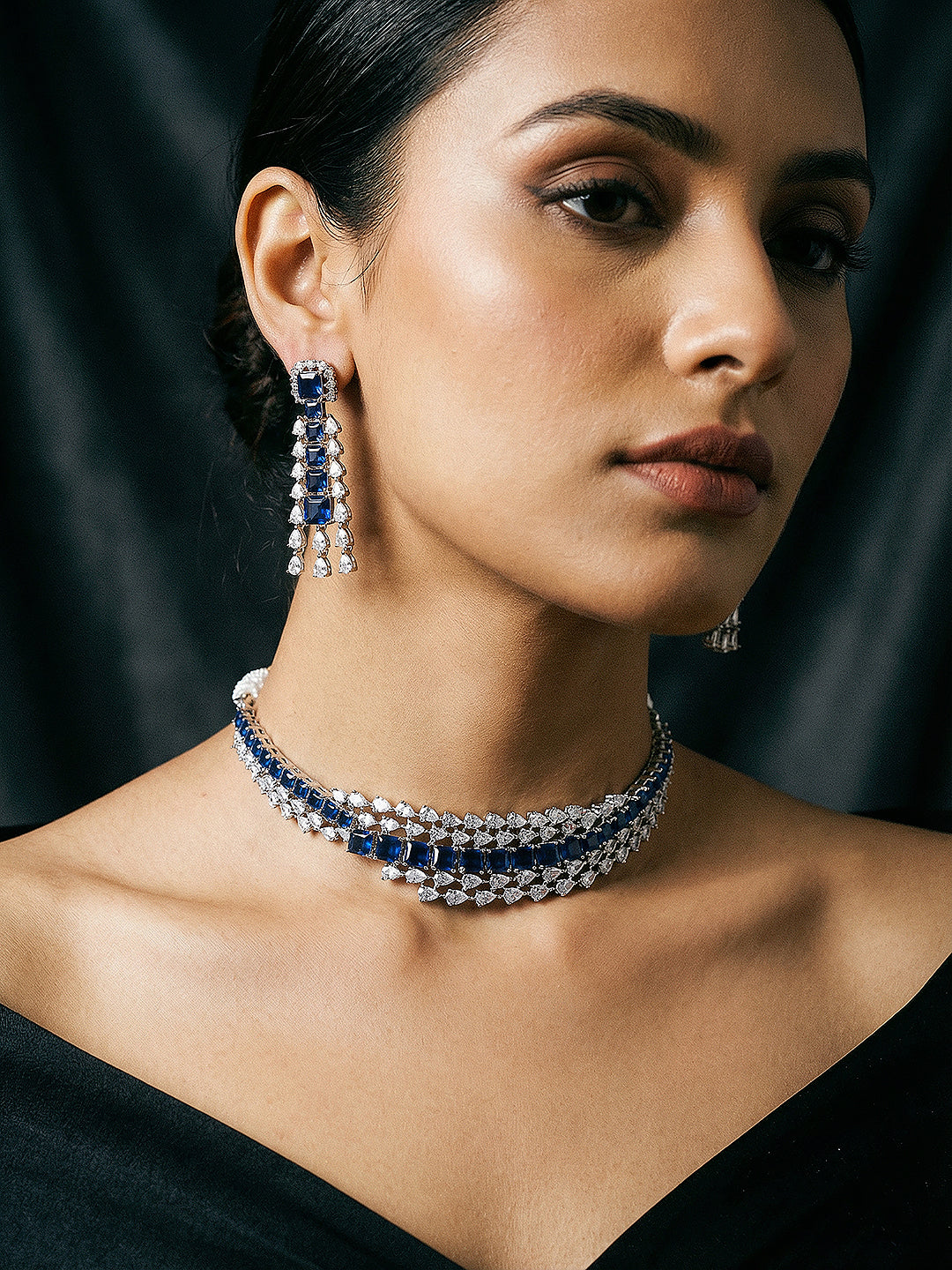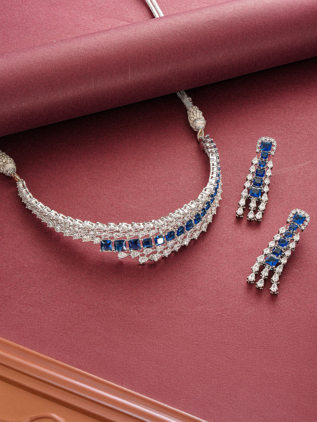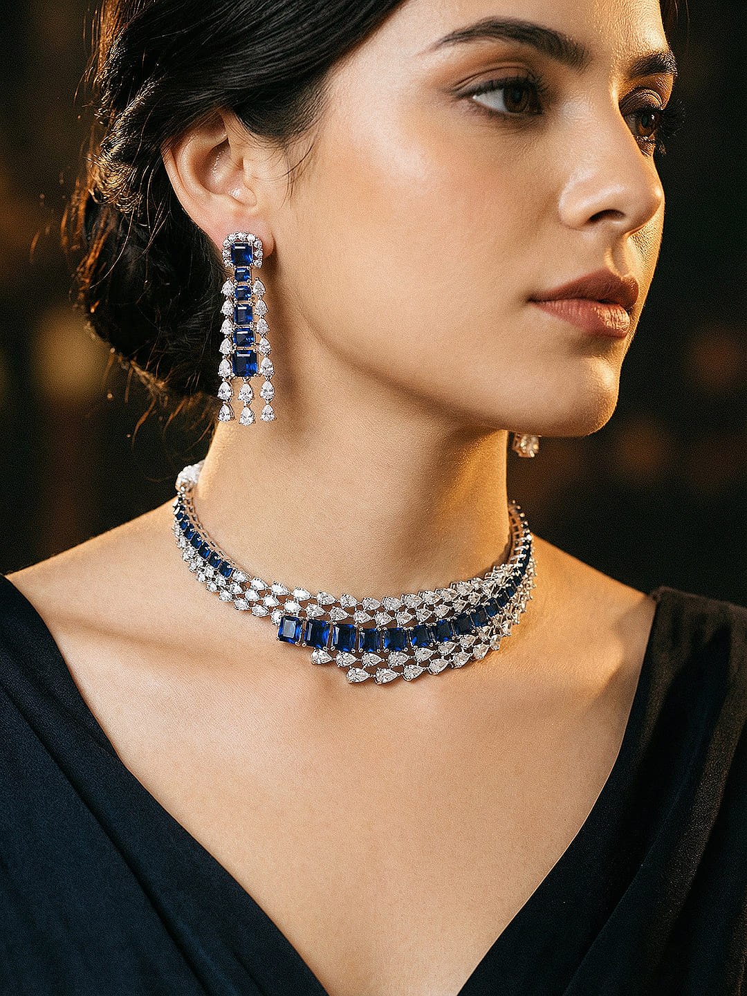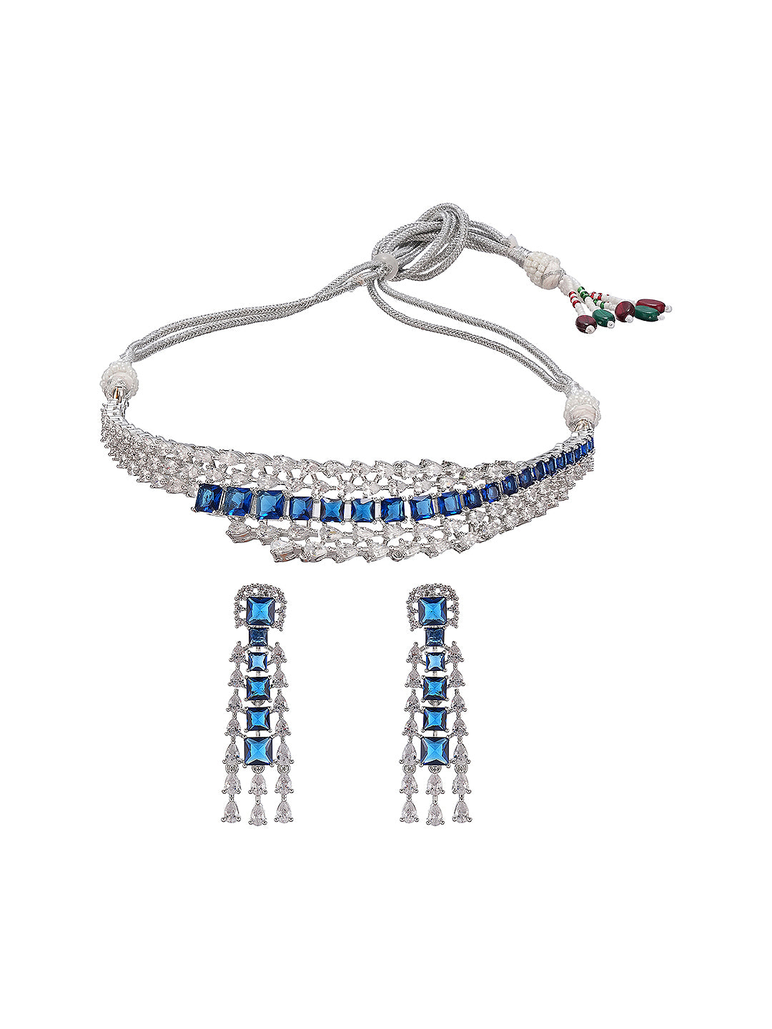 Product Type: Choker Jewellery Set Design: Contemporary Statement Material: Brass Plating: Silver Toned Stone Type: AD (American Diamond) Stone Color: Sapphire Blue Necklace Type: Statement Choker Closure: Lobster Clasp Occasion: Party, Evening, Festive Style: Contemporary, Glam Package Contains: 1 Choker Necklace, 1 Pair of Earrings