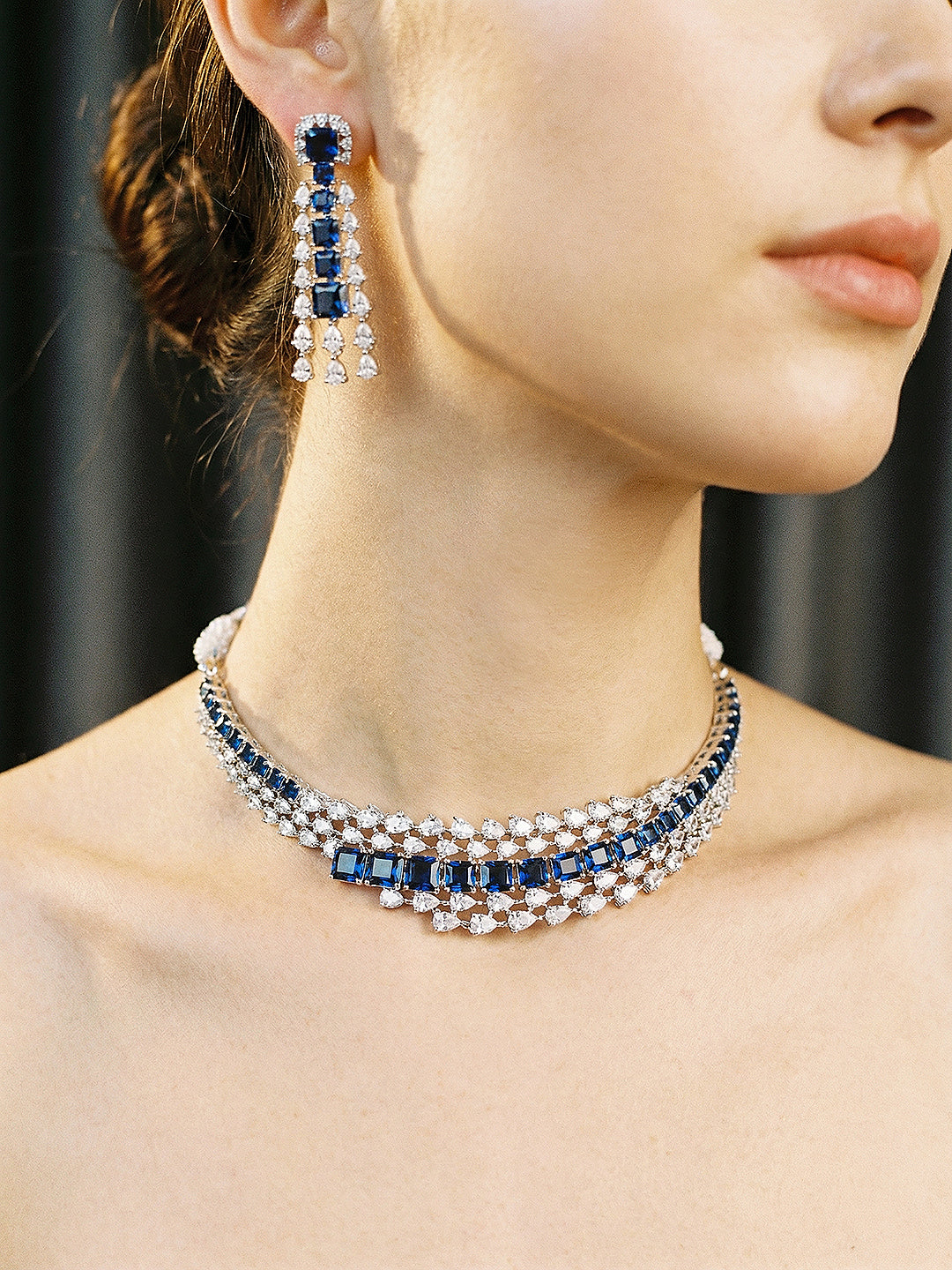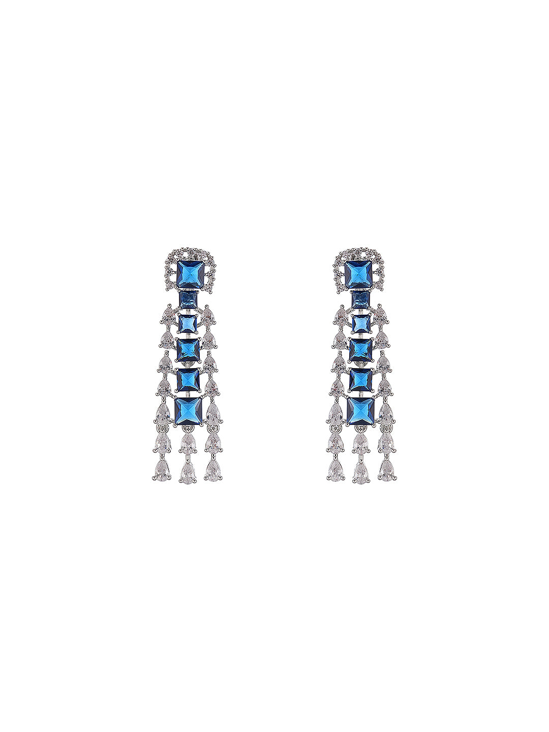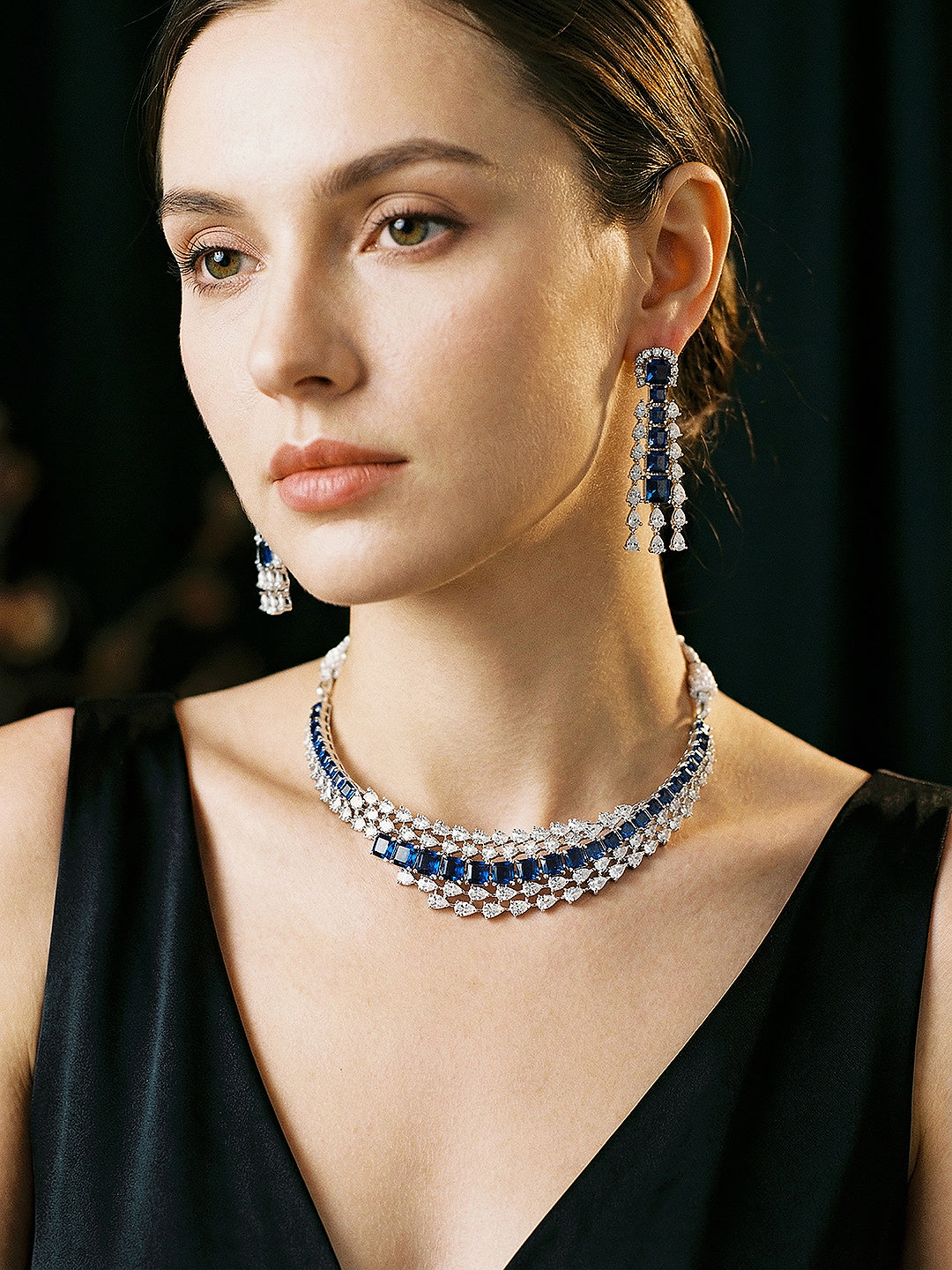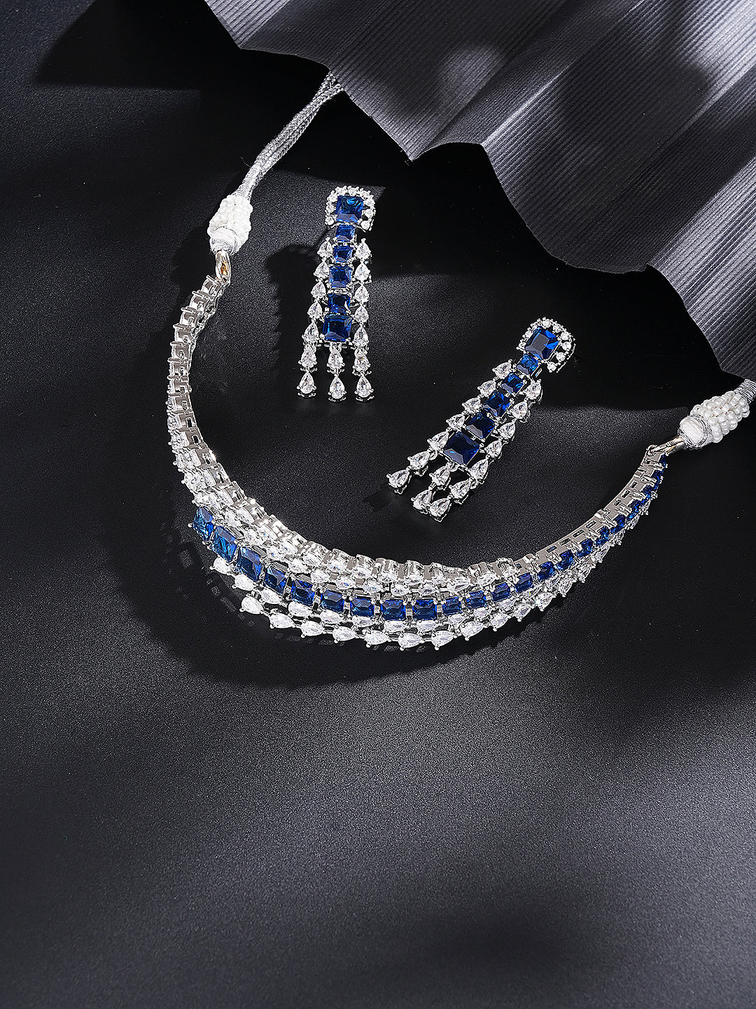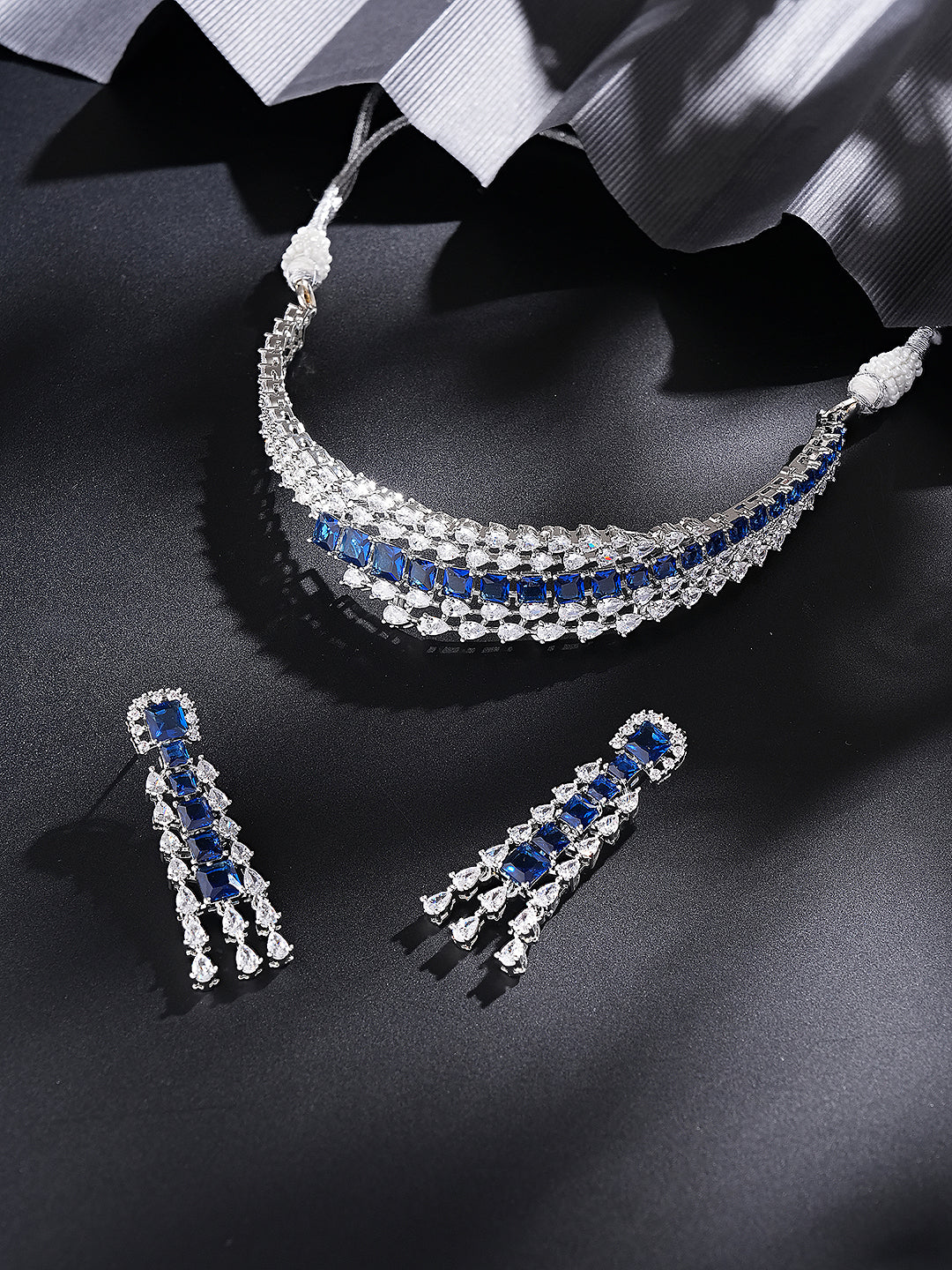 Product Type: Choker Jewellery Set Design: Contemporary Statement Material: Brass Plating: Silver Toned Stone Type: AD (American Diamond) Stone Color: Sapphire Blue Necklace Type: Statement Choker Closure: Lobster Clasp Occasion: Party, Evening, Festive Style: Contemporary, Glam Package Contains: 1 Choker Necklace, 1 Pair of Earrings