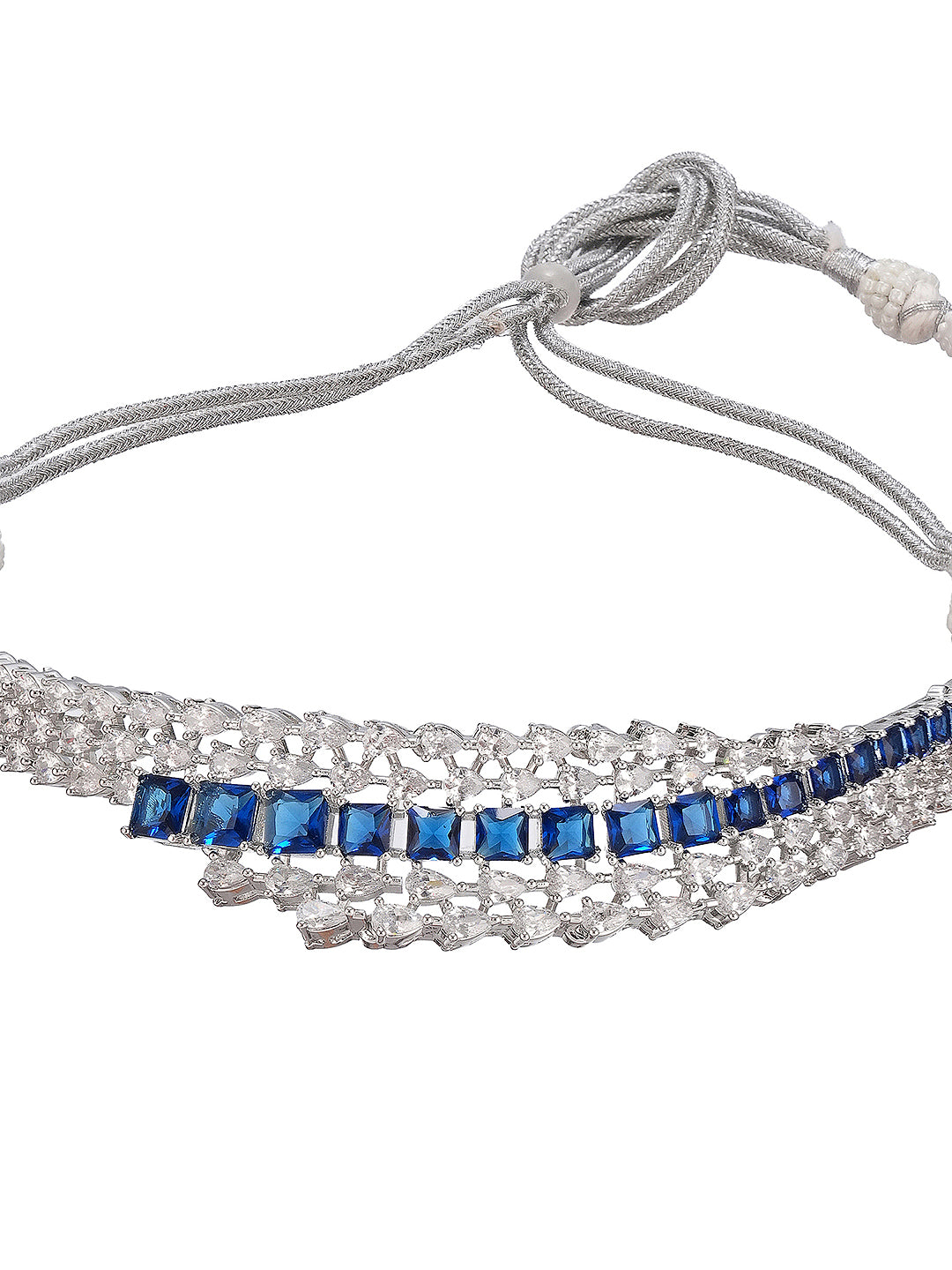 Featuring a striking choker design, it is adorned with sparkling sapphire-blue AD stones that create a vibrant, eye-catching appeal. The silver-toned finish adds a modern, sophisticated touch, making it perfect for parties, evening events, and festive occasions.