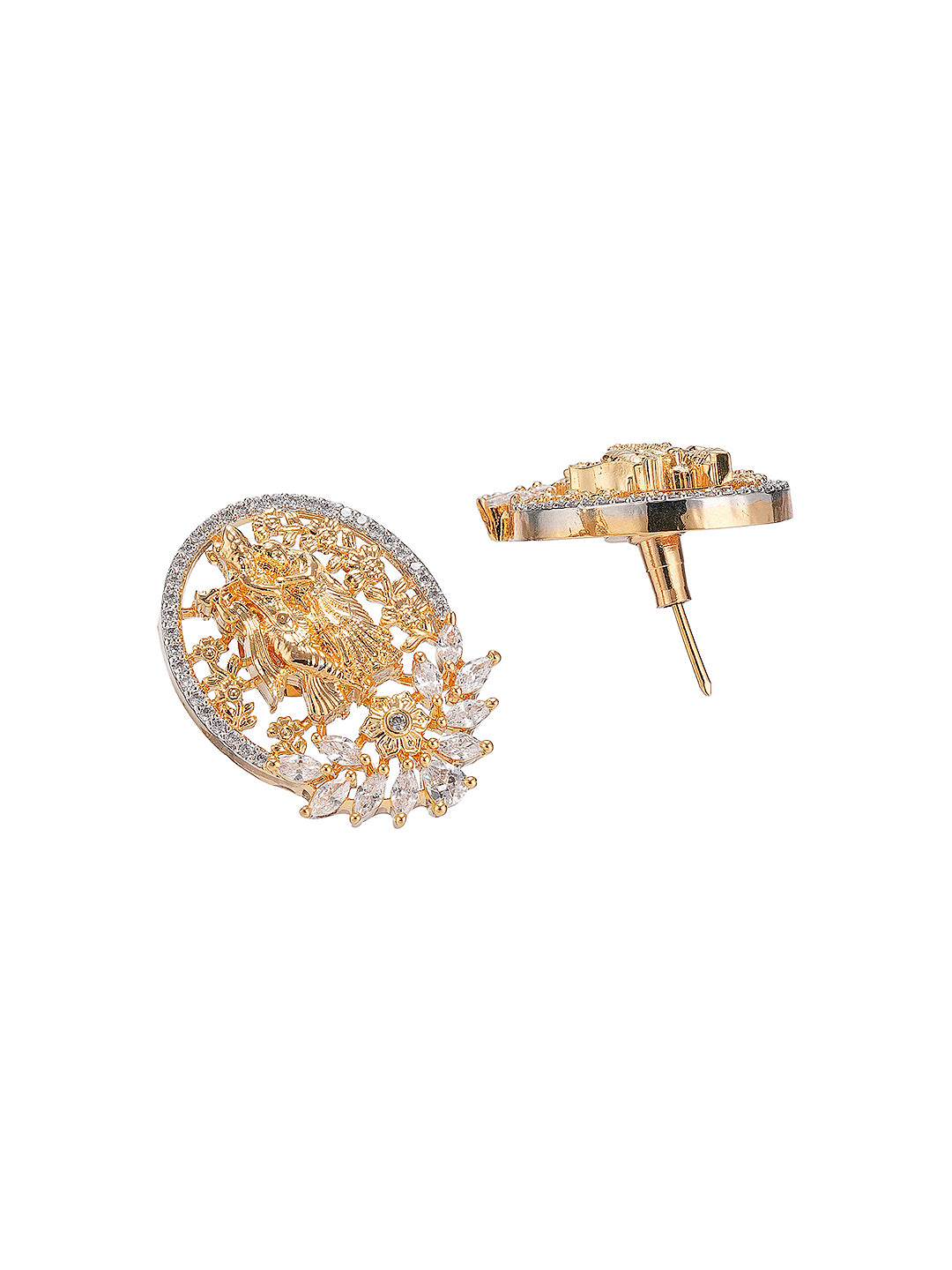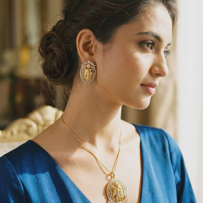 Designed with a graceful Lord Krishna temple motif, the pendant is adorned with sparkling AD zircon stones that add a subtle yet refined shine. The gold-plated finish enhances its traditional charm, making it perfect for daily wear, festive occasions, and spiritual gatherings. A pair of matching stud earrings, each secured with a post-and-back closure