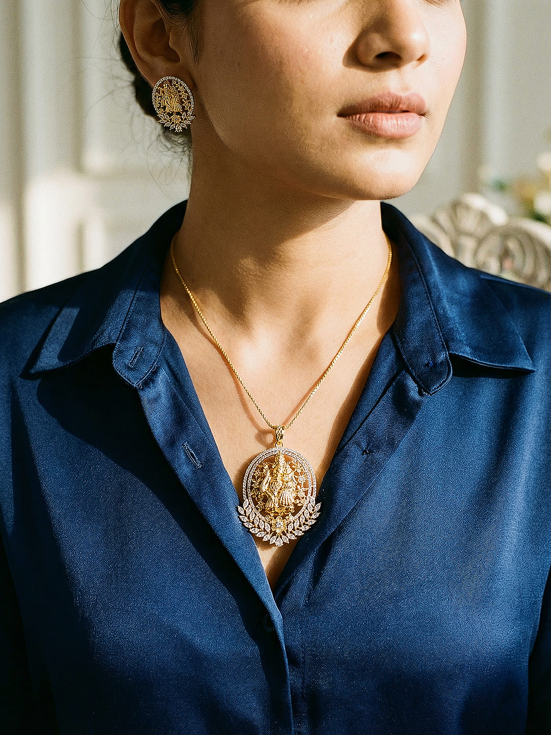 Product Type: Pendant Jewellery Set Design: Temple, Lord Krishna Motif Style: Minimal, Traditional Material: Brass Plating: Gold Plated Stone Type: AD Zircon Stone Color: White Pendant Type: Minimal Temple Pendant Necklace Type: Pendant Necklace Closure: Lobster Clasp Occasion: Festive, Traditional, Daily Wear Style Category: Ethnic, Devotional Package Contains: 1 Pendant Necklace, 1 Pair of Earrings
