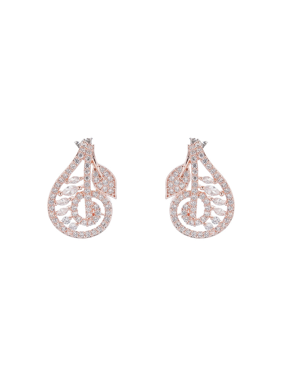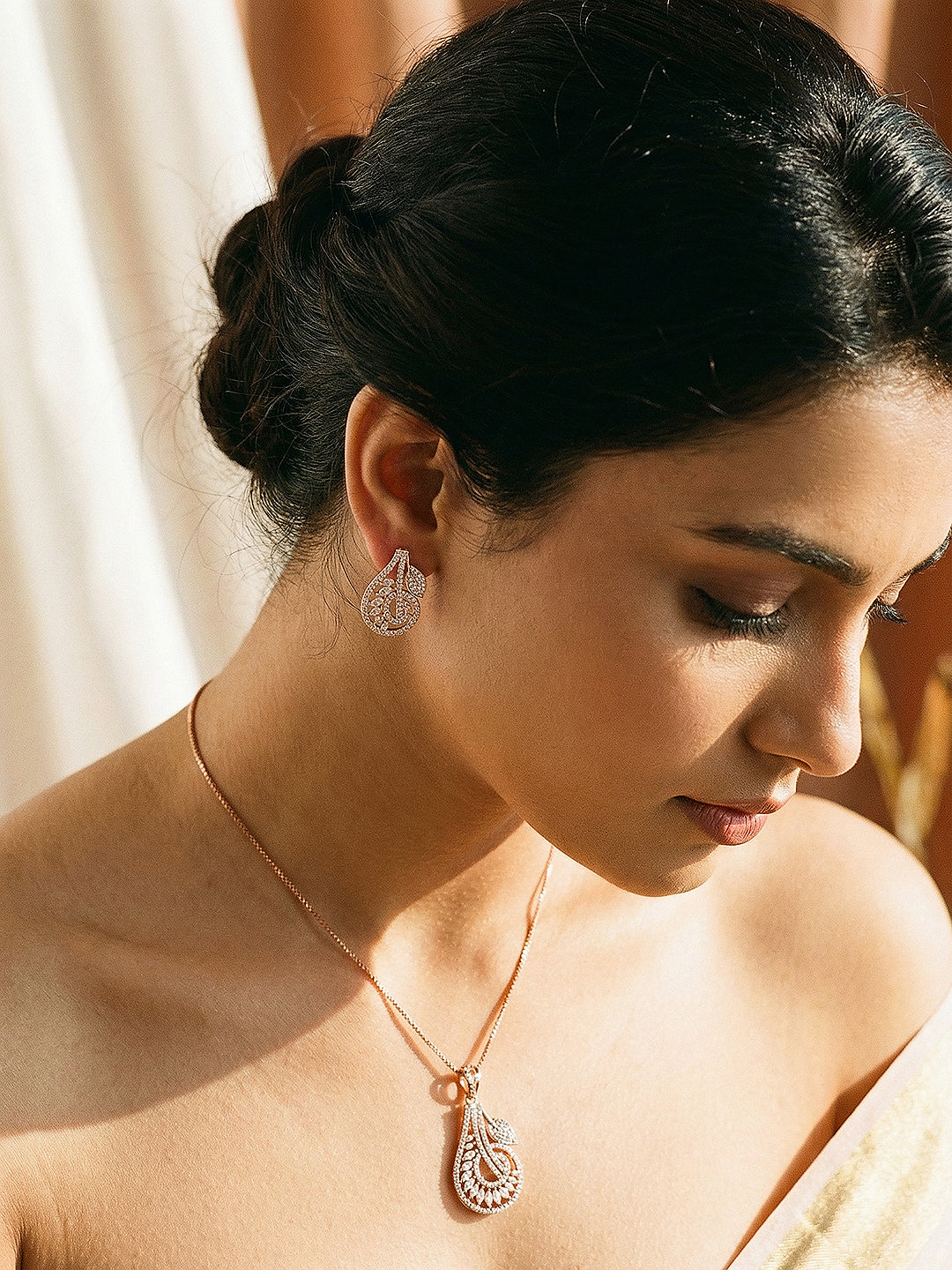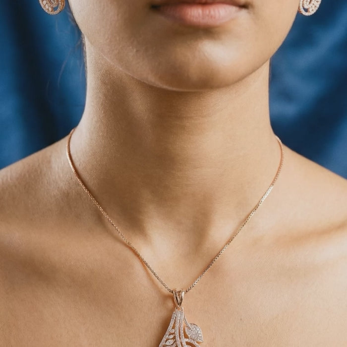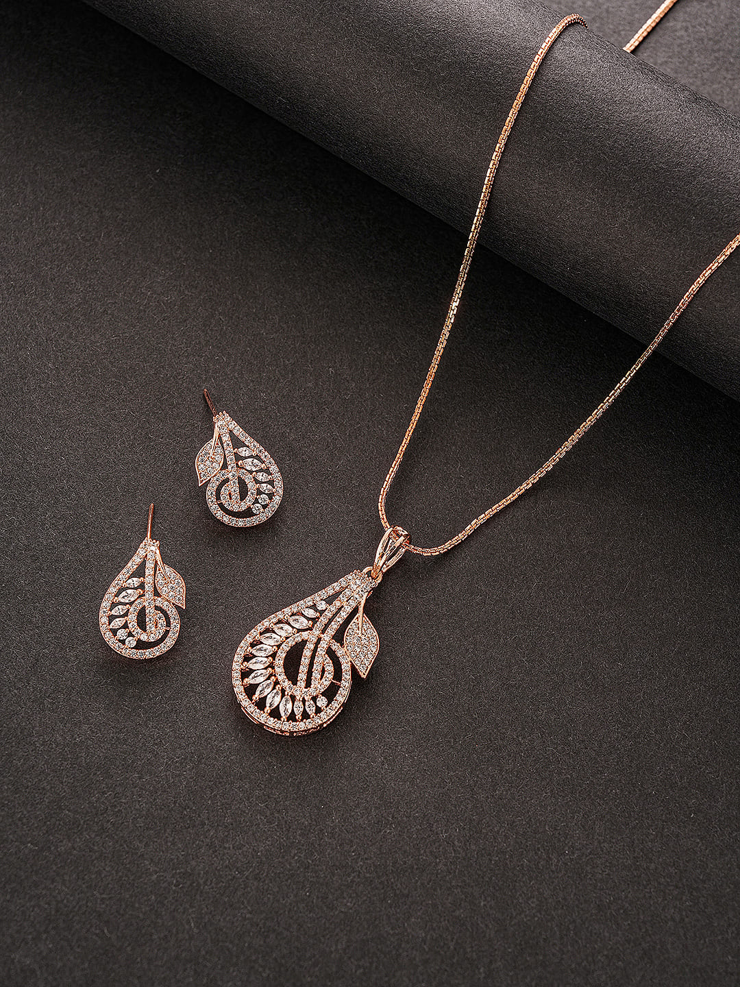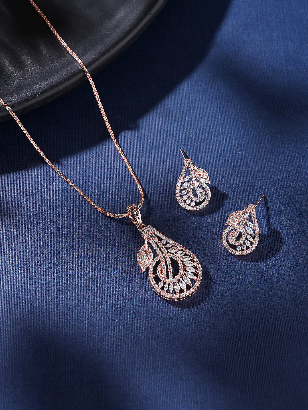 Rose Plated AD Zircon Studded Leafy Minimal Pendant Jewellery Set