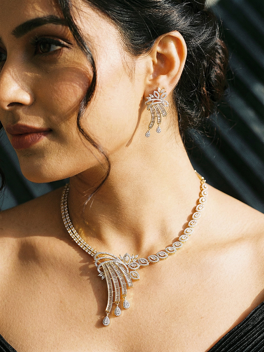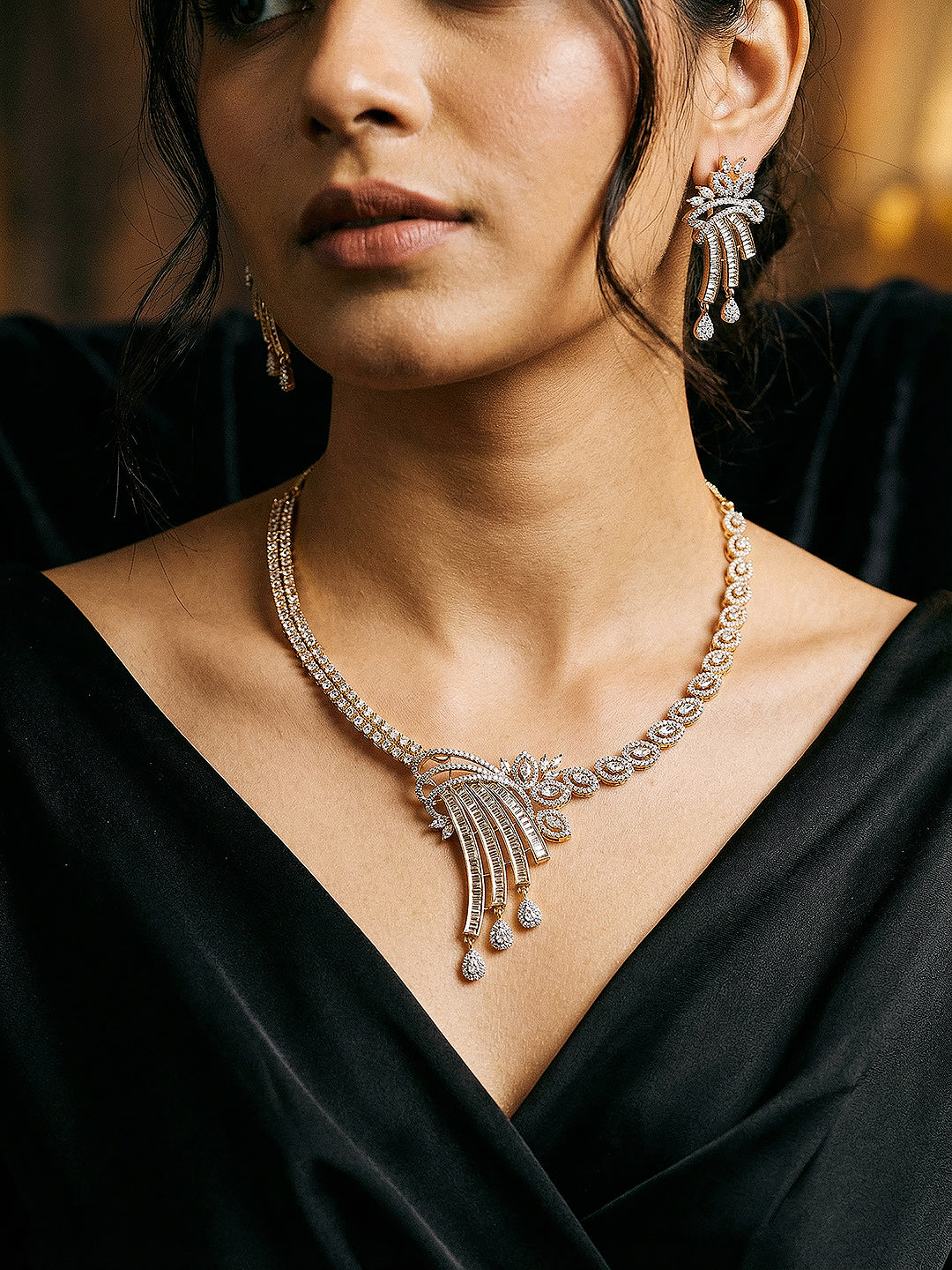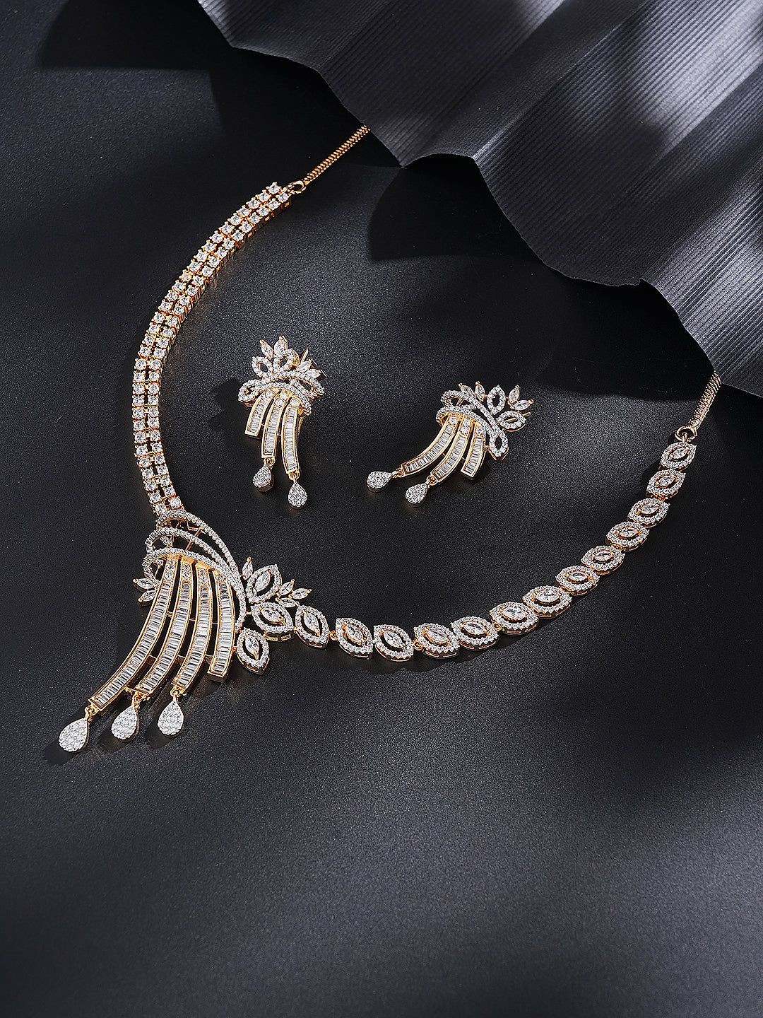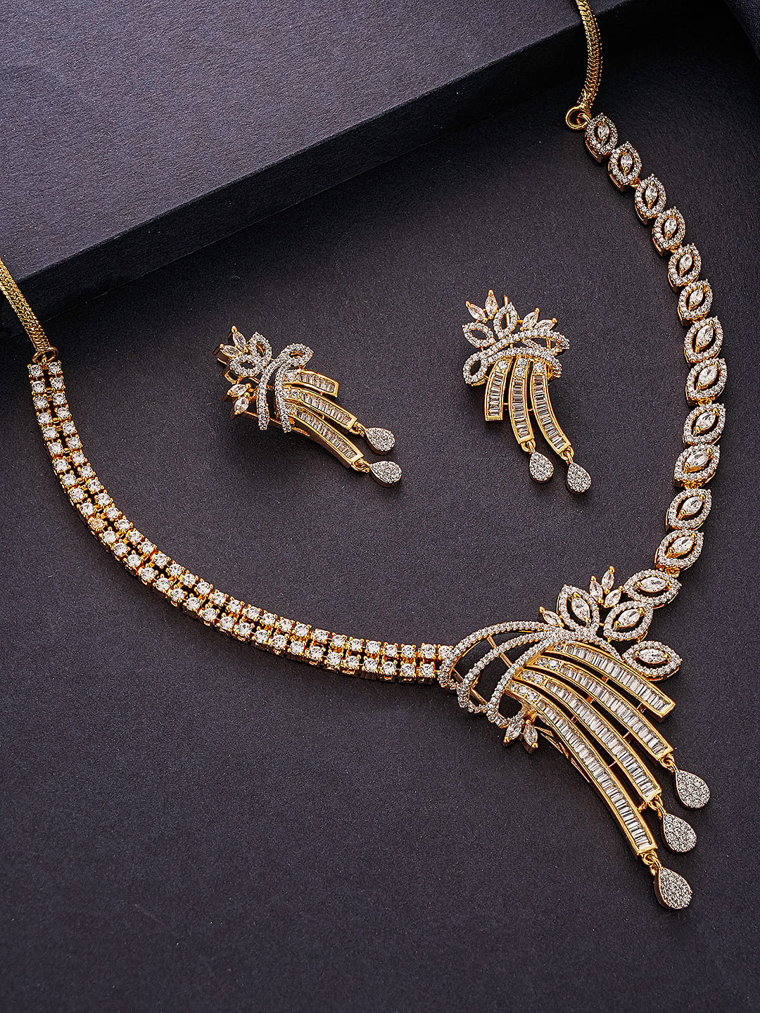 Product Type: Necklace Jewellery Set Style: Contemporary Material: Brass Plating: Gold Toned Stone Type: AD Zircon Stone Color: White Closure: Lobster Clasp Necklace Type: Statement Necklace Occasion: Festive, Party, Wedding Package Contains: 1 Necklace, 1 Pair of Earrings