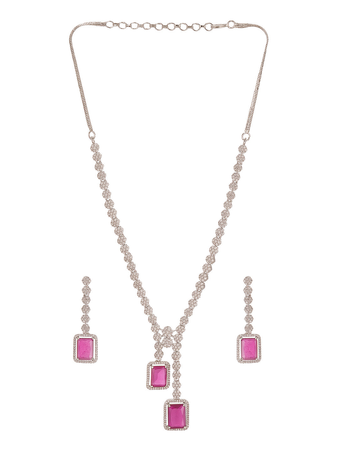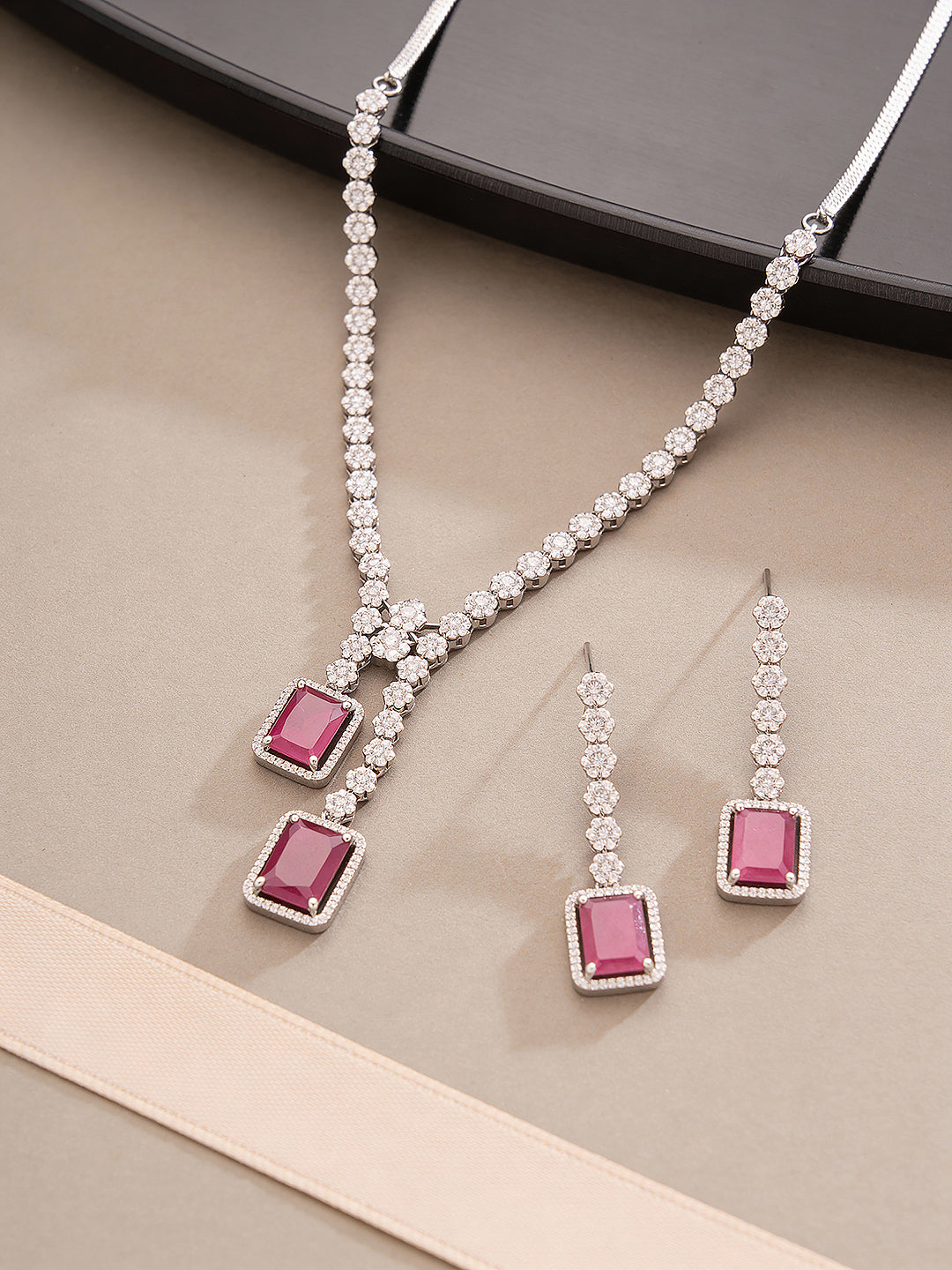 Product Type: Cocktail Jewellery Set Design: Statement Material: Brass Plating : Silver Toned Stone Type: AD (American Diamond) Zircon Stone Color: Ruby Red Necklace Type: Dangling Statement Necklace Earrings Type: Matching Dangling Earrings Closure: Lobster Clasp Occasion: Party, Cocktail, Evening, Festive Style: Contemporary, Glam, Statement Package Contains: 1 Necklace, 1 Pair of Earrings