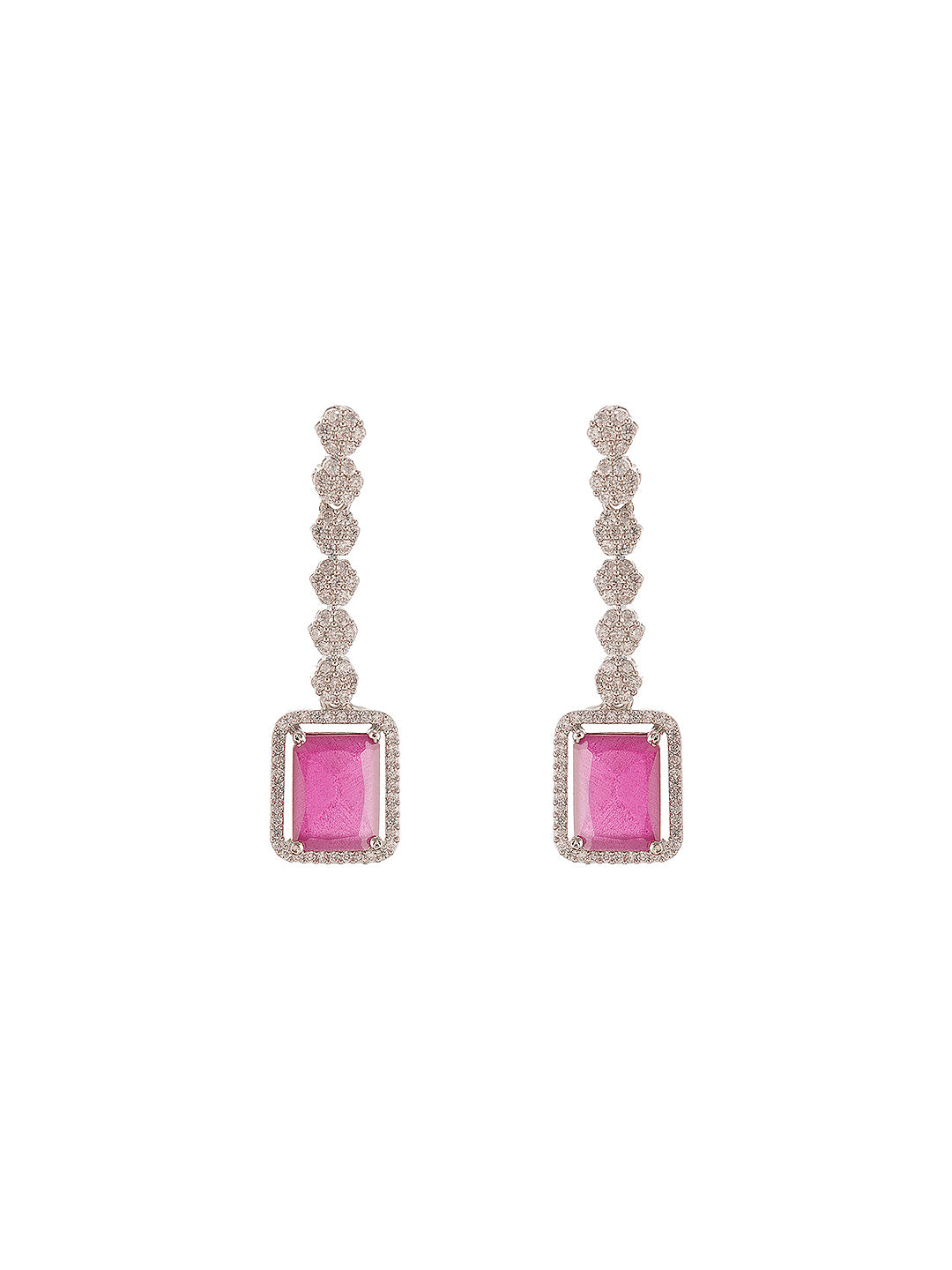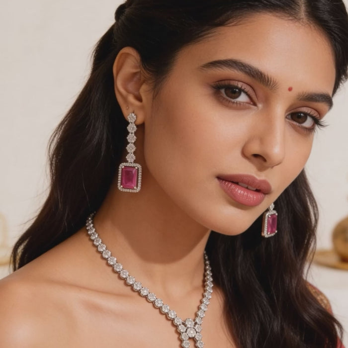 Designed with graceful dangling elements, the necklace is embellished with sparkling ruby red AD zircon stones that create a rich and glamorous appeal. The polished silver-toned finish enhances its modern charm, making it perfect for cocktail parties, evening events, and festive celebrations.