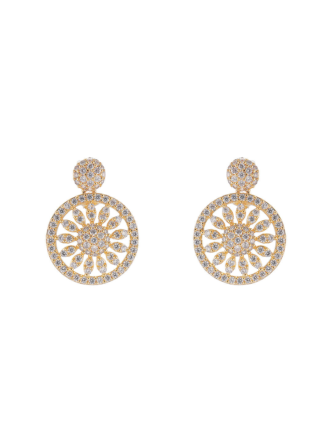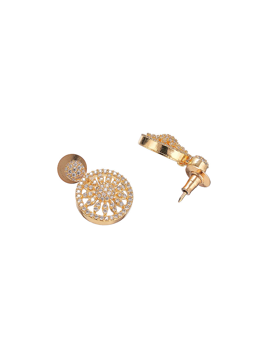 Featuring a beautifully handcrafted gold-toned chain and pendant adorned with sparkling white AD zircon stones, this set exudes timeless elegance and artisanal charm. The matching earrings complete the ensemble, making it perfect for weddings, engagements, festive occasions, or daily ethnic wear.
